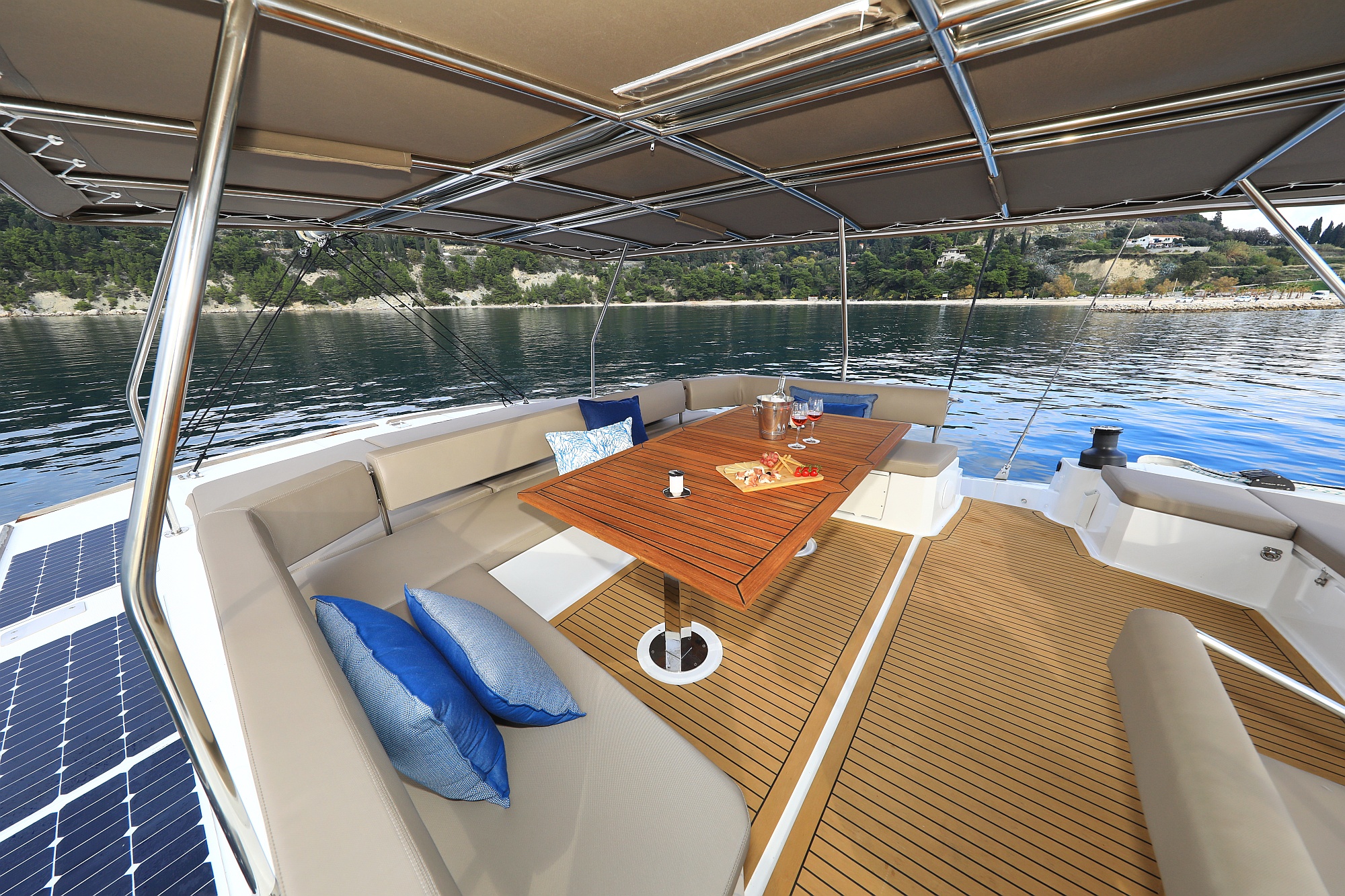 | Outside | Biminitop, Cockpitdusche, Cockpitlautsprecher, Cockpitpolster, Deckpolster, Flybridge, Flybridge mit Bimini und Kühlschrank, Grill, Solaranlage, Teak auf Badeplattform, Teak im Cockpit, Unterwasserbeleuchtung |
