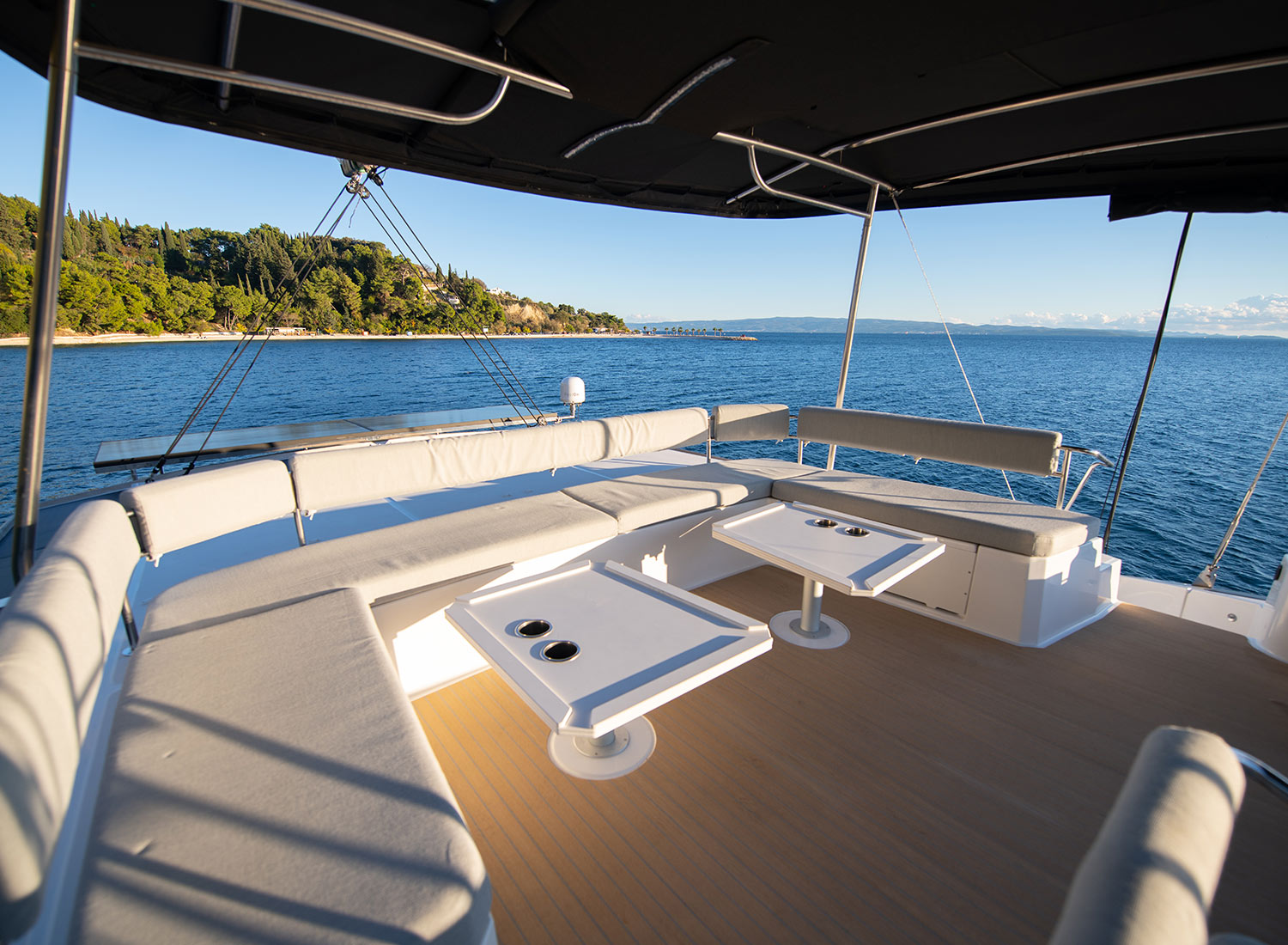 | Outside | Biminitop, Cockpitdusche, Cockpitlautsprecher, Cockpitpolster, Flybridge, Grill, HiFi Lautsprecher auf Flybridge, Solaranlage, Teak im Cockpit, Unterwasserbeleuchtung |