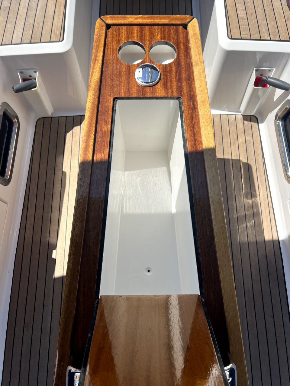 | Outside | 220 V-Landanschluss, Anker mit Kette, Badeplattform, Benzinkanister, Biminitop, Cockpitdusche, Cockpitlautsprecher, Cockpitpolster, Cockpittisch, Fender, Festmacherleinen, Gangway, Sprayhood, Teak im Cockpit |