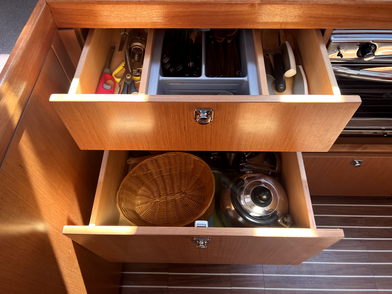 | Safety | Autopilot, Bordapotheke, Bordwerkzeug, Bugstrahlruder, Feststoffschwimmwesten, Feueraxt, Feuerlöscher, Lifebelts, Notpinne, Notsignale, Rettungskragen, Taschenlampe, UKW-Funk, Zweitanker |