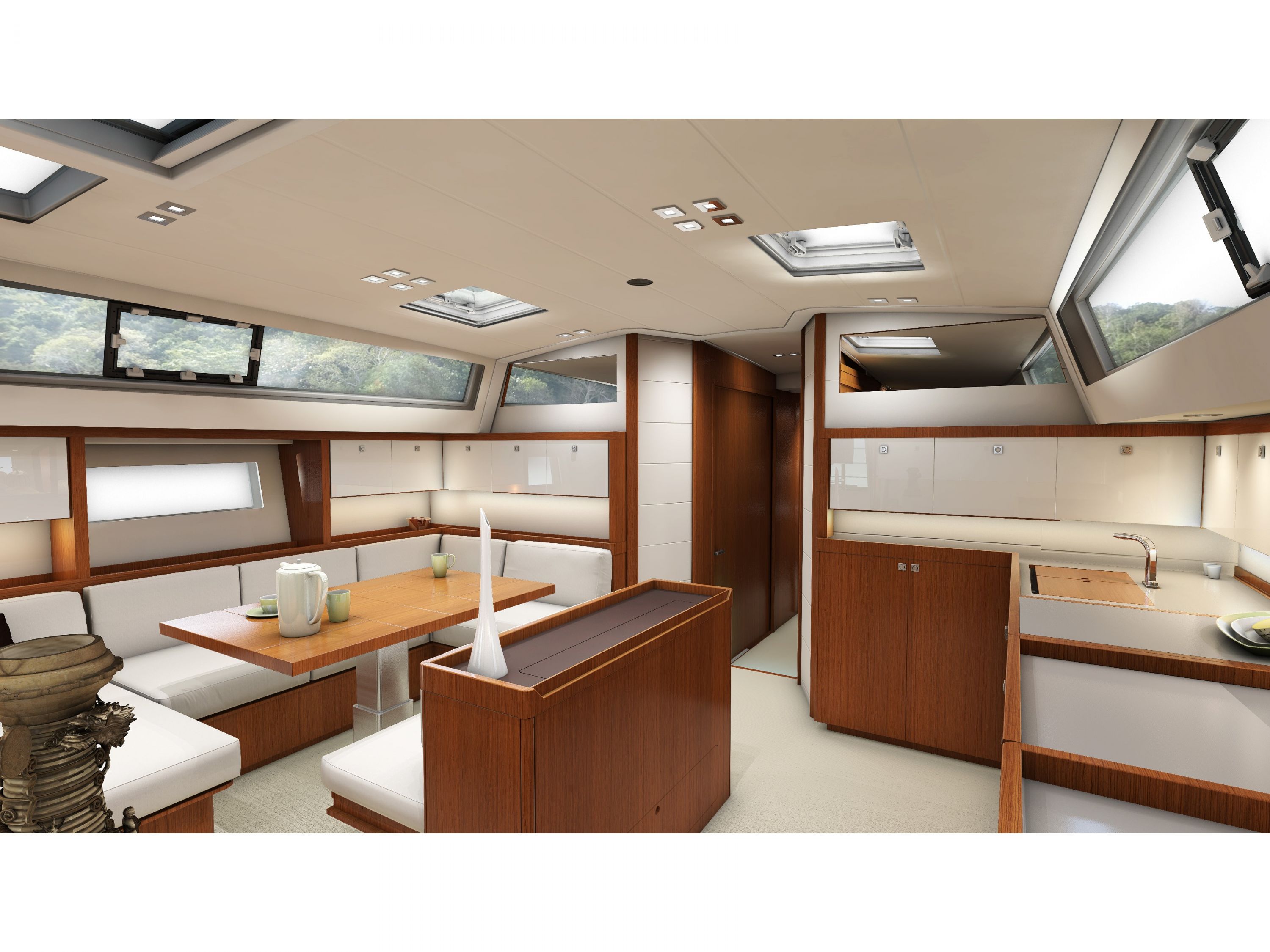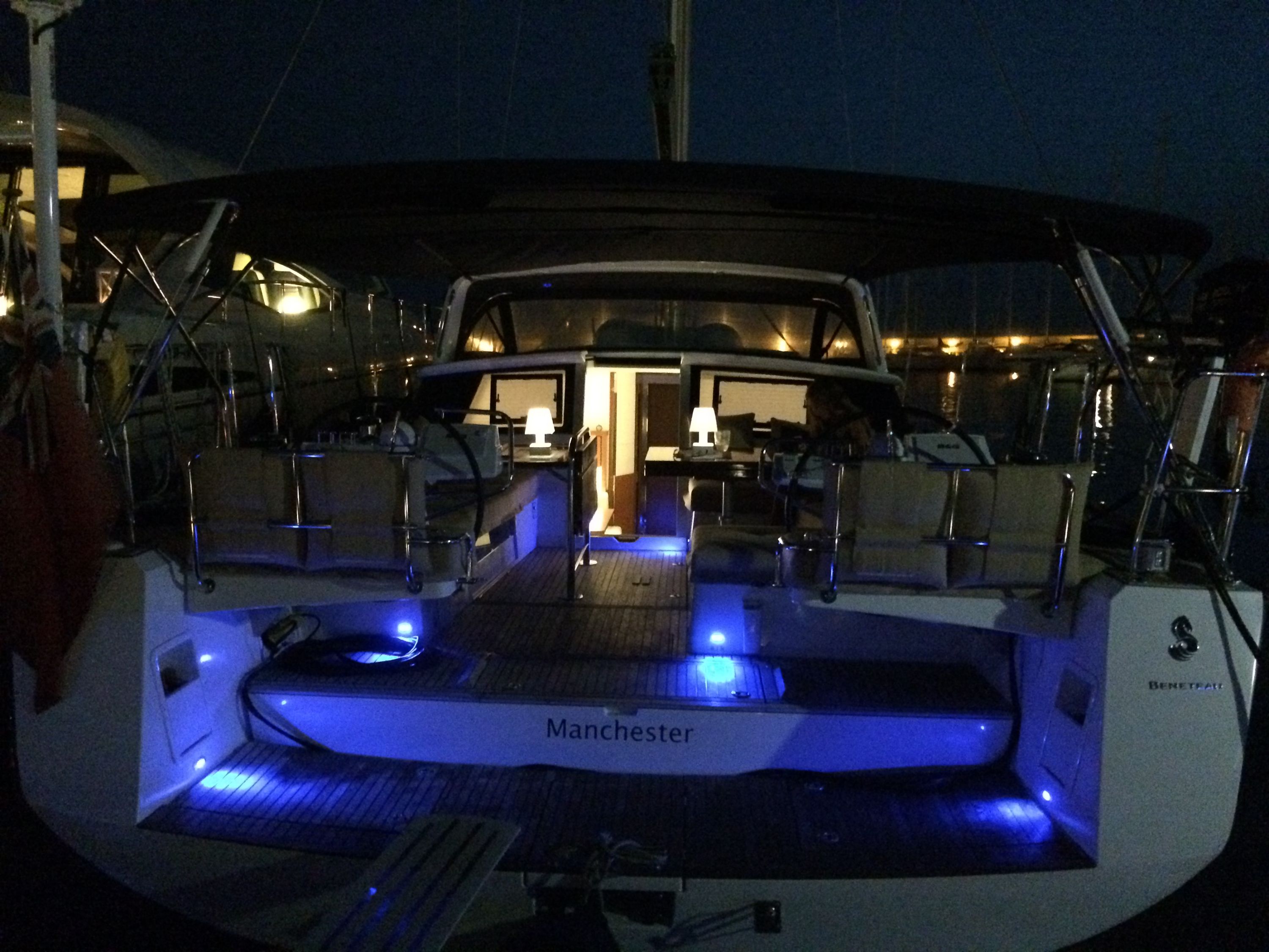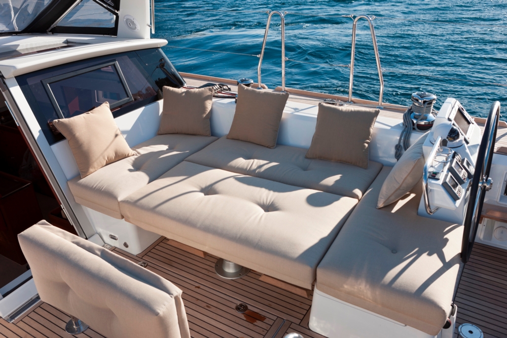 | Outside | Anker mit Kette, Badeleiter, Badeplattform, Biminitop, Cockpitdusche warm/kalt, Cockpitkühlschrank, Cockpitlautsprecher, Cockpitpolster, elektr. Ankerwinsch, elektr. Genuawinsch, elektr. Großwinsch, Heckdusche, Sonnensegel, Sprayhood, Teakdeck |