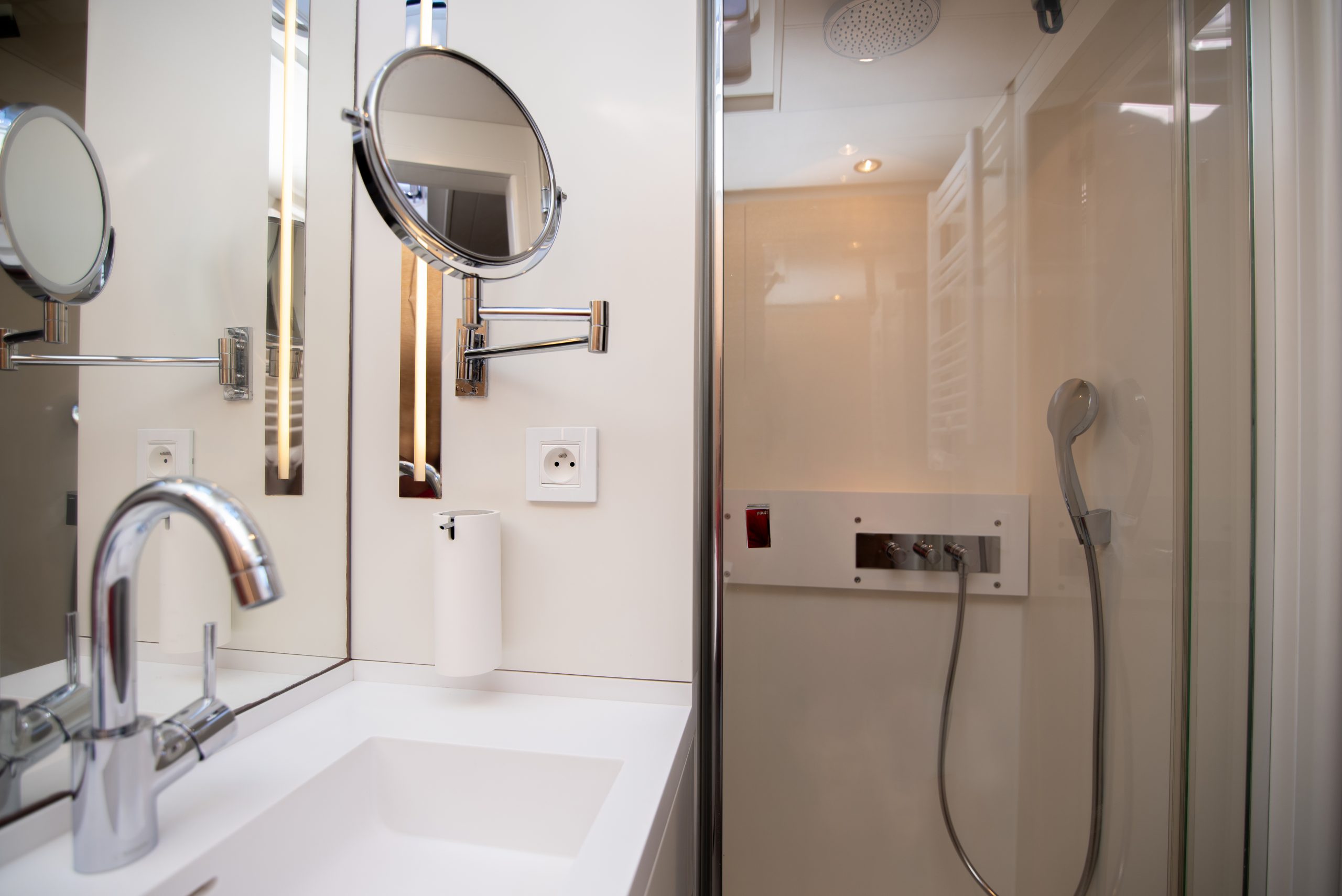 | Inside | 220V Steckdosen, Bügeleisen, Eiswürfelmaschine, Entsafter, Fön, Gasherd mit Backofen, Generator, Geschirrspüler, Heizung, Inverter 12V/220V, Kaffeemaschine, Klimaanlage (ohne Landstrombedarf), Ladegerät, Mikrowelle, Mixer, Trockner, Waschmaschine, Wasserkocher, Watermaker |