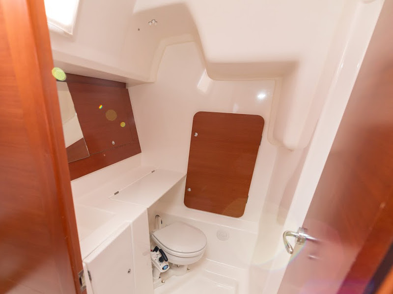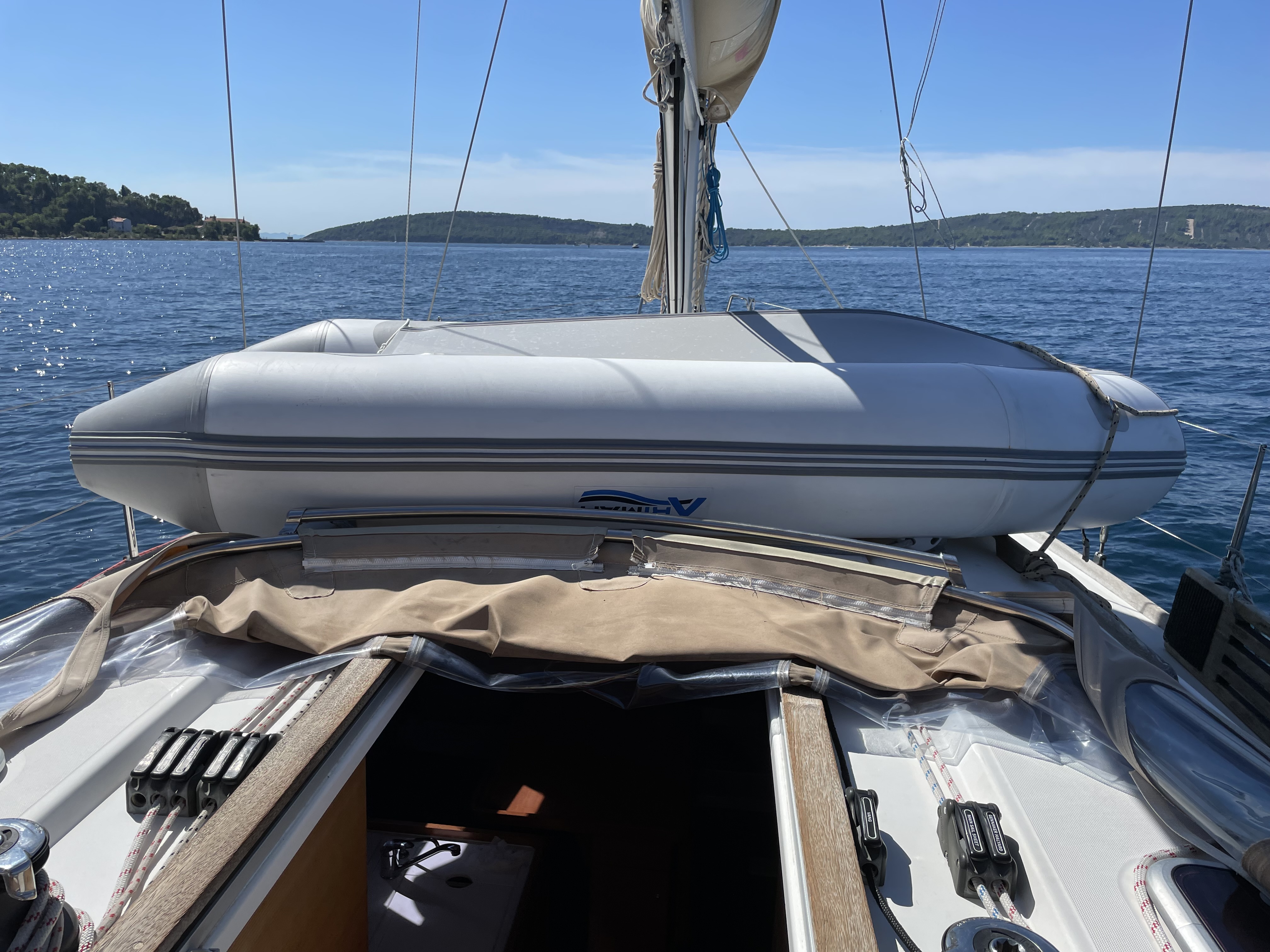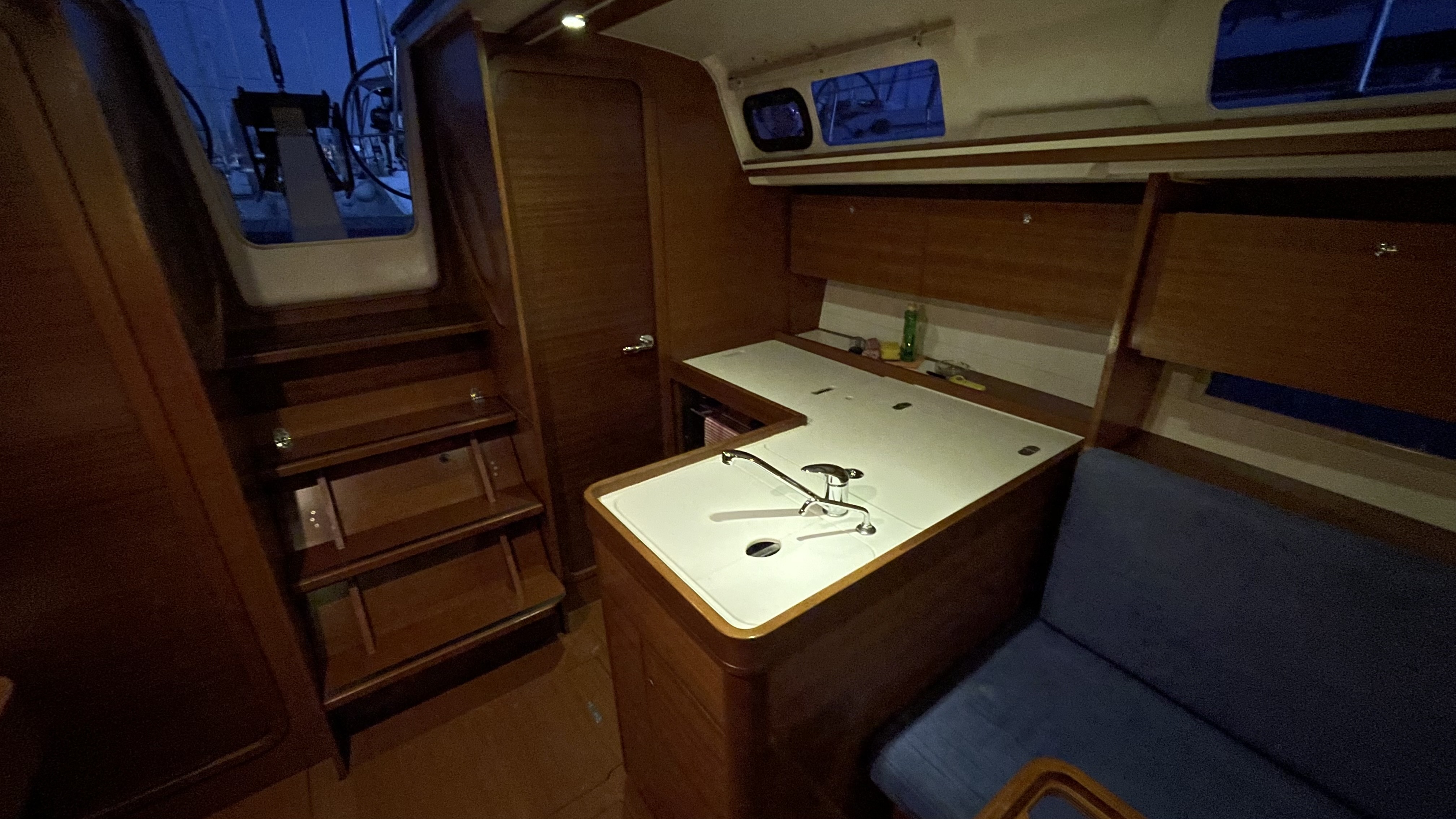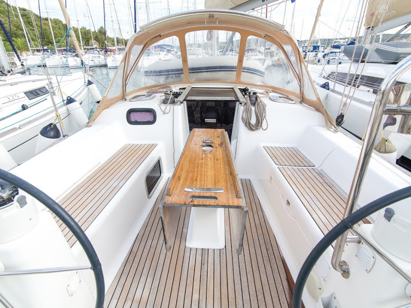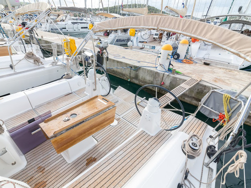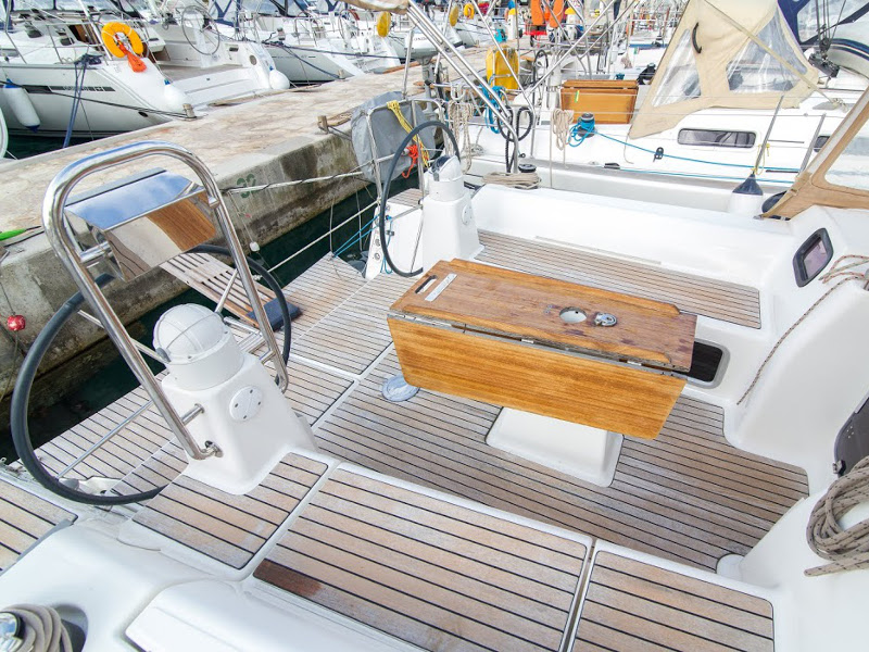 | Outside | 220 V-Landanschluss, Anker mit Kette, Badeplattform, Biminitop, Cockpitdusche, Cockpitlautsprecher, Cockpitpolster, Cockpittisch, Sprayhood, Teak im Cockpit, Windex |