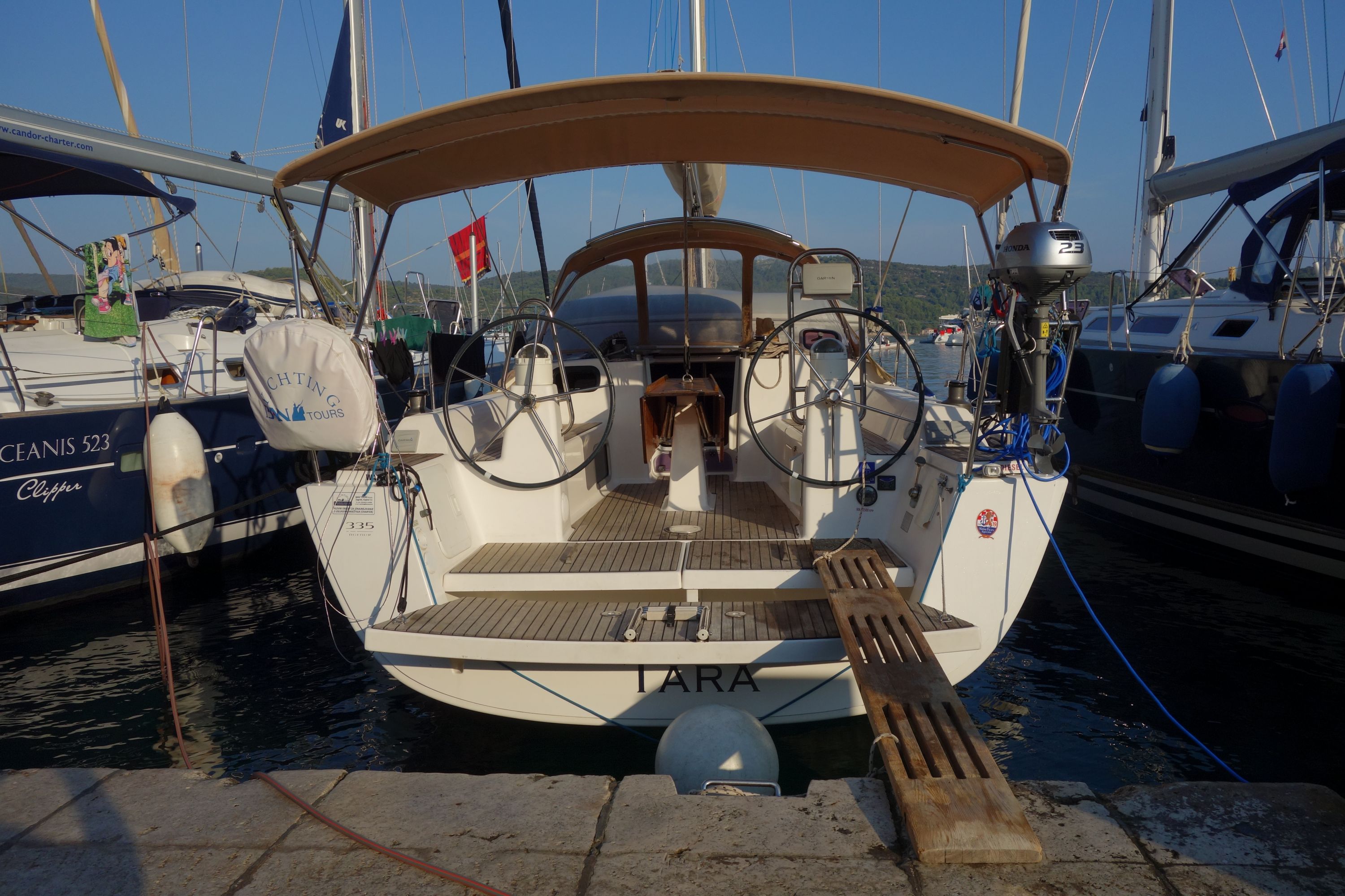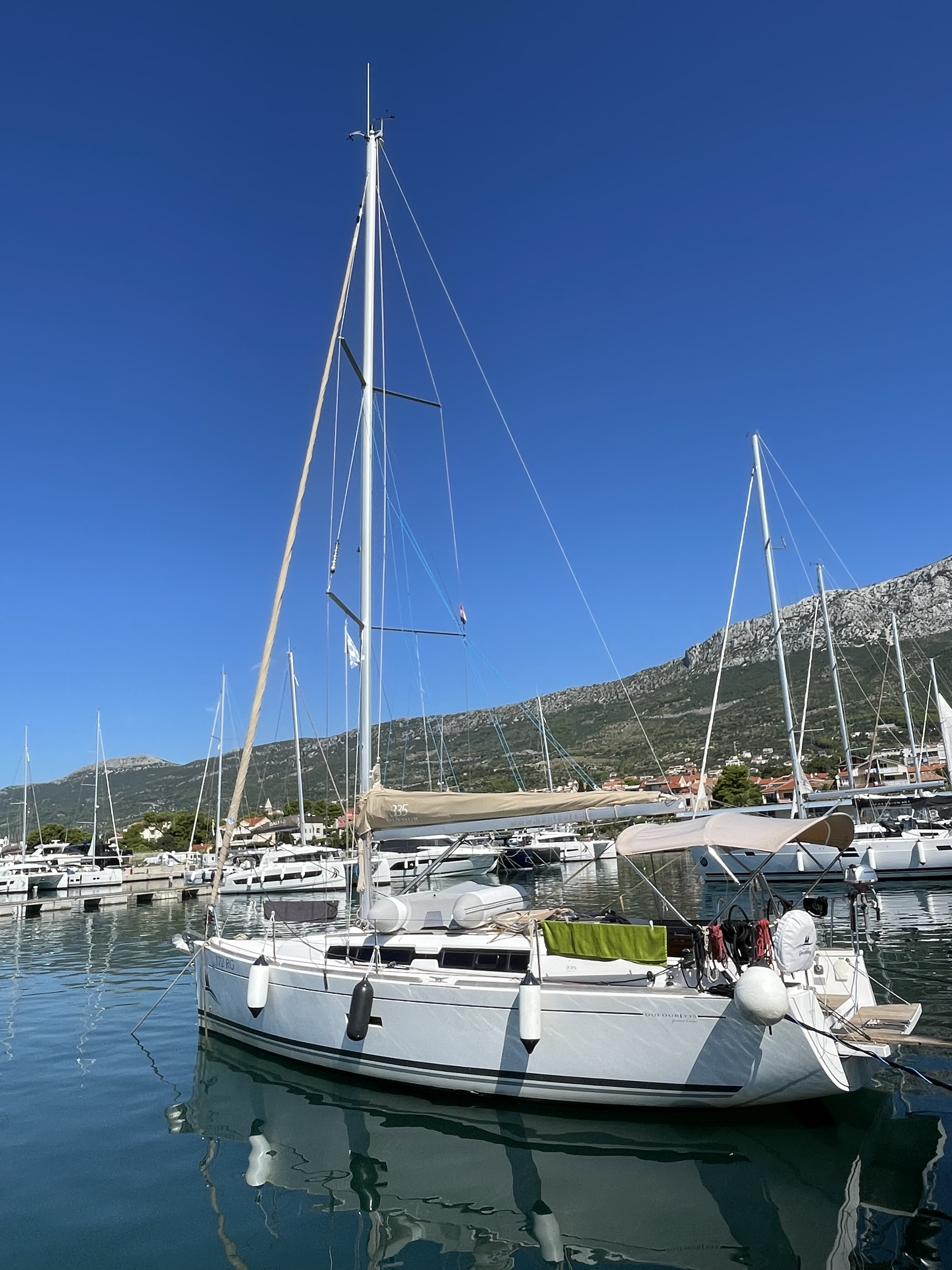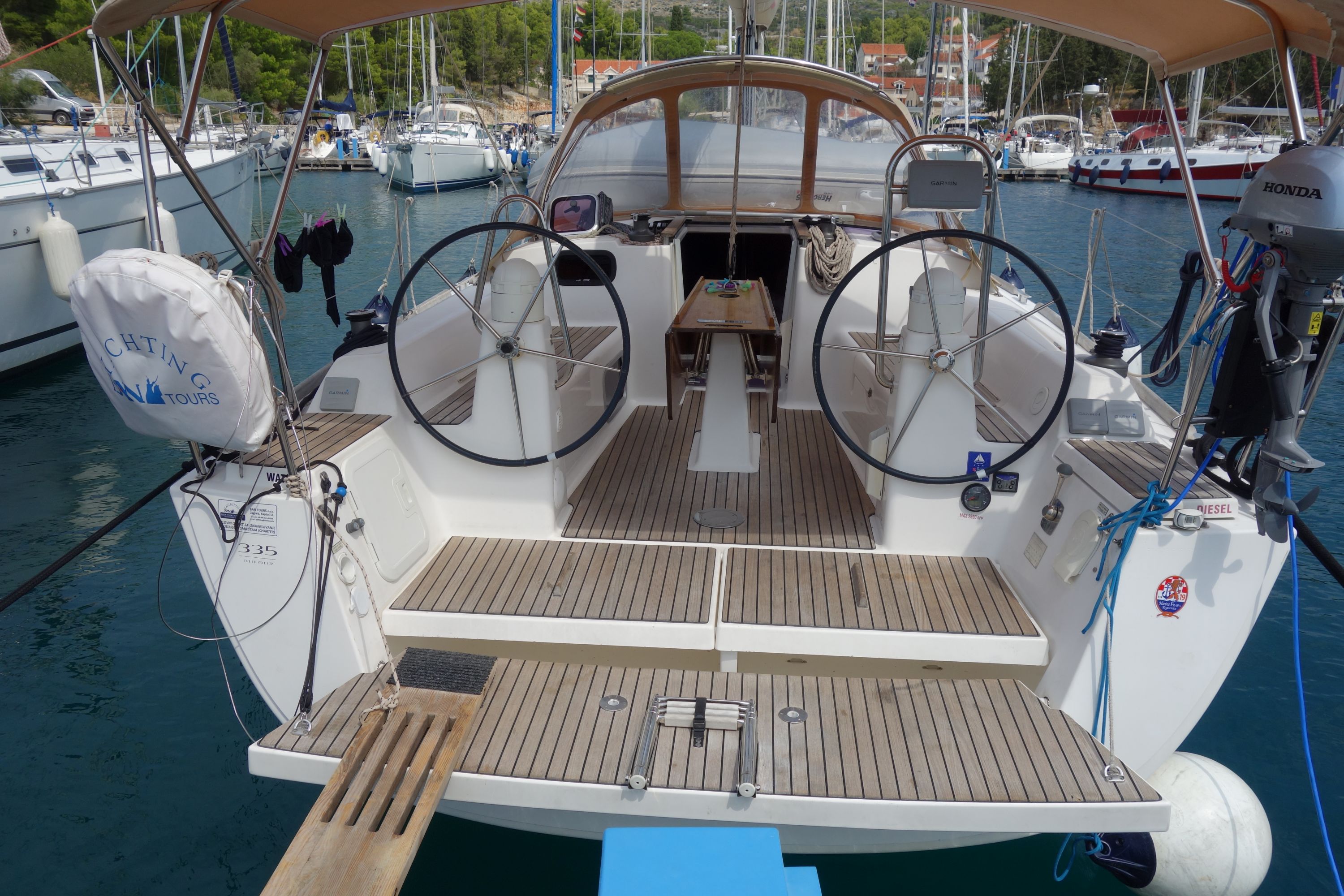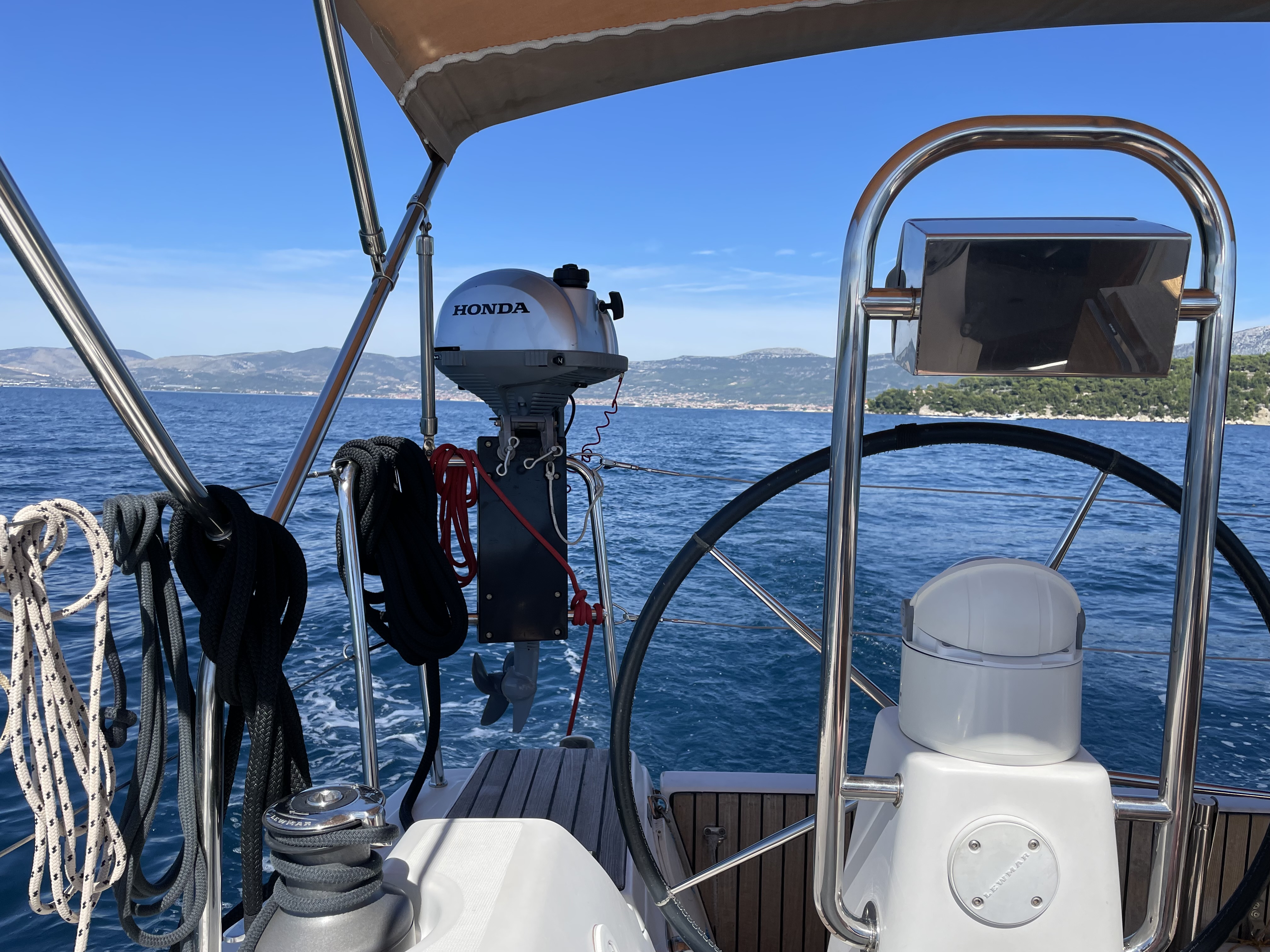 | Outside | 220 V-Landanschluss, Anker mit Kette, Badeplattform, Biminitop, Cockpitdusche, Cockpitlautsprecher, Cockpitpolster, Cockpittisch, Sprayhood, Teak im Cockpit, Windex |