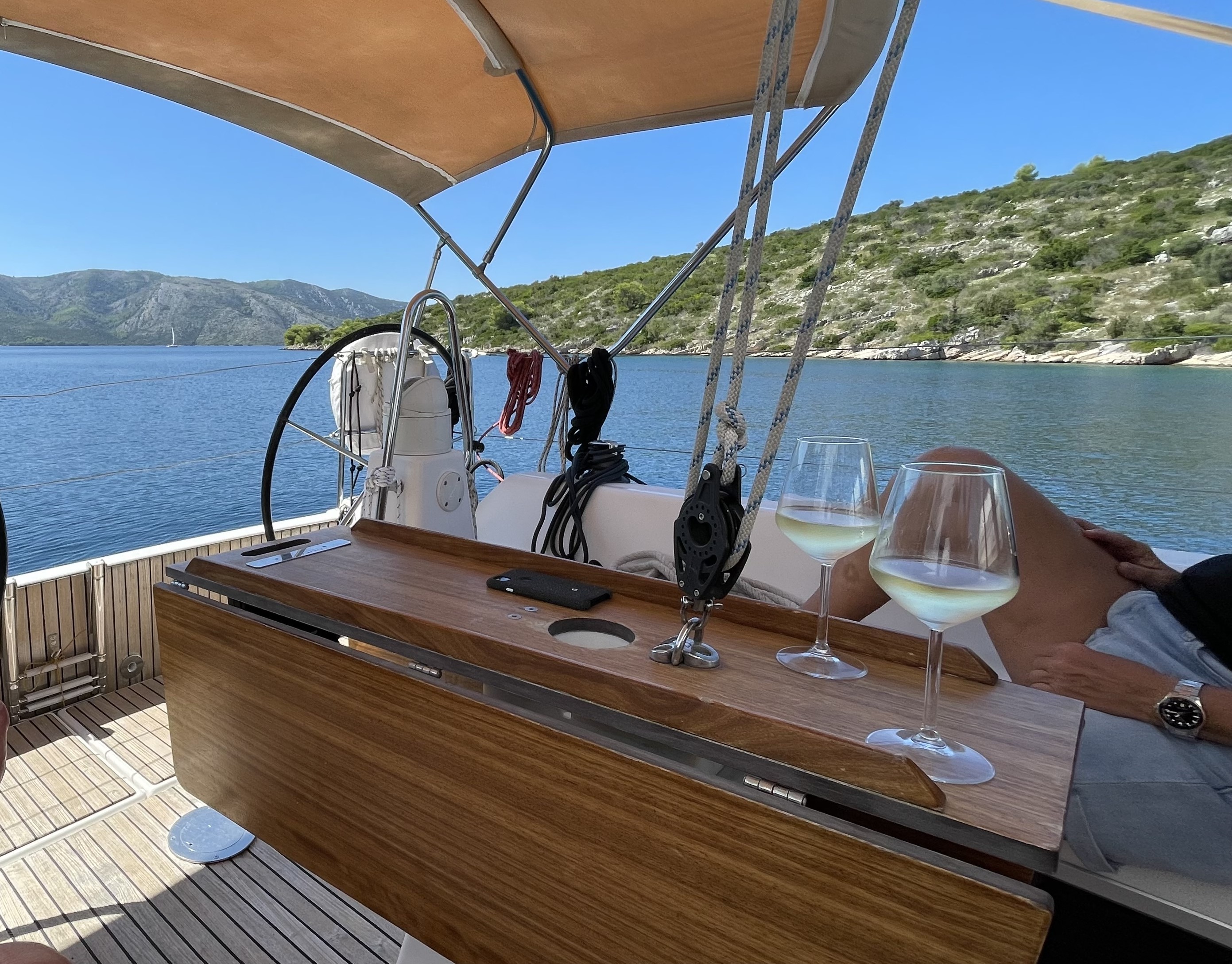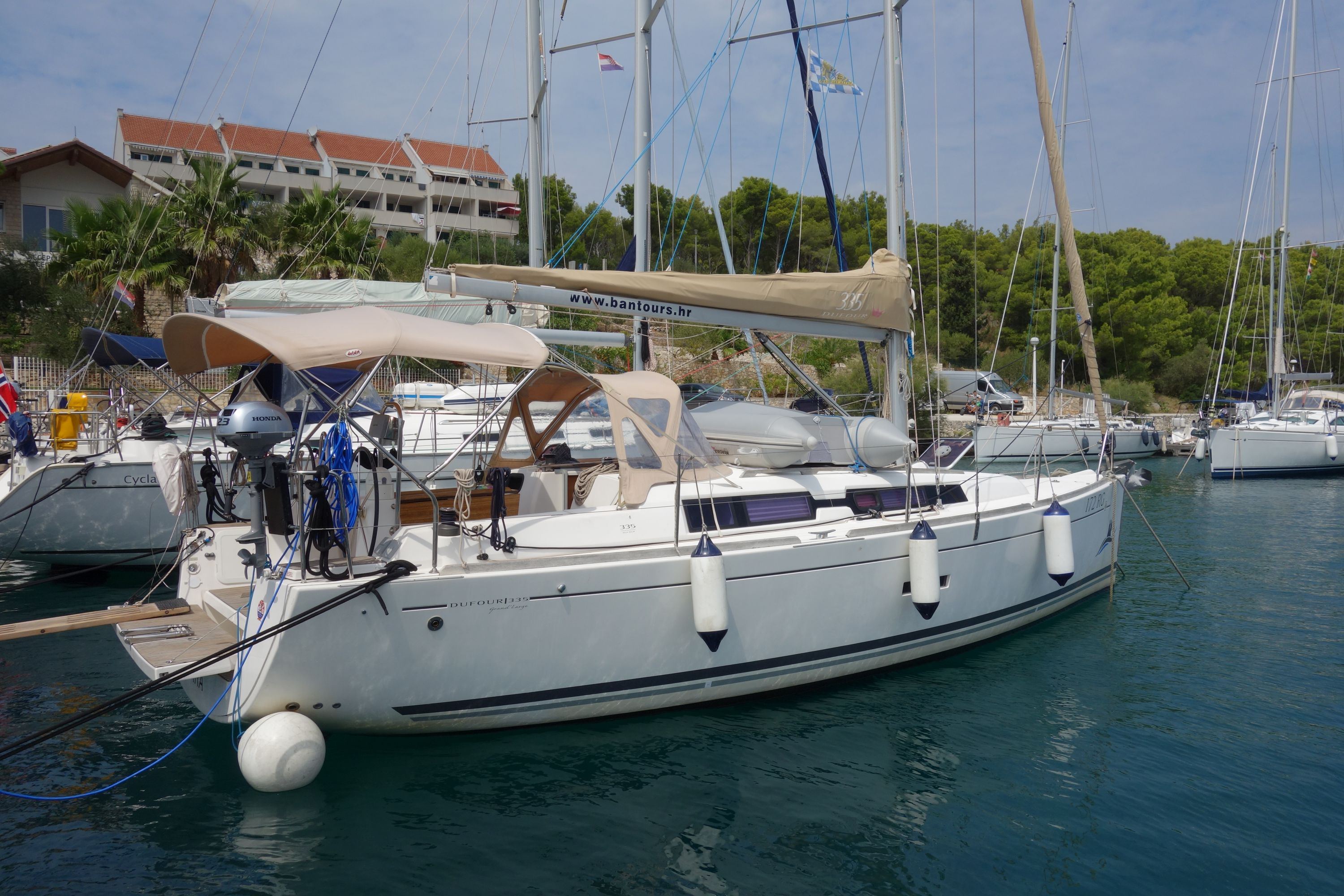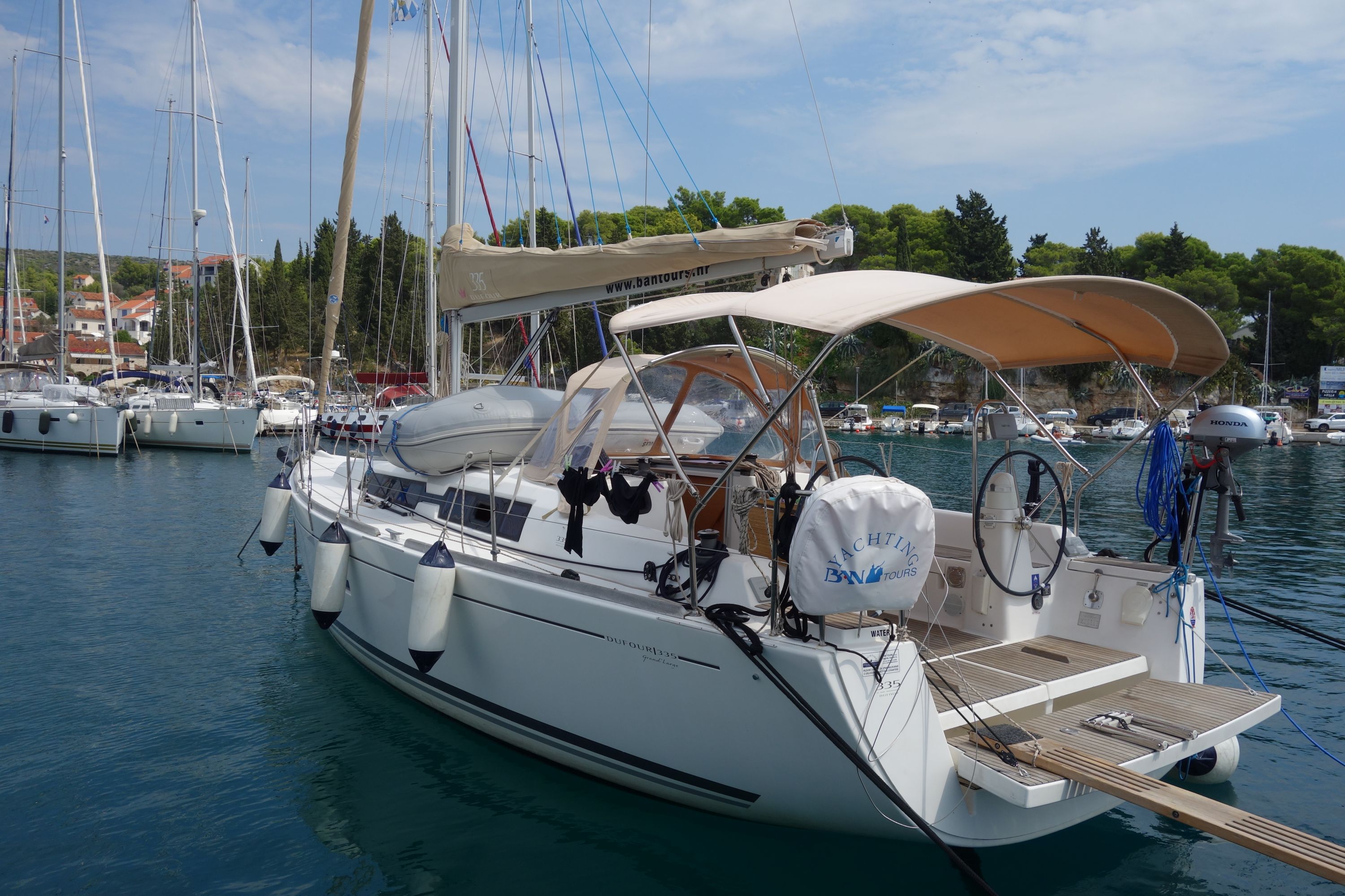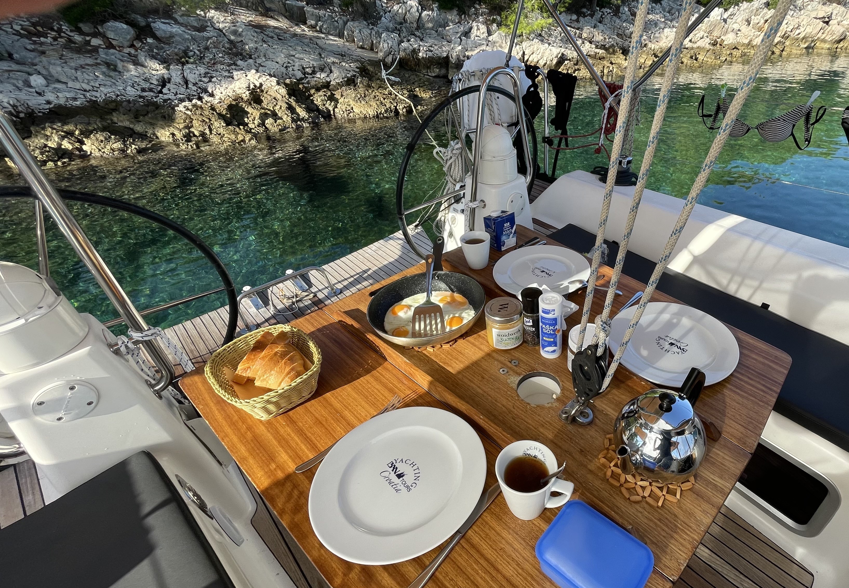 | Outside | 220 V-Landanschluss, Anker mit Kette, Badeplattform, Biminitop, Cockpitdusche, Cockpitlautsprecher, Cockpitpolster, Cockpittisch, Sprayhood, Teak im Cockpit, Windex |