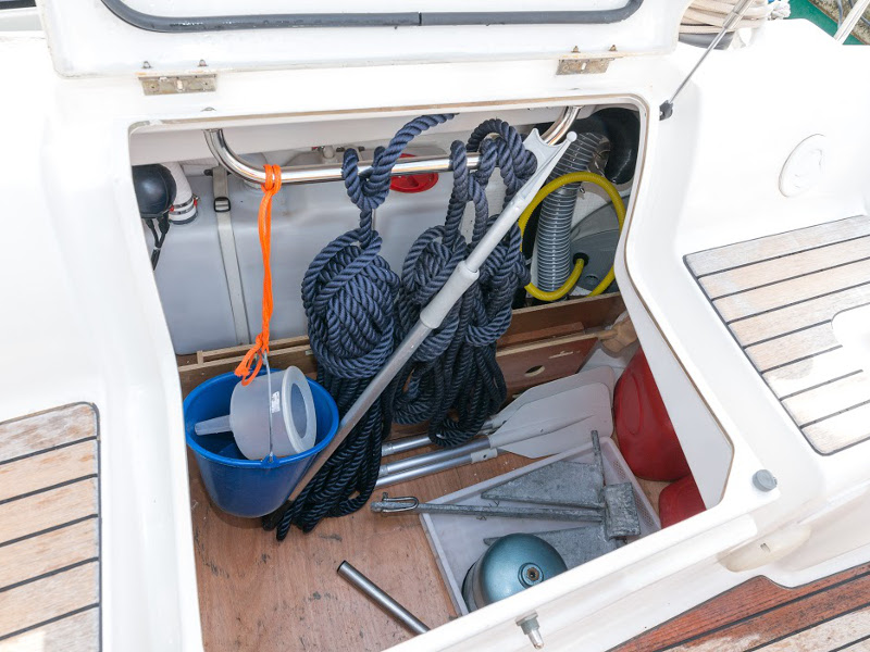 | Safety | Autopilot, Bordapotheke, Feststoffschwimmwesten, Feuerlöscher, Notpinne, Notsignale, Sicherheitsgurt, UKW-Funk, Zweitanker |