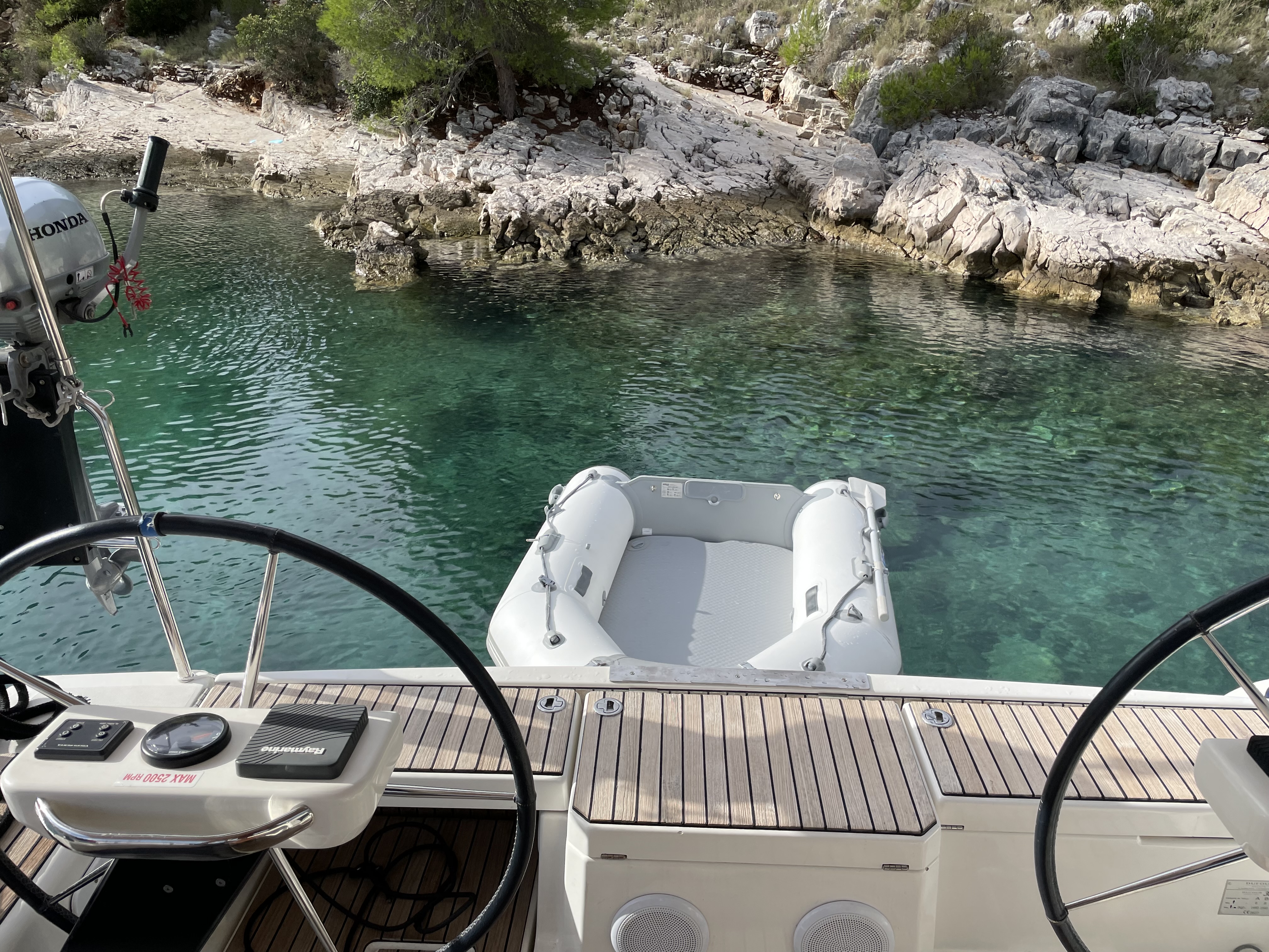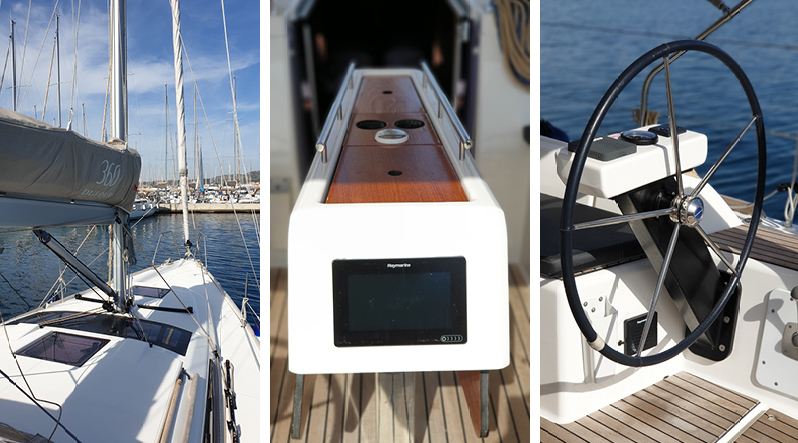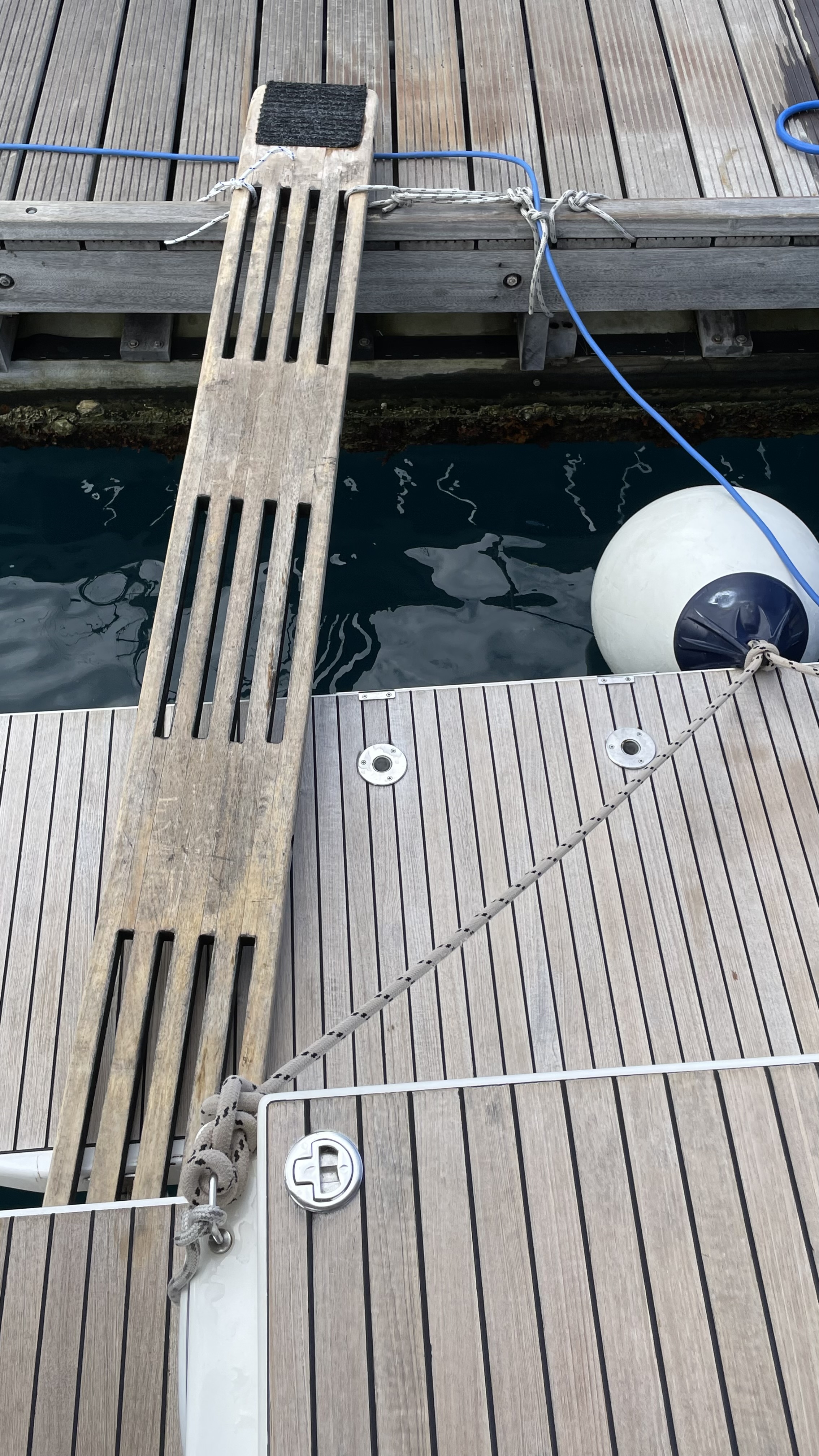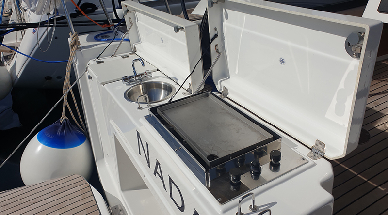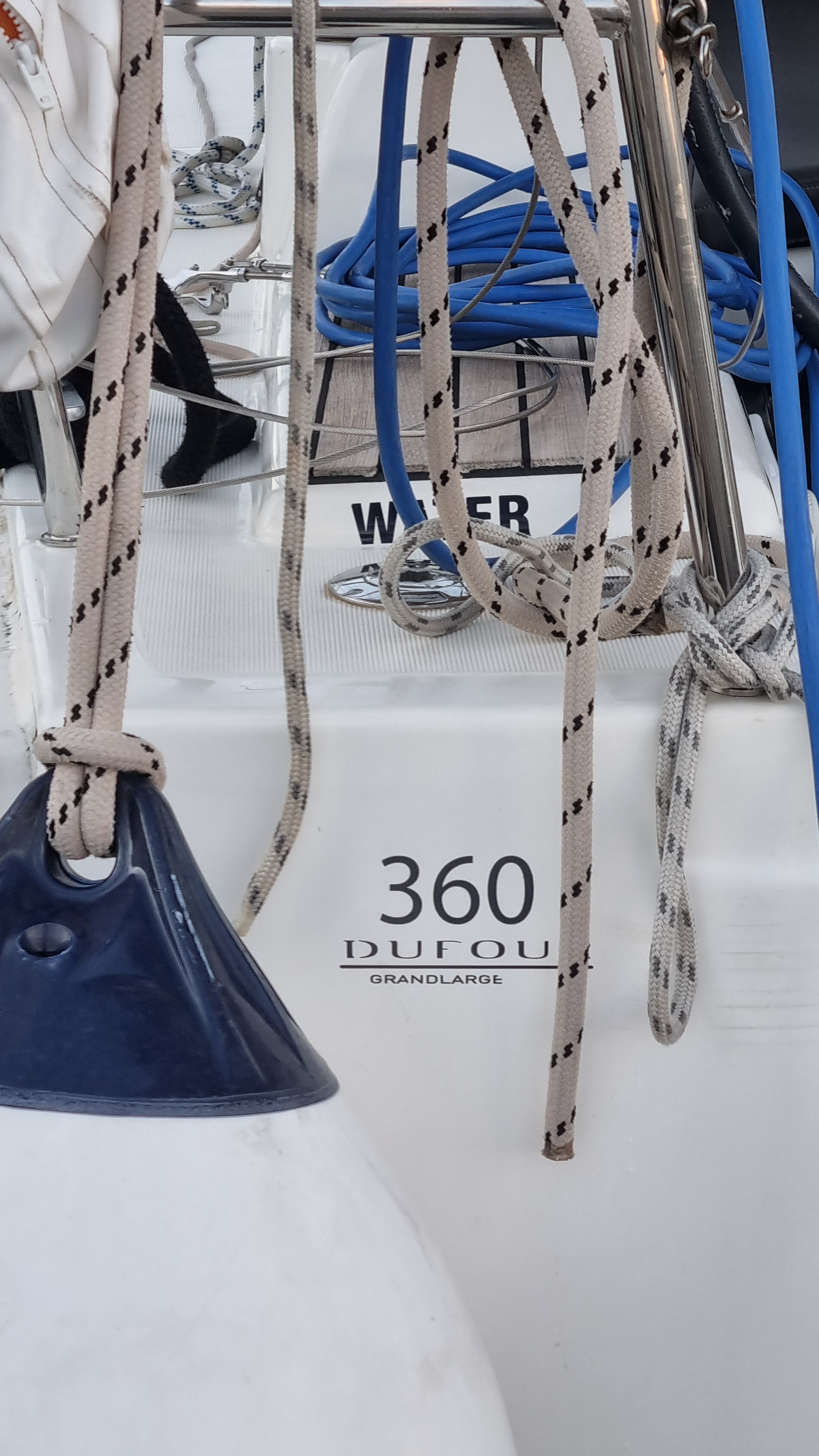 | Outside | 220 V-Landanschluss, Anker mit Kette, Badeplattform, Benzinkanister, Biminitop, Bootshaken, Cockpitdusche, Cockpitlautsprecher, Cockpitpolster, Cockpittisch, Deckbürste, Dieselkanister , elektr. Ankerwinsch, Fender, Festmacherleinen, Gangway, Grill, Kugelfender, Solaranlage, Sprayhood, Spülbecken im Cockpit, Teak auf Badeplattform, Teak im Cockpit, Wasserkanister , Wasserschlauch, Windex, Winschen |