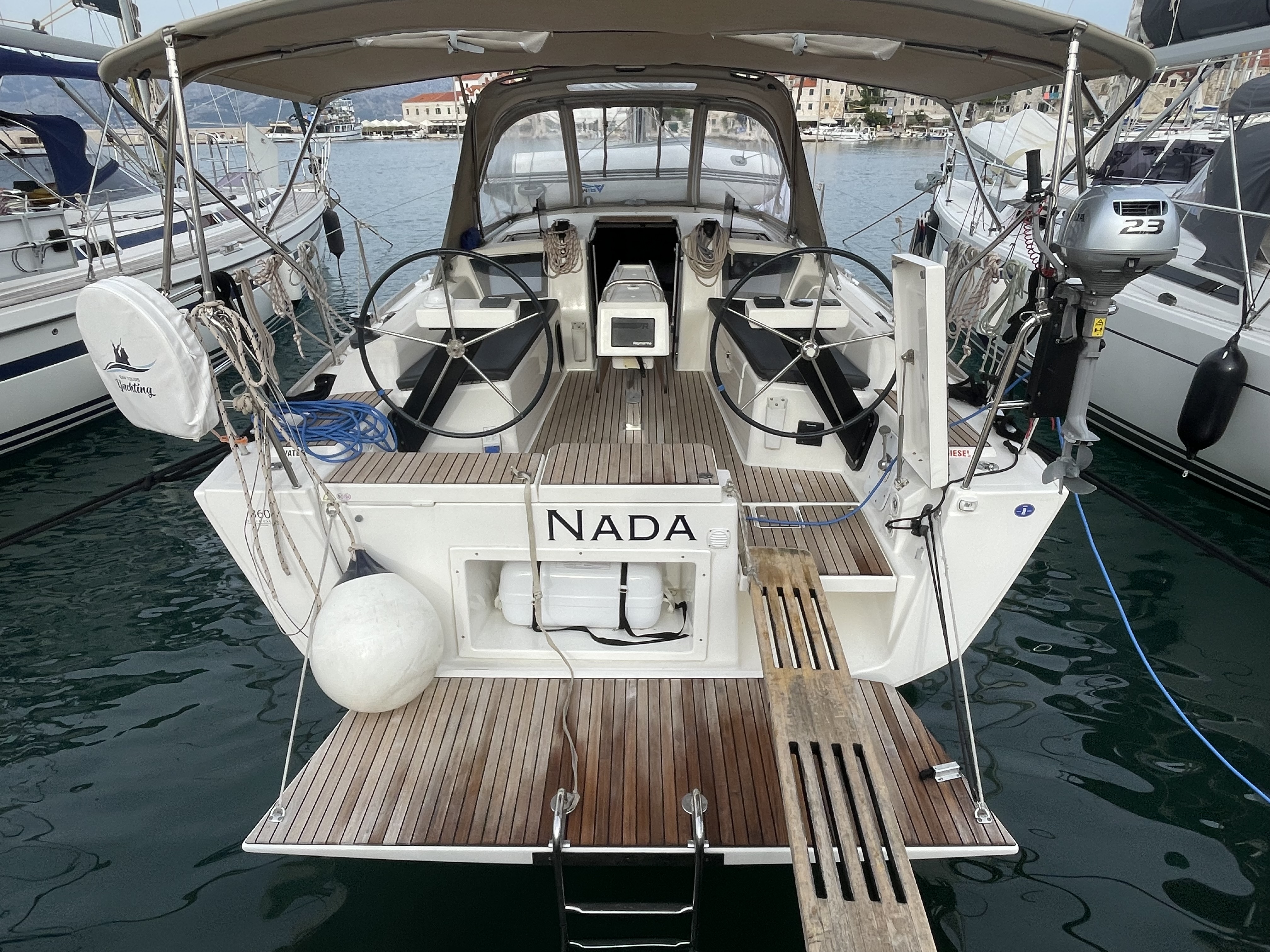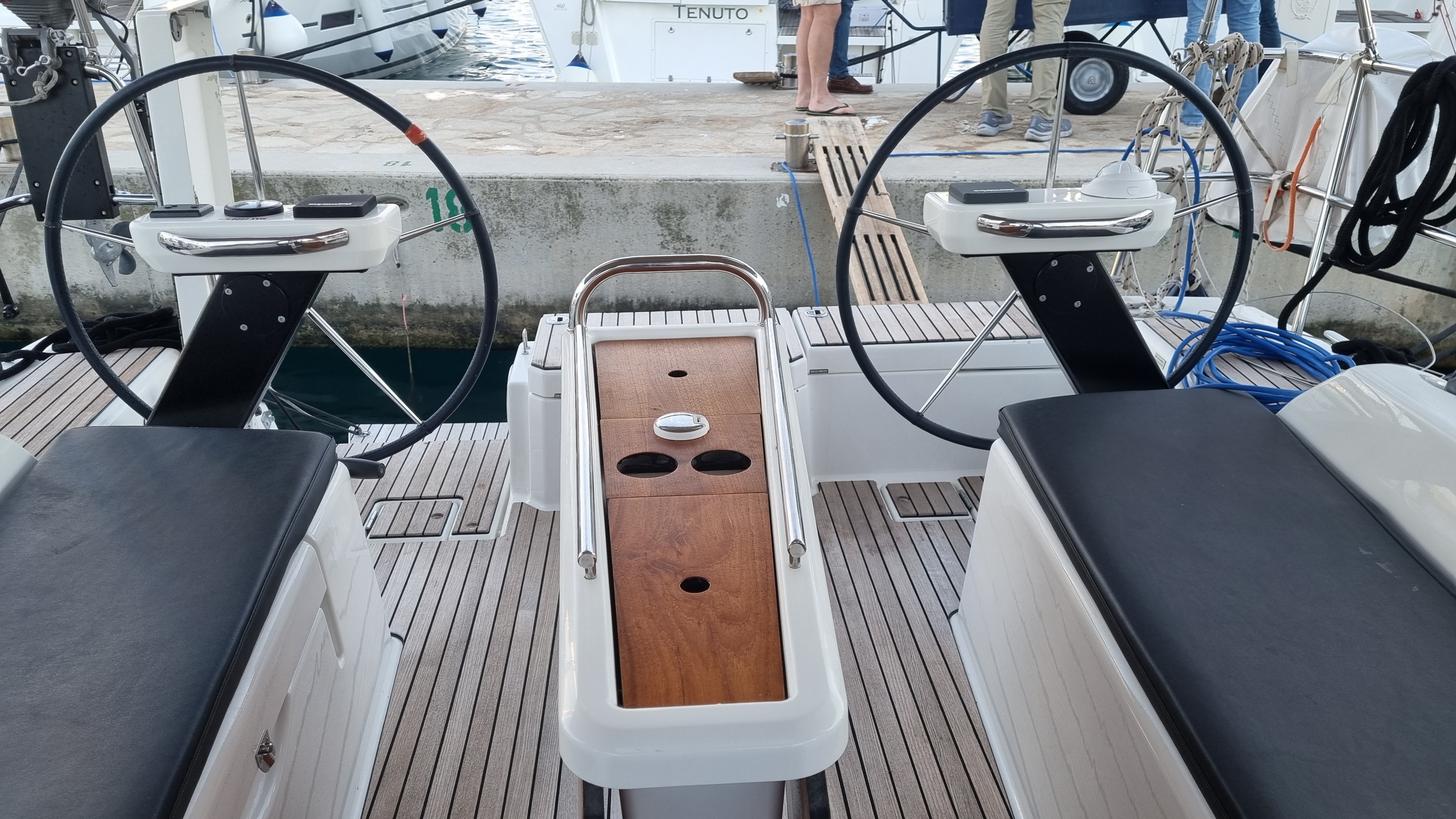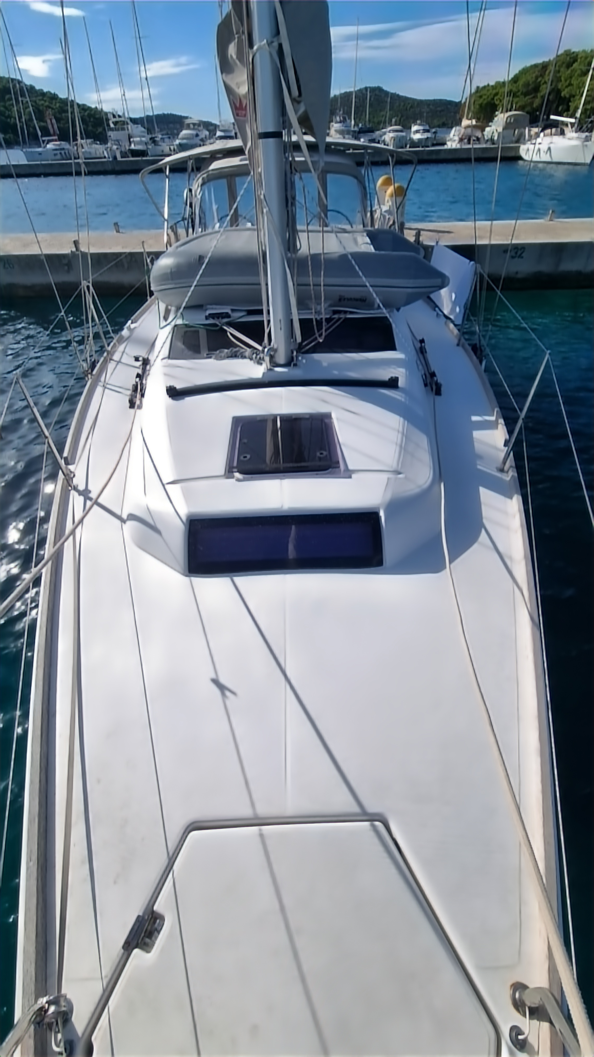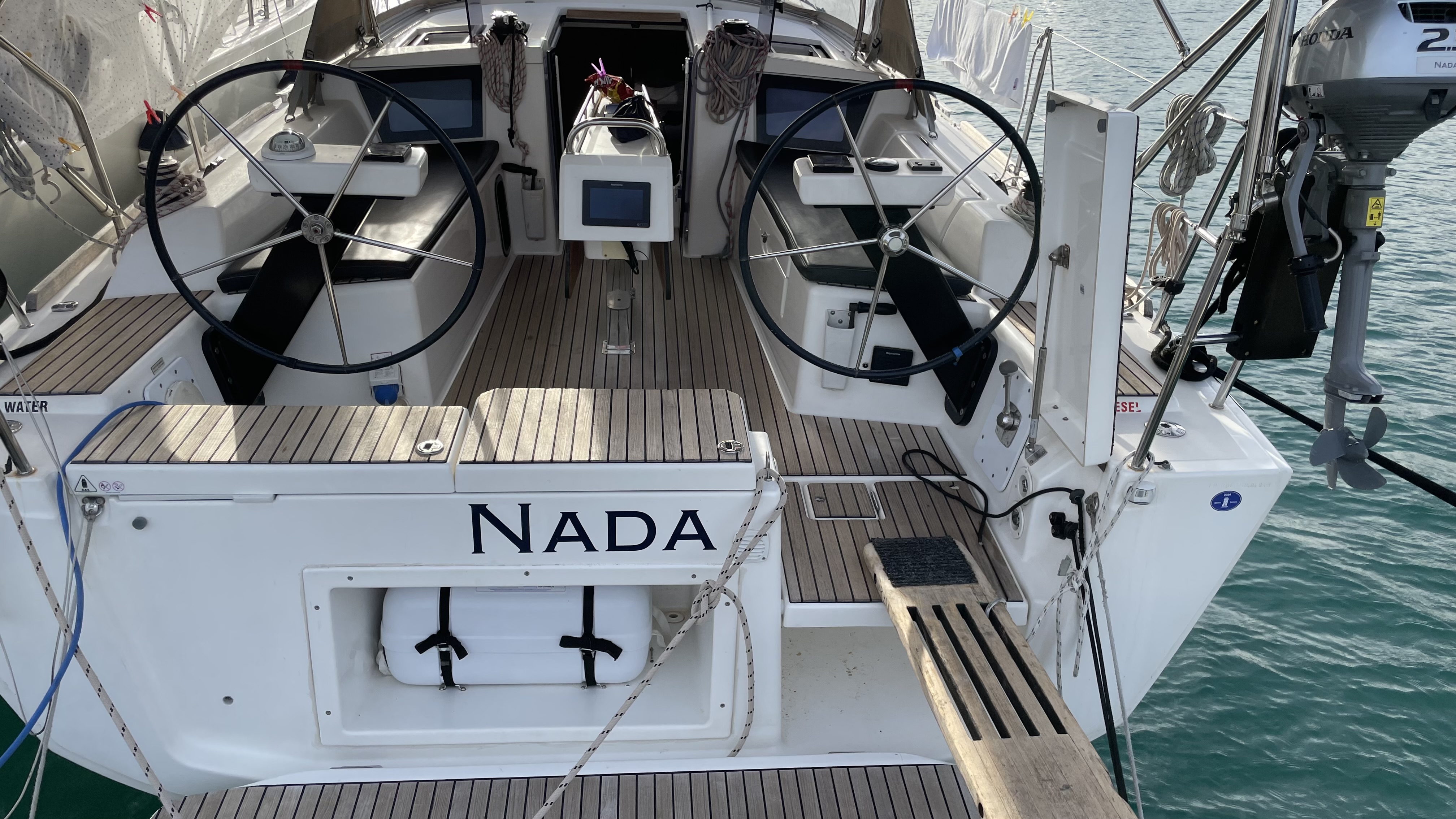 | Outside | 220 V-Landanschluss, Anker mit Kette, Badeplattform, Benzinkanister, Biminitop, Bootshaken, Cockpitdusche, Cockpitlautsprecher, Cockpitpolster, Cockpittisch, Deckbürste, Dieselkanister , elektr. Ankerwinsch, Fender, Festmacherleinen, Gangway, Grill, Kugelfender, Solaranlage, Sprayhood, Spülbecken im Cockpit, Teak auf Badeplattform, Teak im Cockpit, Wasserkanister , Wasserschlauch, Windex, Winschen |
