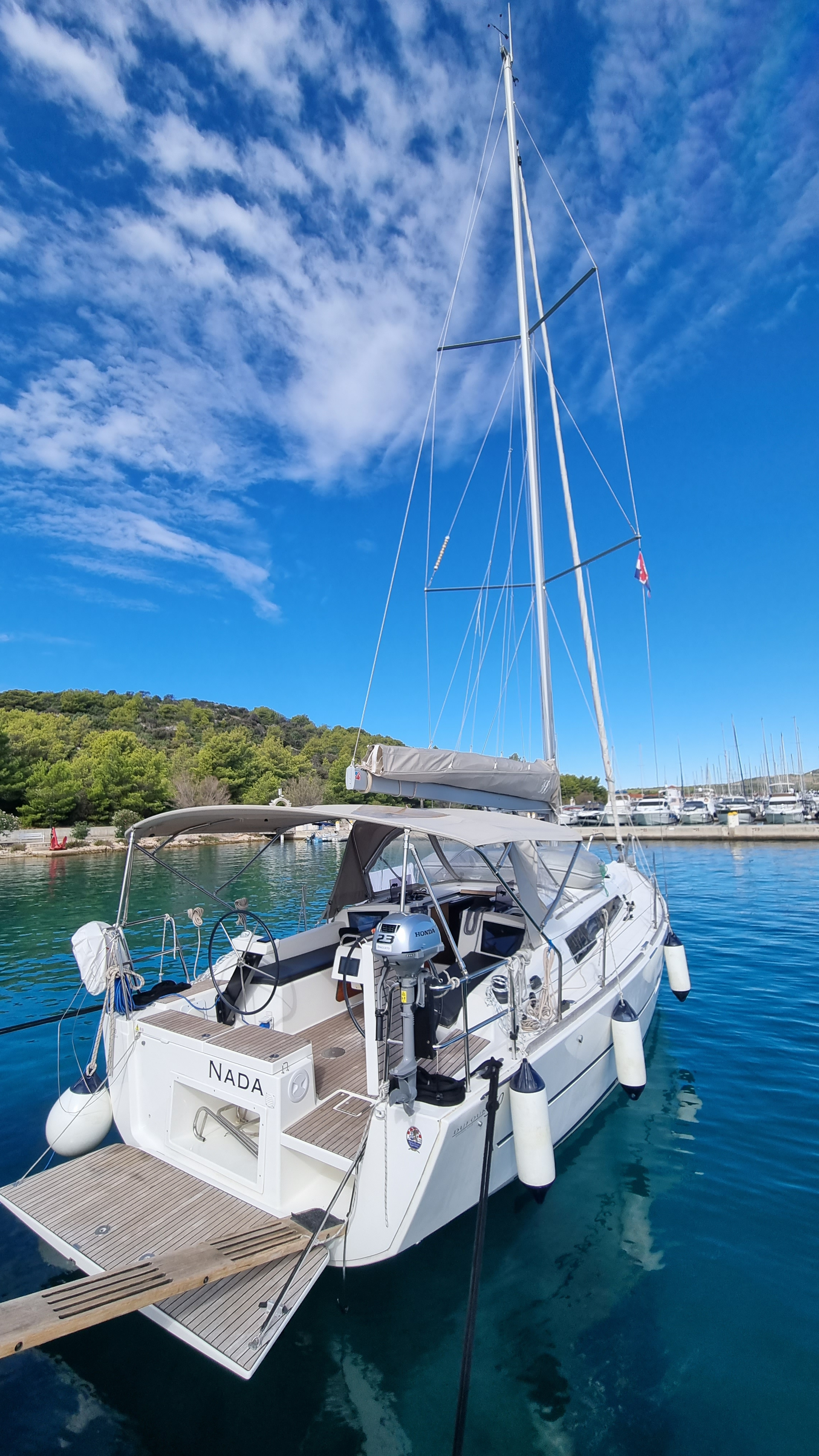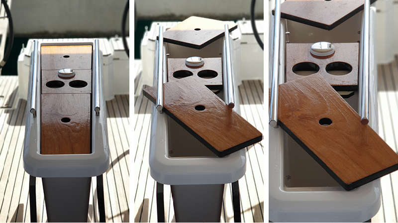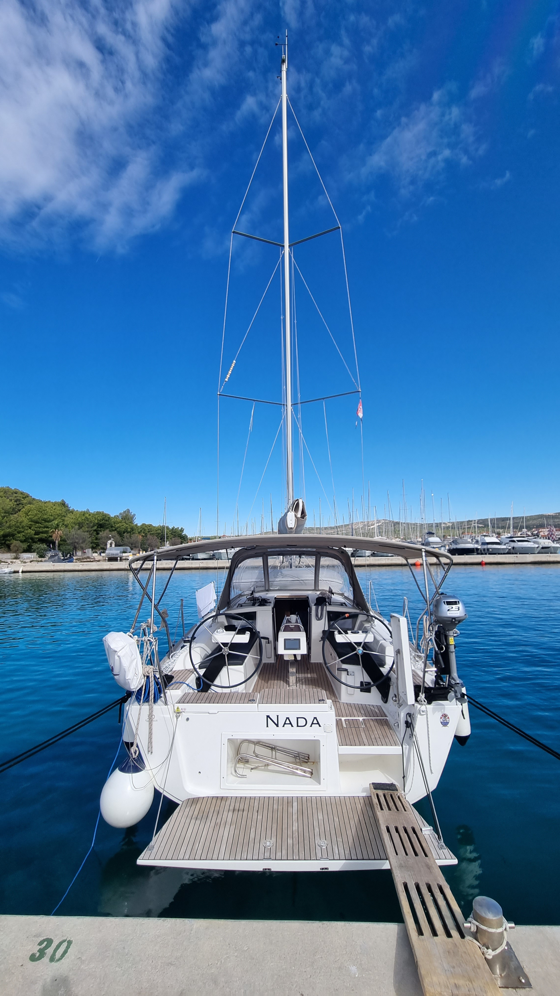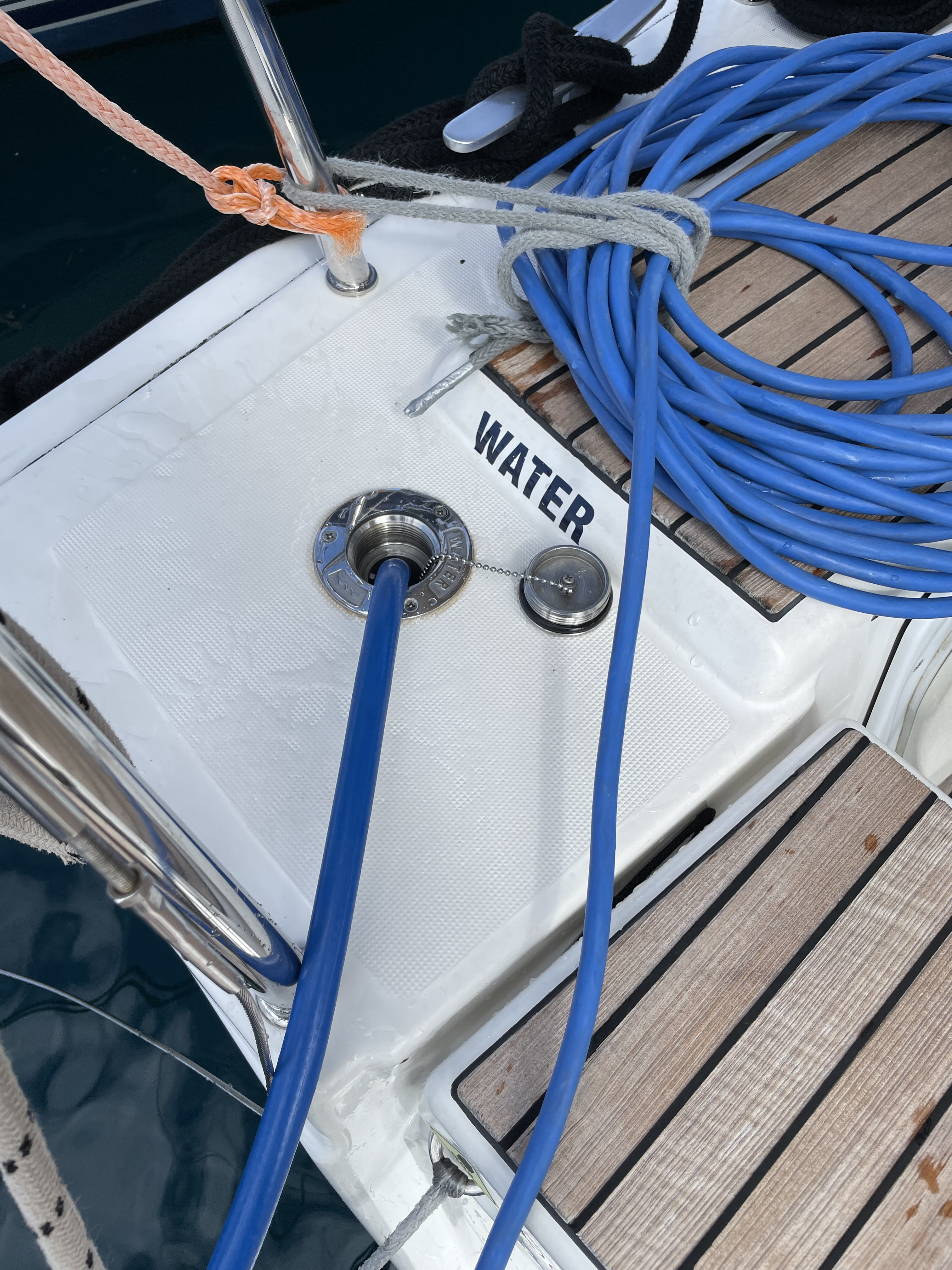 | Outside | 220 V-Landanschluss, Anker mit Kette, Badeplattform, Benzinkanister, Biminitop, Bootshaken, Cockpitdusche, Cockpitlautsprecher, Cockpitpolster, Cockpittisch, Deckbürste, Dieselkanister , elektr. Ankerwinsch, Fender, Festmacherleinen, Gangway, Grill, Kugelfender, Solaranlage, Sprayhood, Spülbecken im Cockpit, Teak auf Badeplattform, Teak im Cockpit, Wasserkanister , Wasserschlauch, Windex, Winschen |