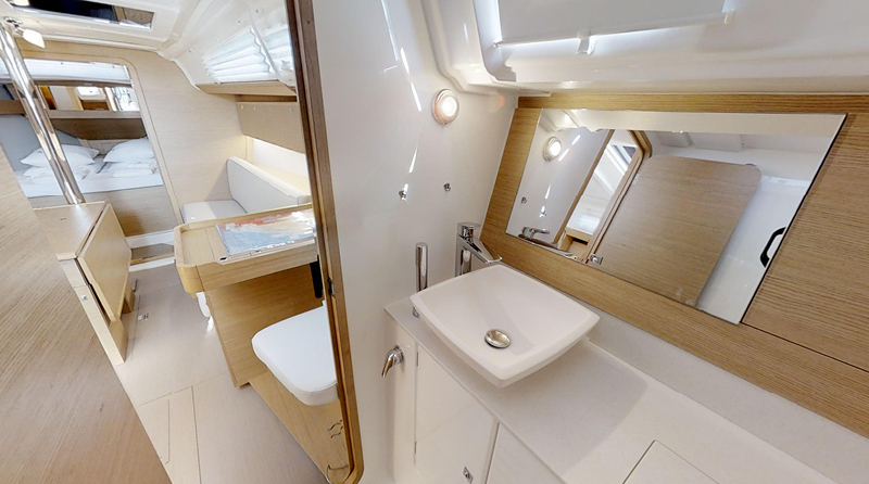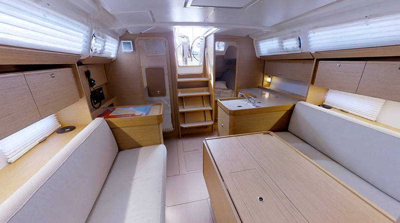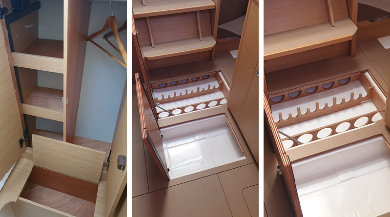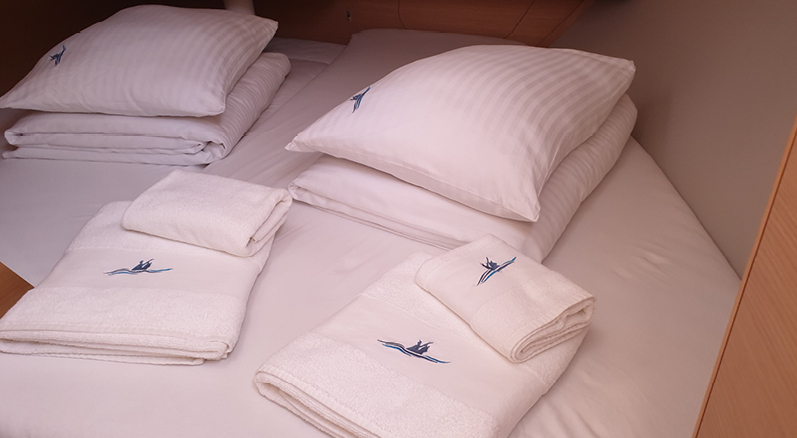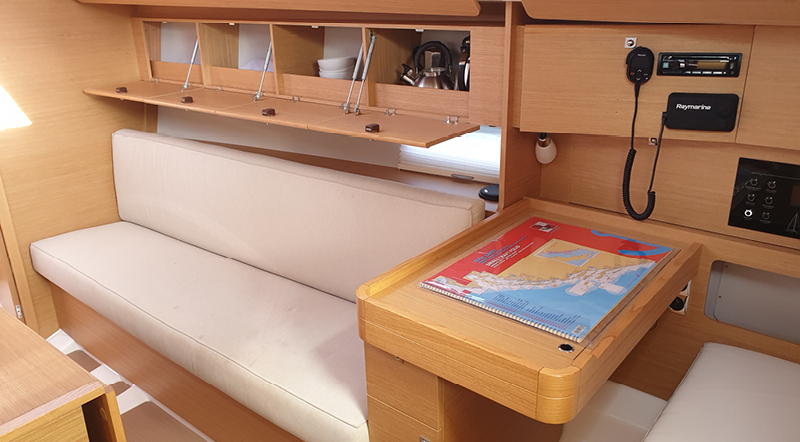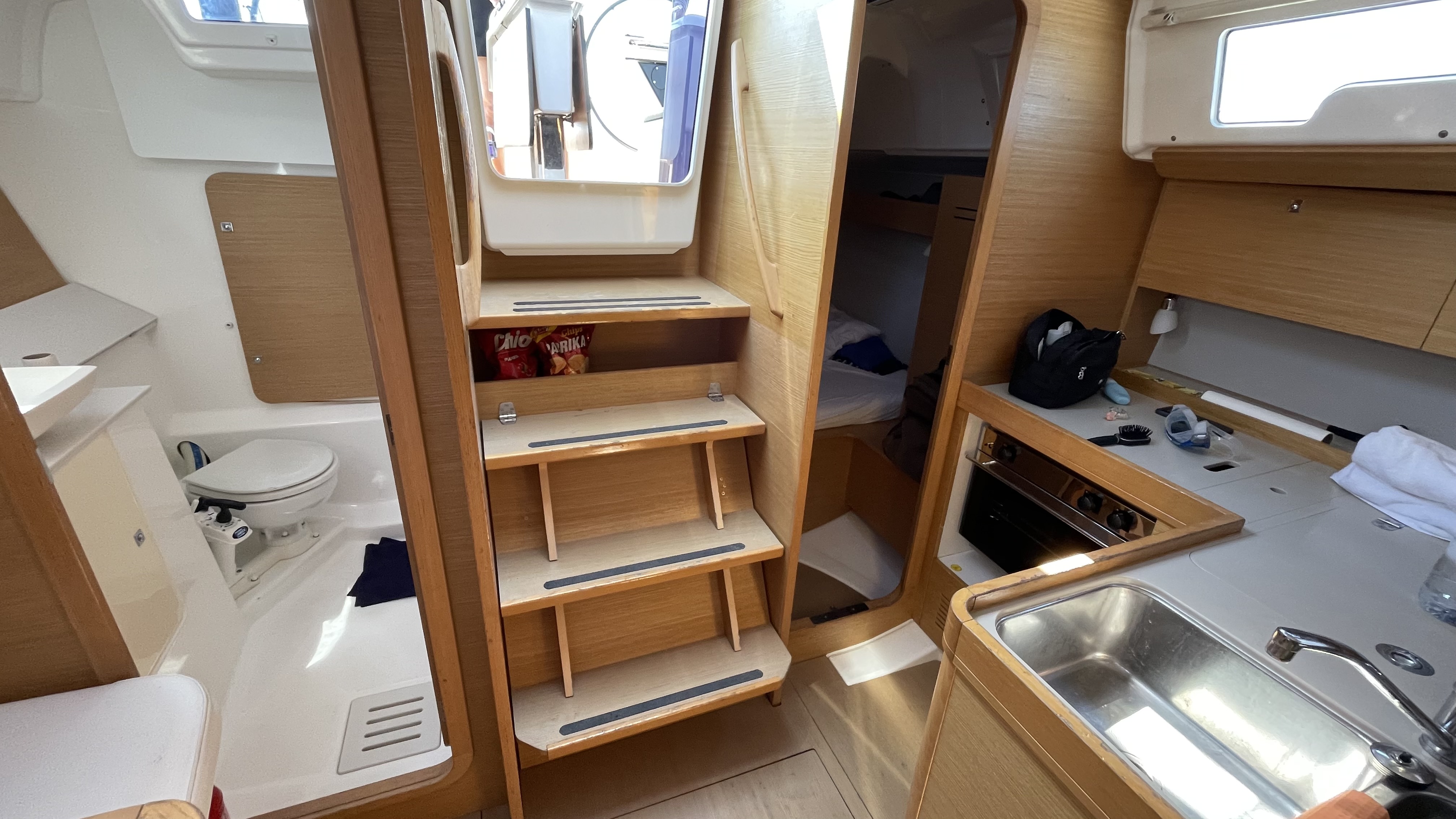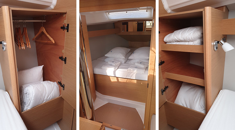 | Inside | 3-flammiger Gasherd, Fäkalientank, Inverter 12V/220V, Kleiderbügel, Kühlschrank, Landstromkabel, Lautsprecher im Salon, Luftpumpe für Beiboot, Pantryausstattung, Radio mit USB und Bluetooth, Salontisch absenkbar, Ventilatoren in Kabinen, Weinkühlschrank, Weinschrank |