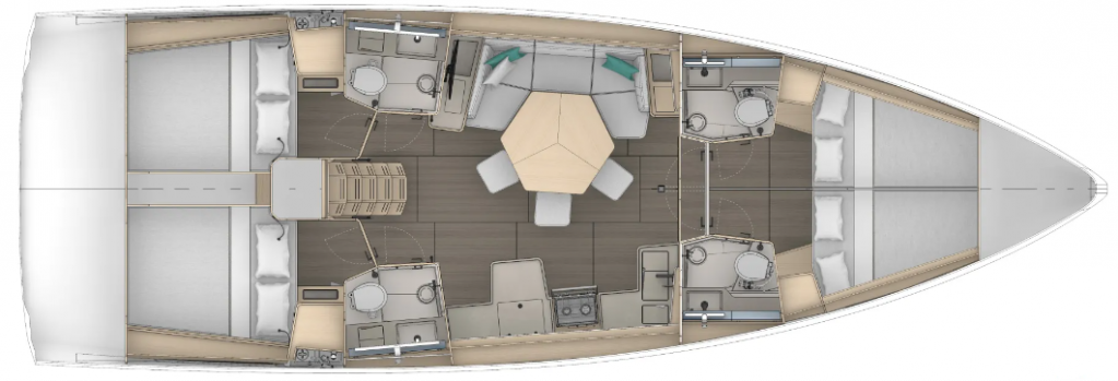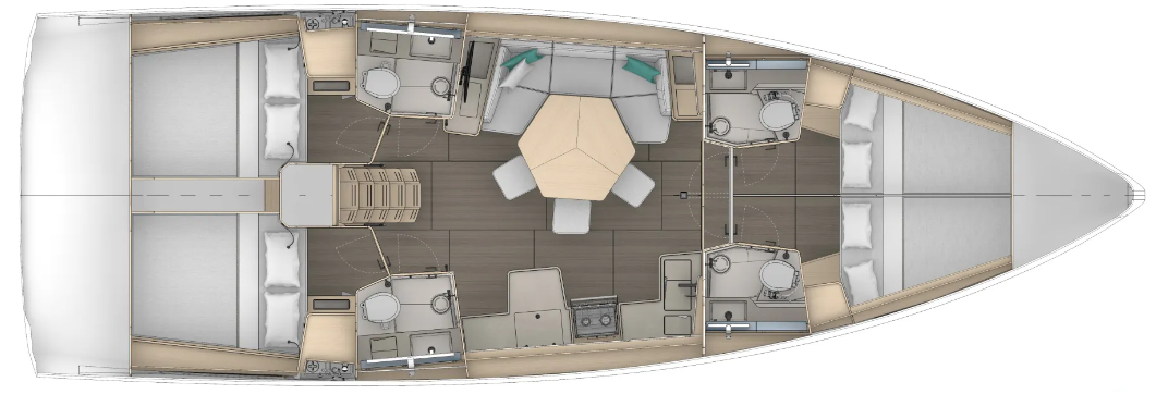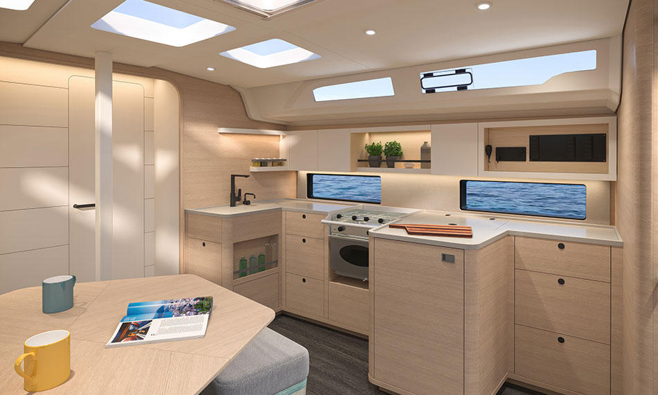 Inside 3-flammiger Gasherd, Fäkalientank, Inverter 12V/220V, Kleiderbügel, Kühlschrank, Landstromkabel, Lautsprecher im Salon, Luftpumpe für Beiboot, Pantryausstattung, Radio mit USB und Bluetooth, Weinkühlschrank