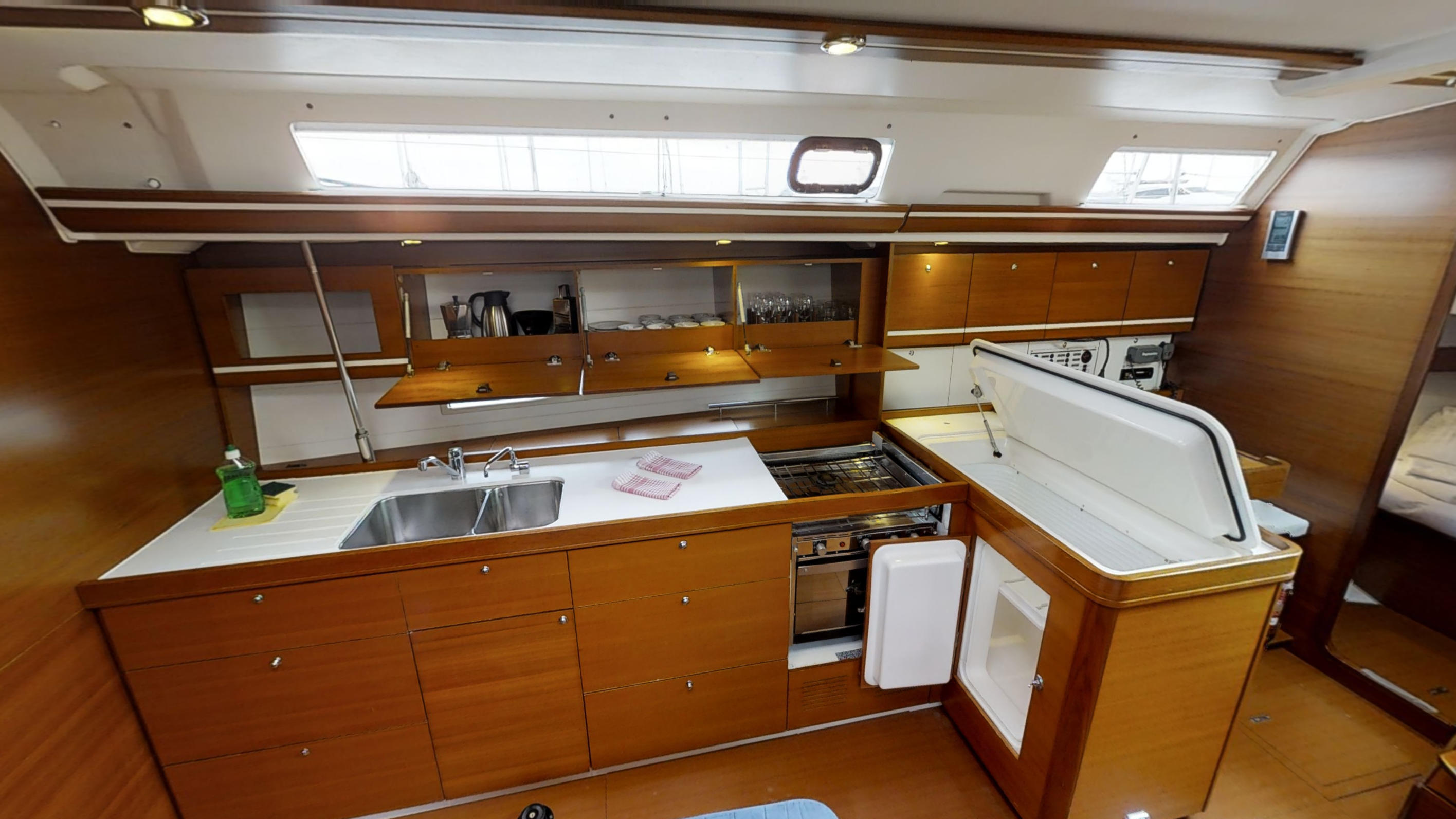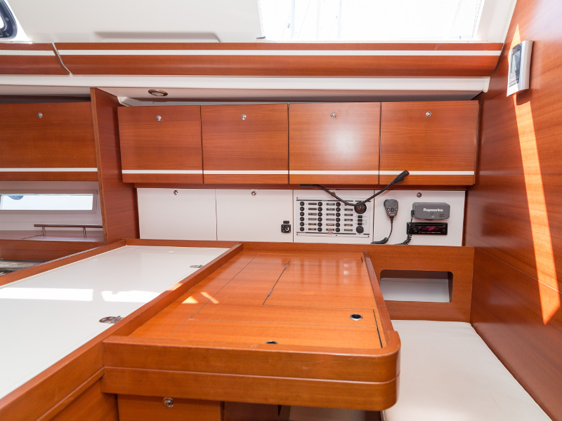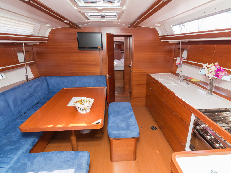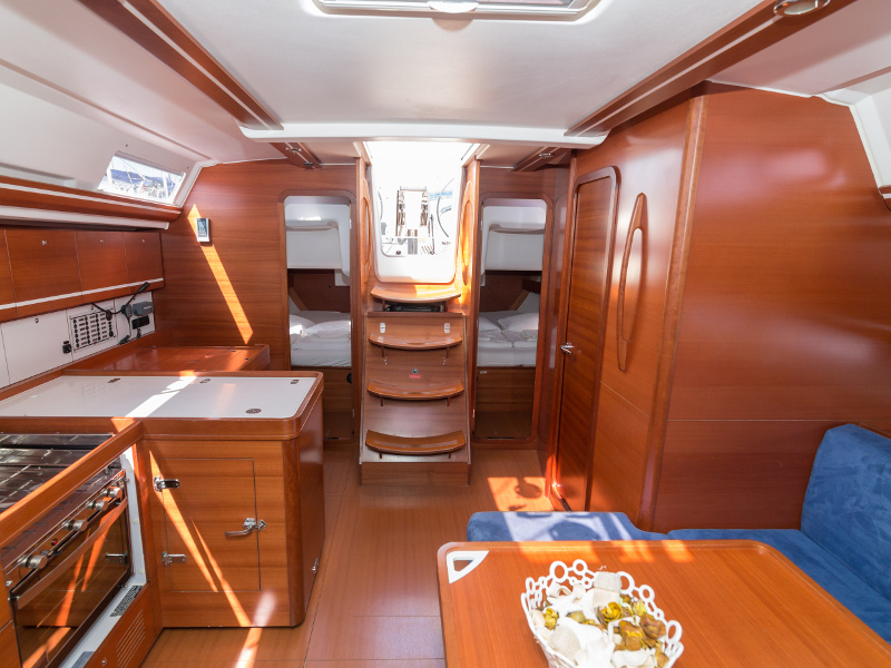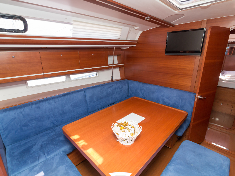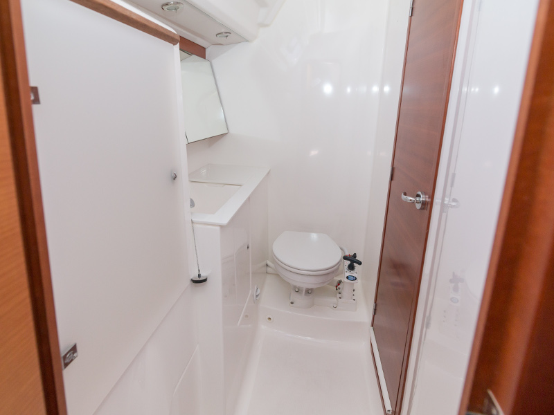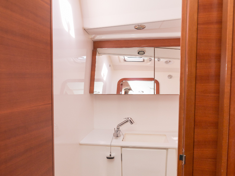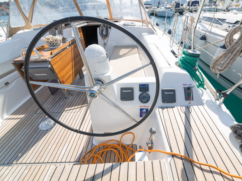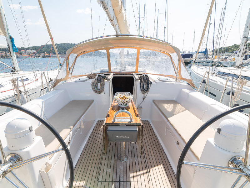 | Outside | 220 V-Landanschluss, Anker mit Kette, Biminitop, Cockpitdusche, Cockpitkühlschrank, Cockpitlautsprecher, Cockpitpolster, Cockpittisch, elektr. Ankerwinsch, Sprayhood, Teak im Cockpit |