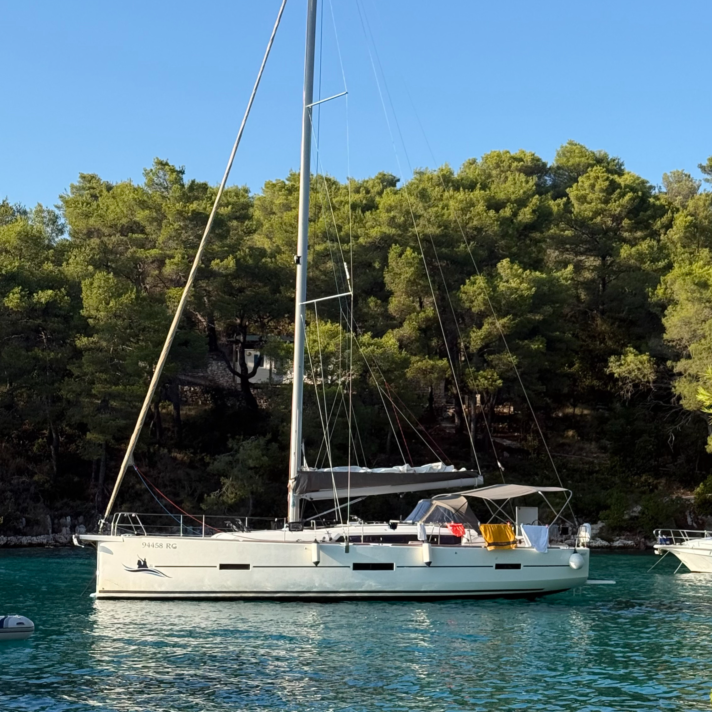 | Outside | 220 V-Landanschluss, Anker mit Kette, Badeplattform, Benzinkanister, Biminitop, Bootshaken, Cockpitdusche, Cockpitkühlschrank, Cockpitlautsprecher, Cockpitpolster, Cockpittisch, Deckbürste, Dieselkanister , elektr. Ankerwinsch, Fender, Festmacherleinen, Gangway, Grill, Kugelfender, Sprayhood, Spülbecken im Cockpit, Teak auf Badeplattform, Teak im Cockpit, Wasserkanister , Wasserschlauch, Winschen |