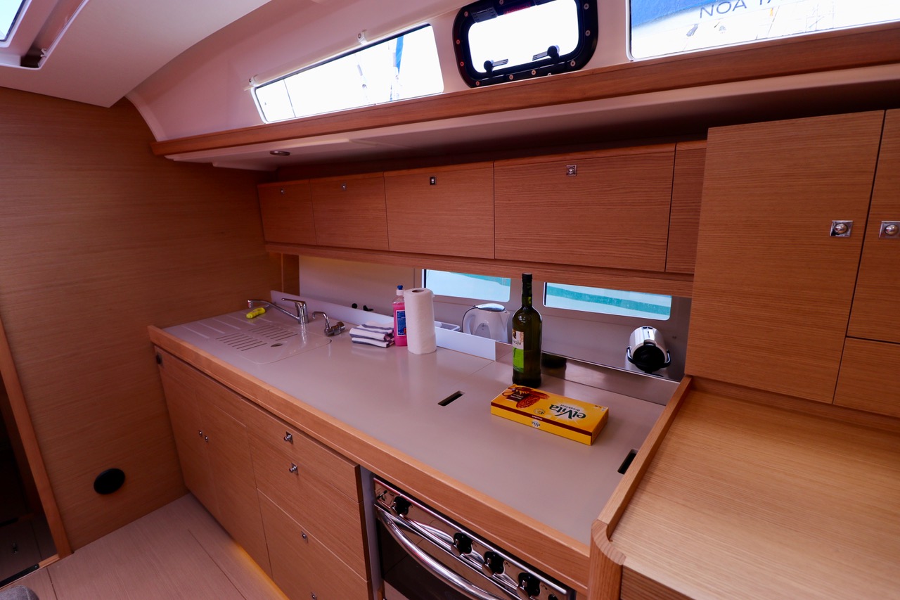 | Outside | 12 V-Anschluss, 220 V-Landanschluss, Anker mit Kette, Badeplattform, Biminitop, Cockpitdusche, Cockpitlautsprecher, Cockpitpolster, Cockpittisch, Deckbürste, elektr. Ankerwinsch, Fender, Festmacherleinen, Gangway, Grill, Kunststoff-Eimer (Pütz), Sprayhood, Teak im Cockpit, Wasserschlauch, Windex, Winschen |