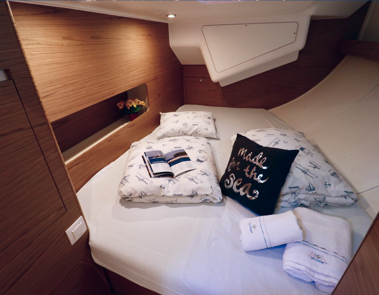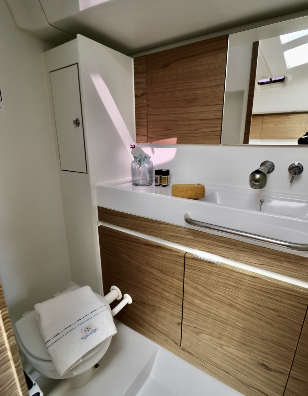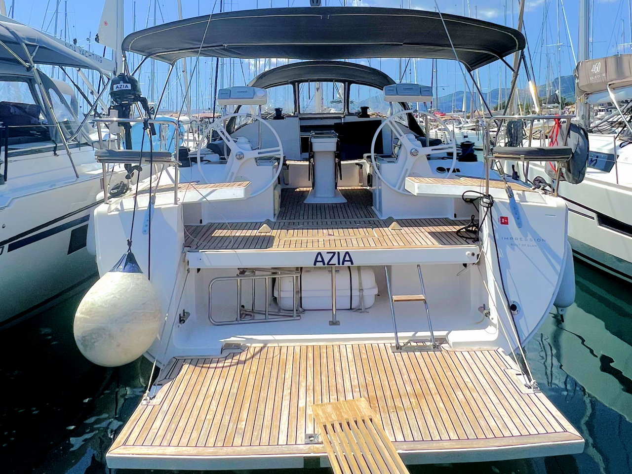 | Outside | 220 V-Landanschluss, Anker mit Kette, Badeleiter, Badeplattform, Biminitop, Cockpitdusche, Cockpitlautsprecher, Cockpitpolster, Cockpittisch, elektr. Ankerwinsch, Fender, Festmacherleinen, Gangway, Sprayhood, Teak im Cockpit, Windex |