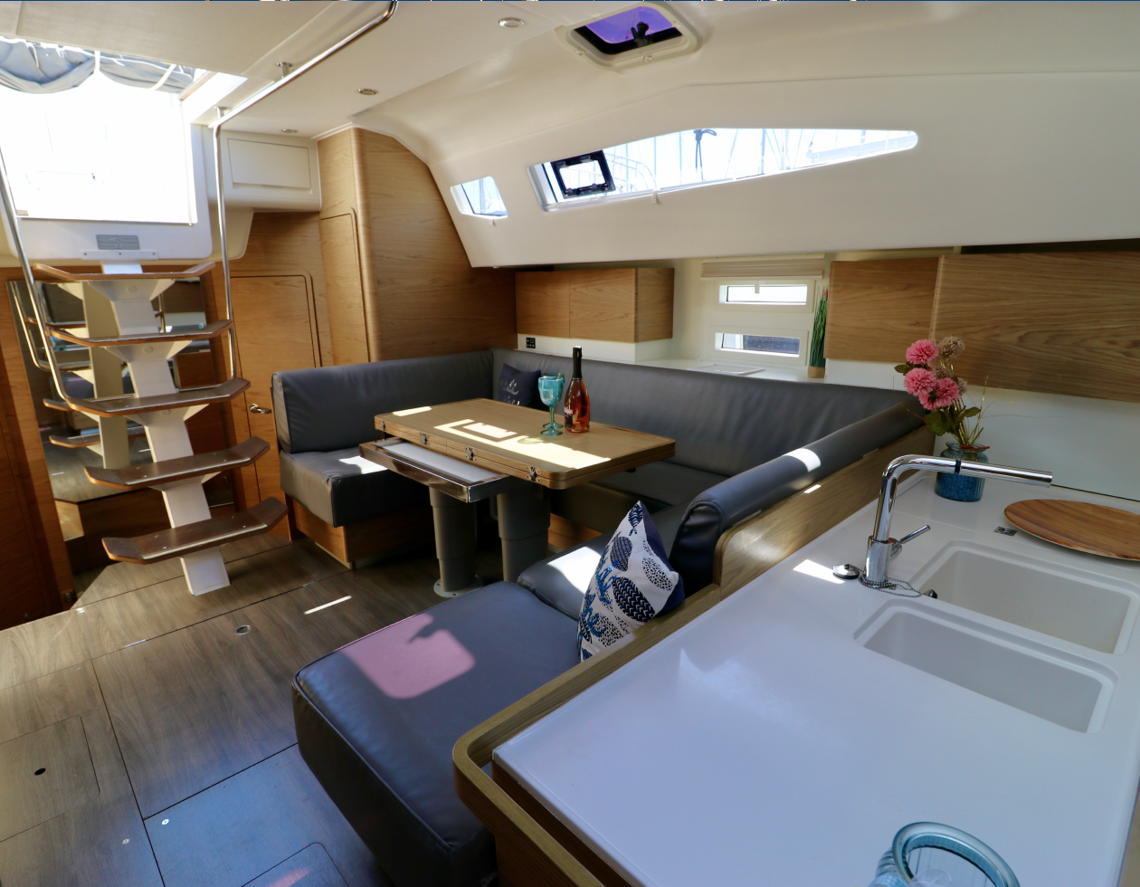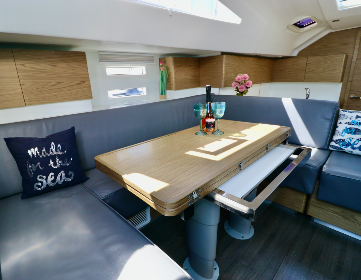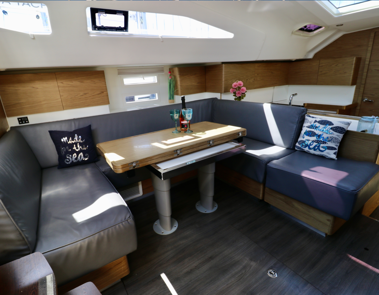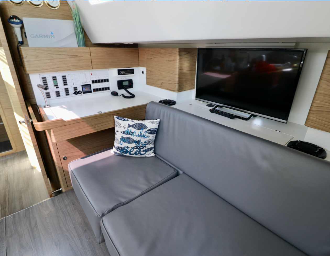 | Outside | 220 V-Landanschluss, Anker mit Kette, Badeleiter, Badeplattform, Biminitop, Cockpitdusche, Cockpitlautsprecher, Cockpitpolster, Cockpittisch, elektr. Ankerwinsch, Fender, Festmacherleinen, Gangway, Sprayhood, Teak im Cockpit, Windex |
