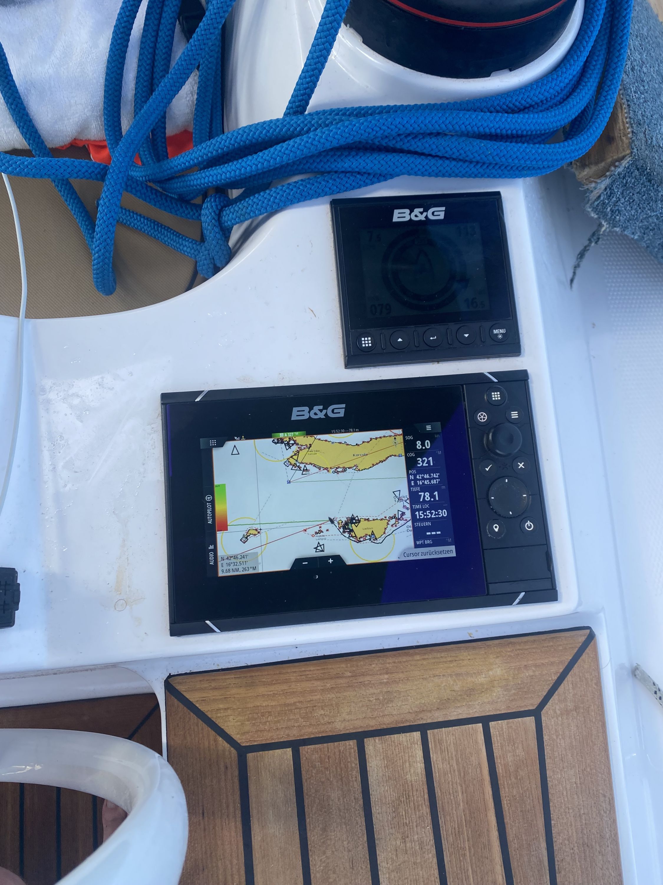 | Navigation | Echolot, GPS mit Kartenplotter im Cockpit, Kompass, Navigationsbesteck, Seekarten, Windmesser |