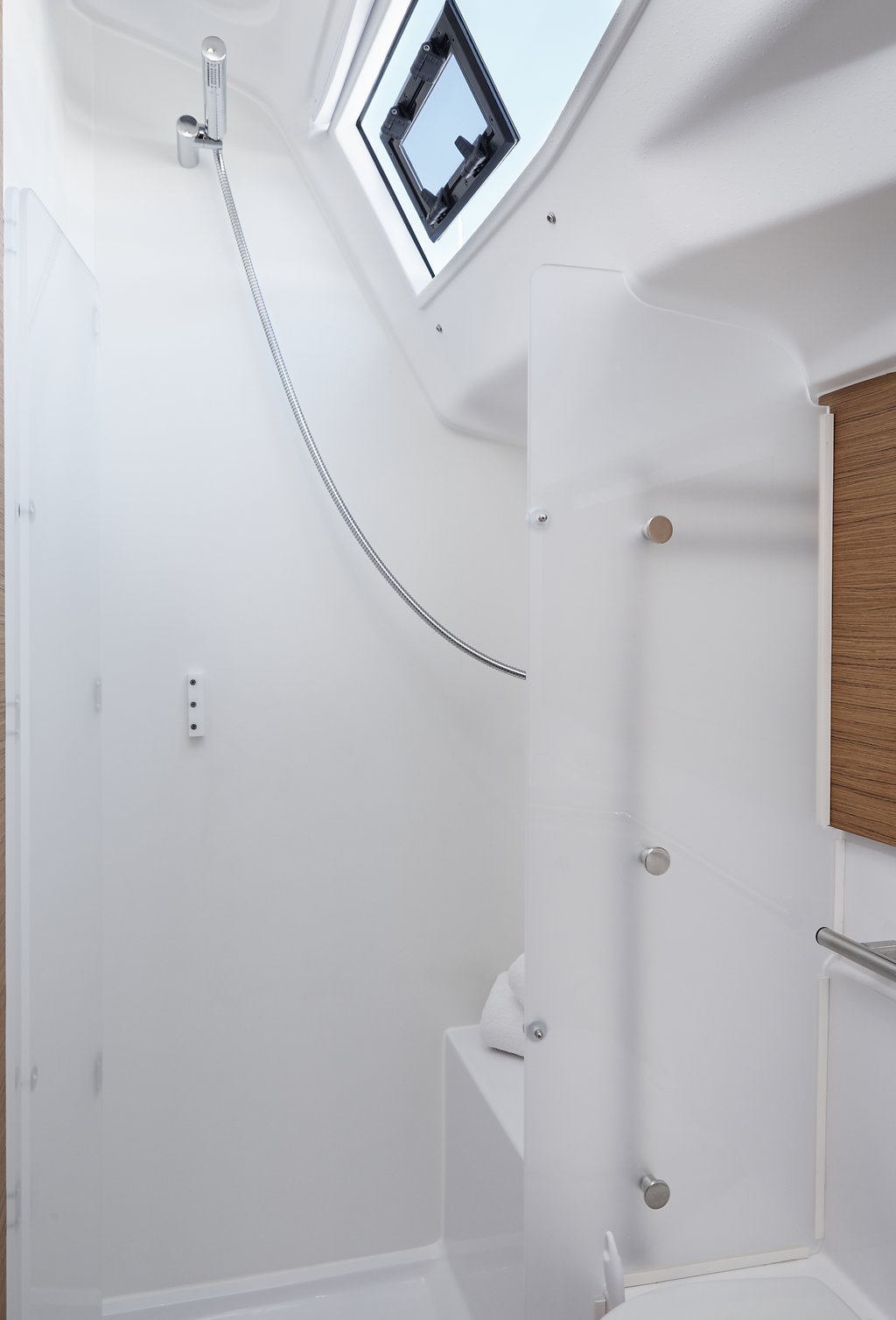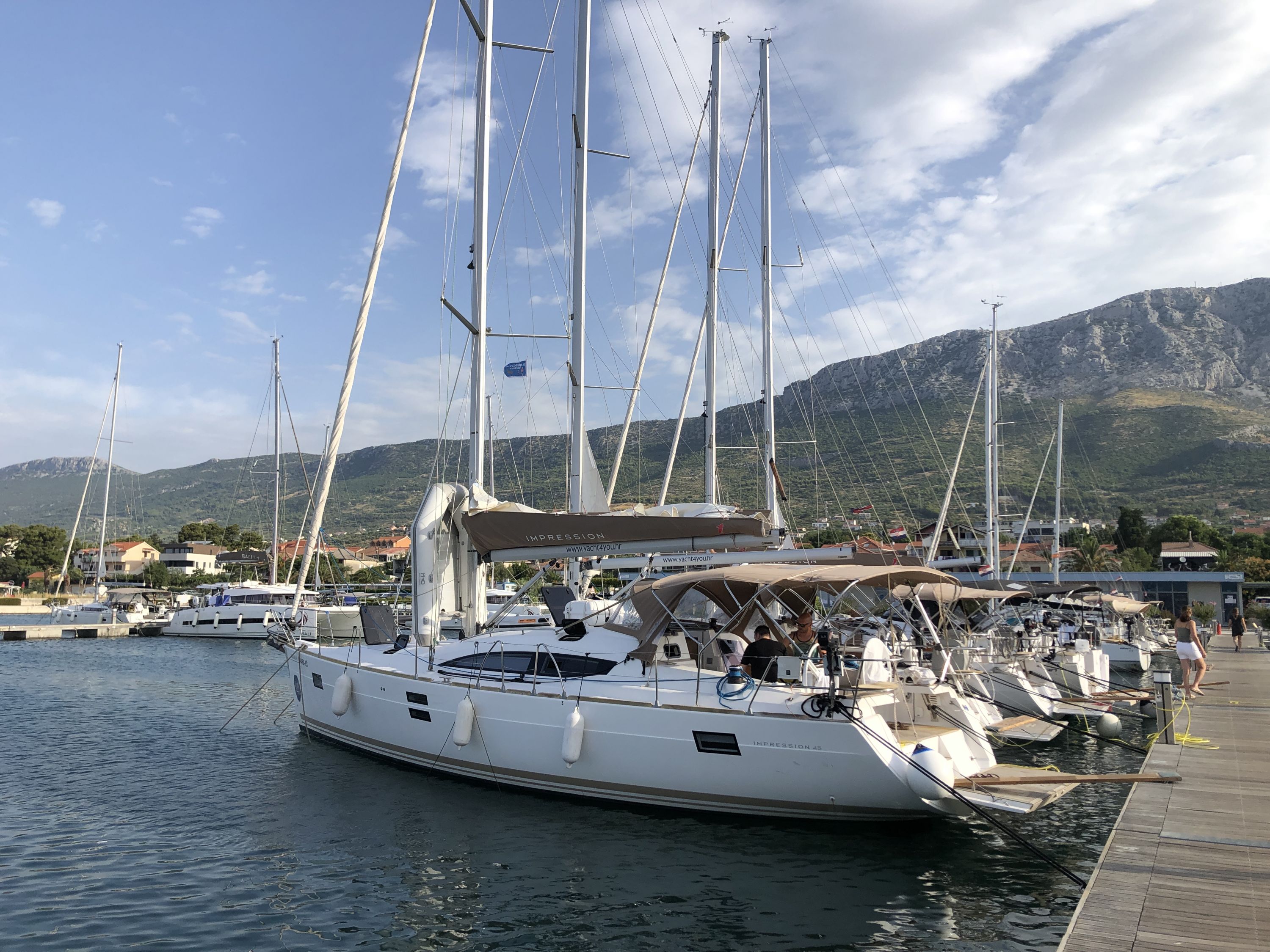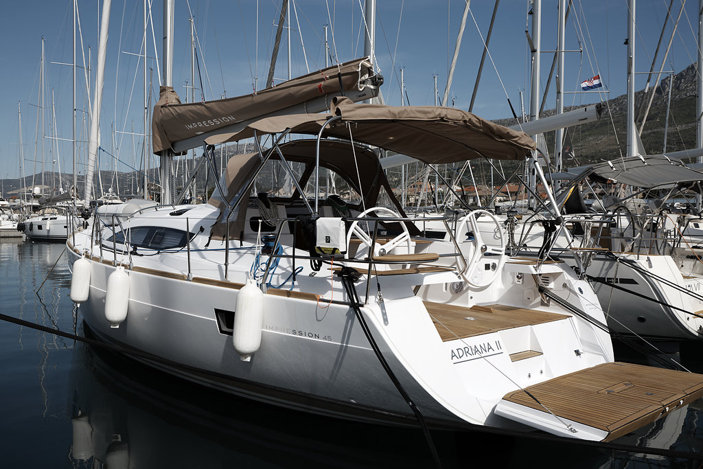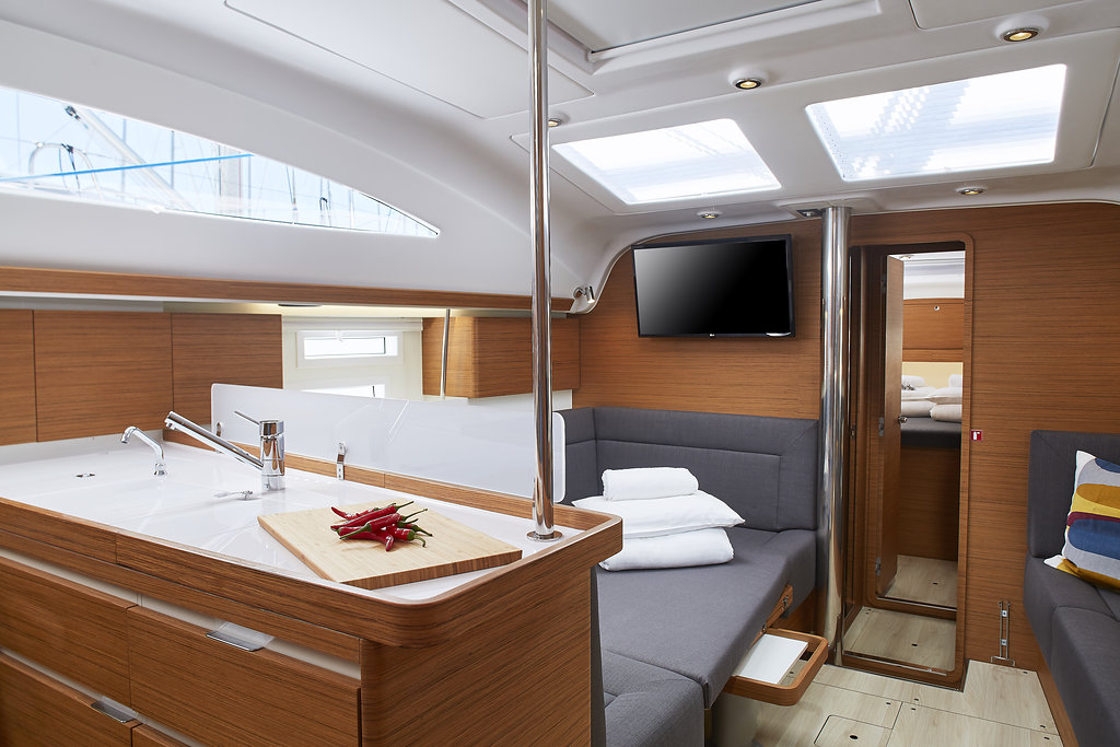 | Outside | 220 V-Landanschluss, Anker mit Kette, Badeplattform, Biminitop, Cockpitdusche, Cockpitpolster, Cockpittisch, elektr. Ankerwinsch, Faltpropeller, Sprayhood, Teak im Cockpit |