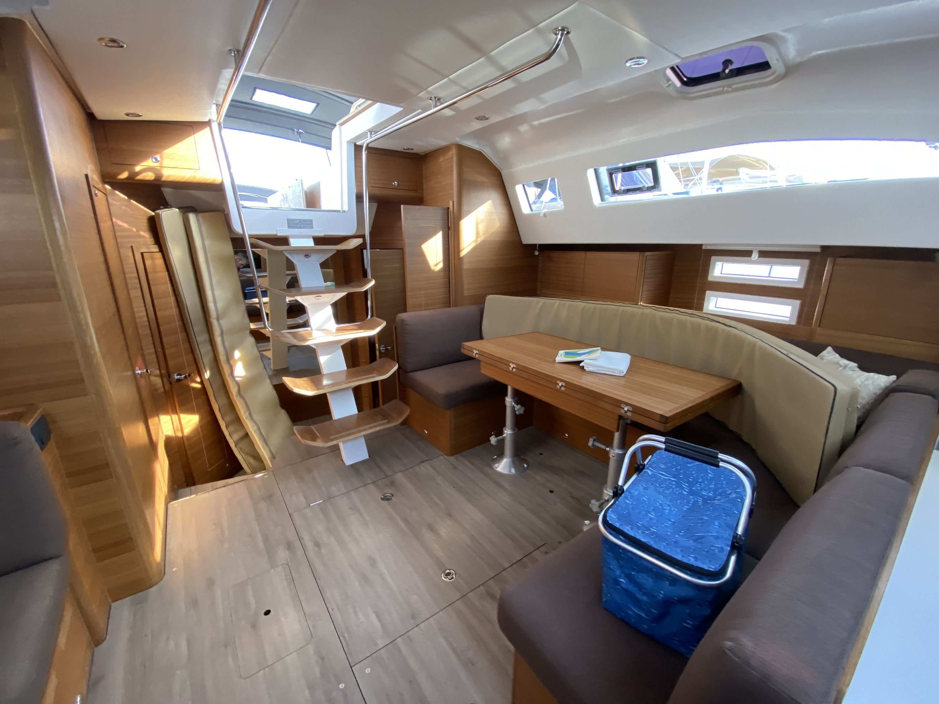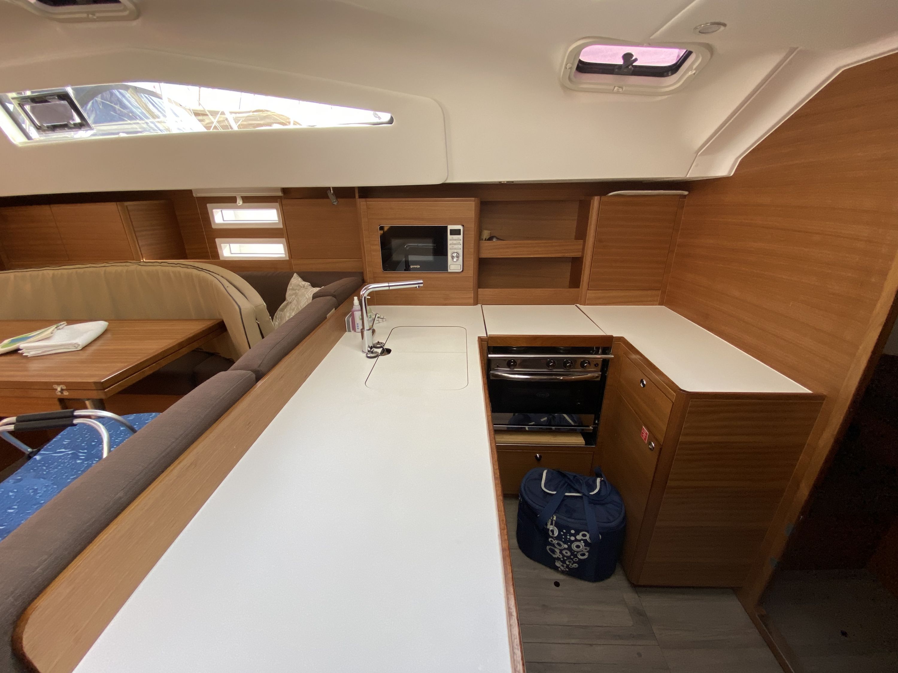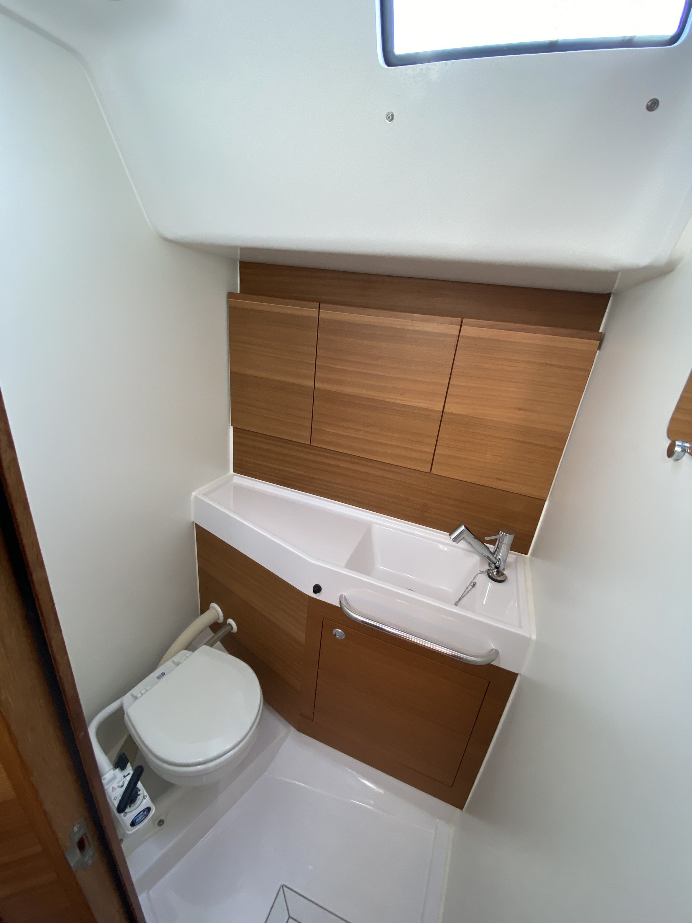 | Outside | 220 V-Landanschluss, Anker mit Kette, Badeplattform, Biminitop, Cockpitdusche, Cockpitkühlschrank, Cockpitpolster, Cockpittisch, elektr. Ankerwinsch, Faltpropeller, Grill, Sprayhood, Teak im Cockpit |