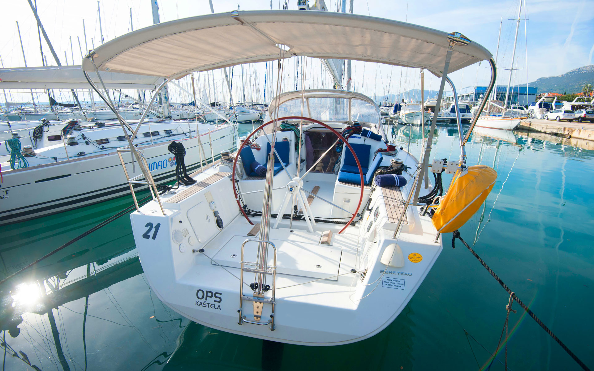 | Outside | Biminitop, Cockpitdusche, Cockpitlautsprecher, Cockpittisch (klappbar), elektr. Ankerwinsch, Sonnensegel, Spi-Winschen, Sprayhood, Teak im Cockpit |