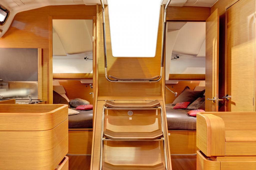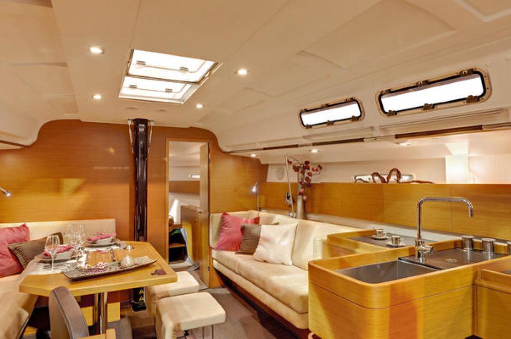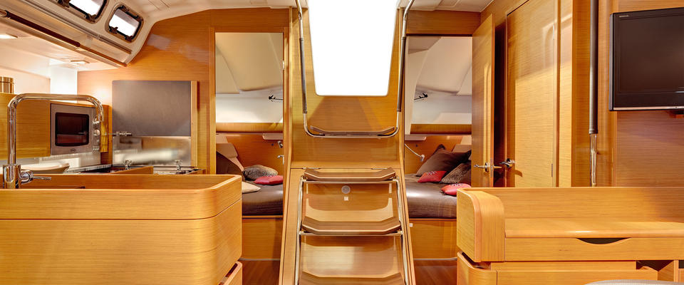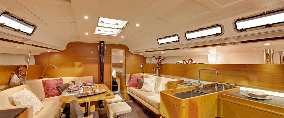 | Outside | Biminitop, Cockpitdusche, Cockpitlautsprecher, Cockpittisch (klappbar), elektr. Ankerwinsch, Genuawinschen, Sonnensegel, Spi-Winschen, Sprayhood, Teak im Cockpit |