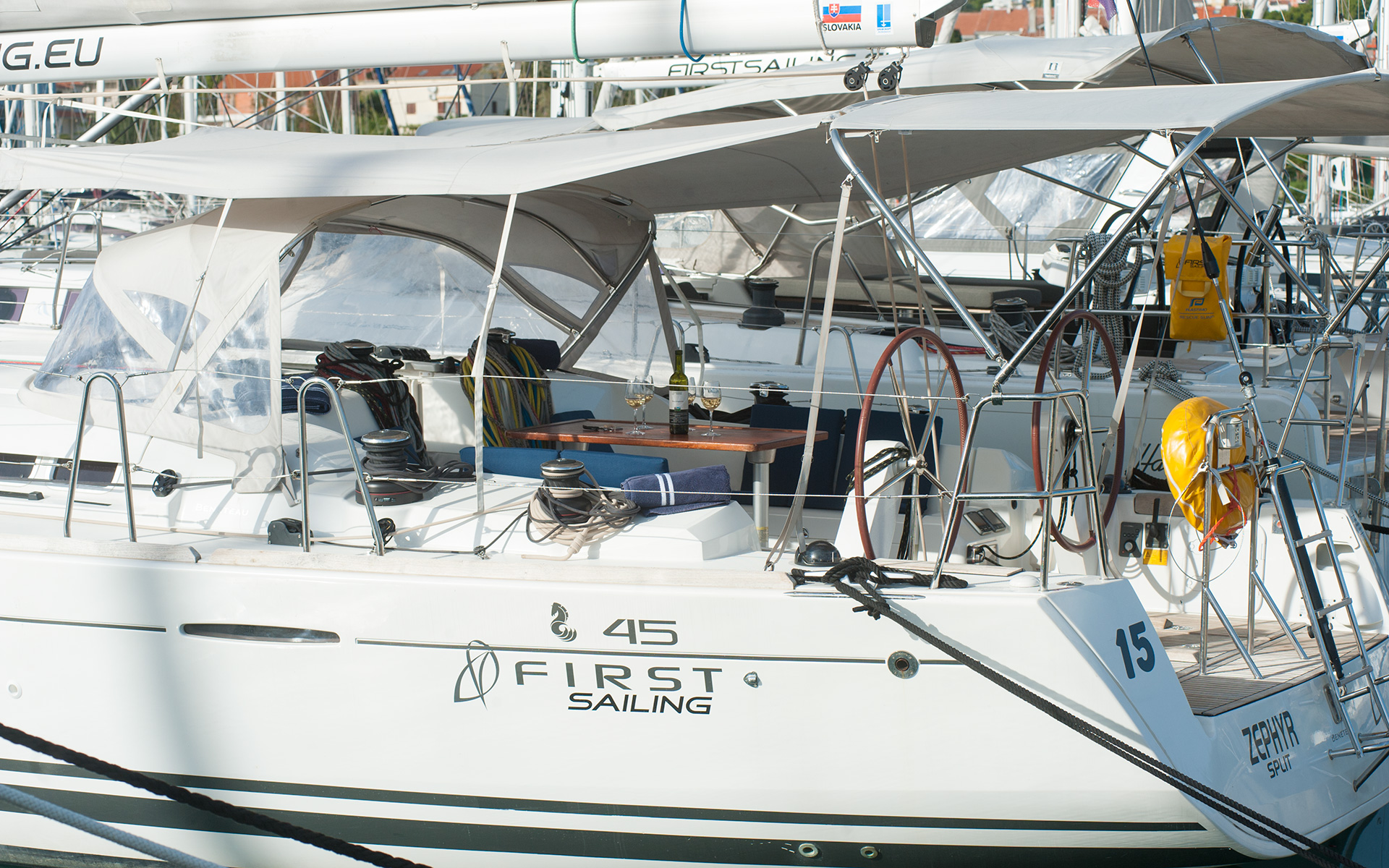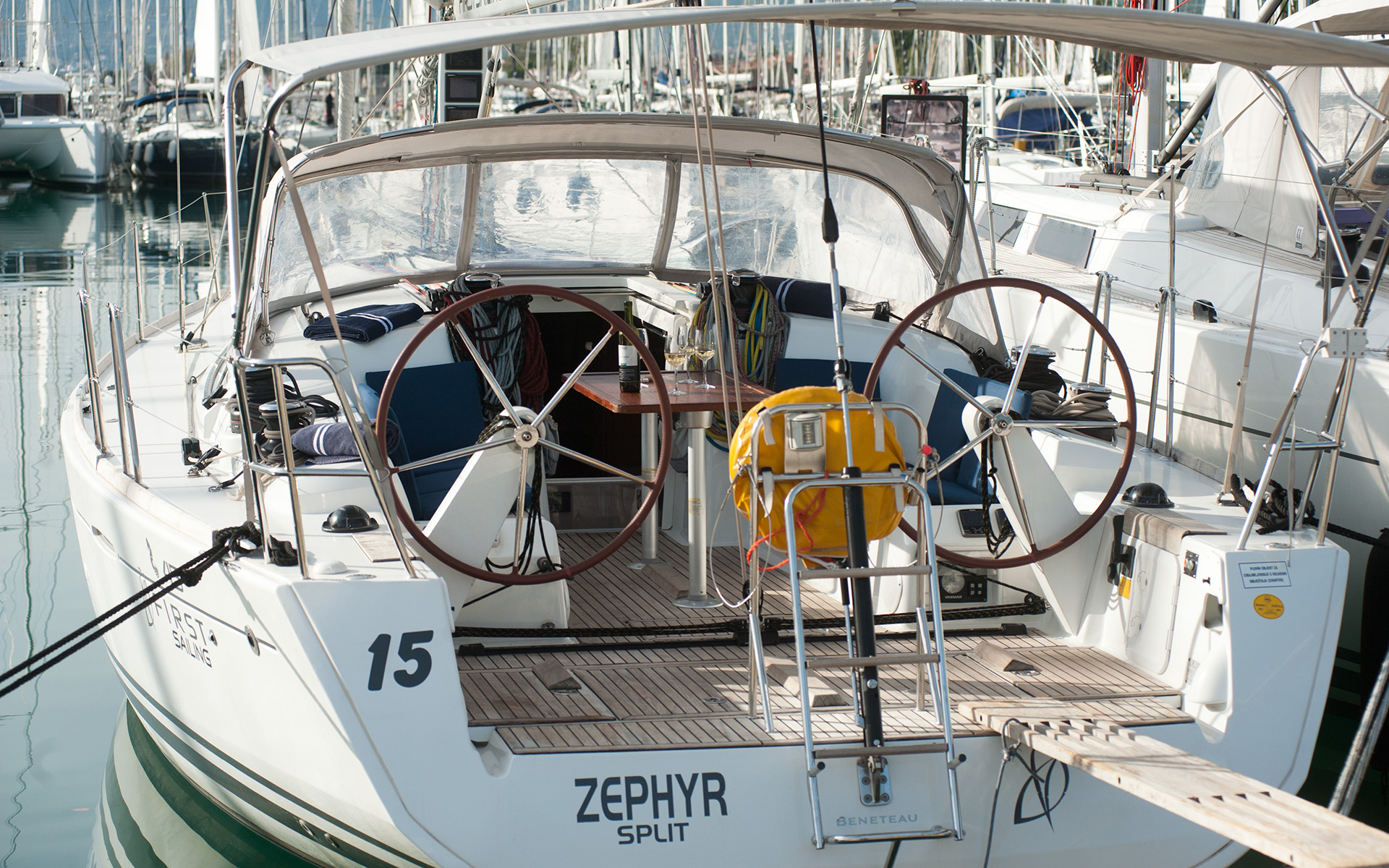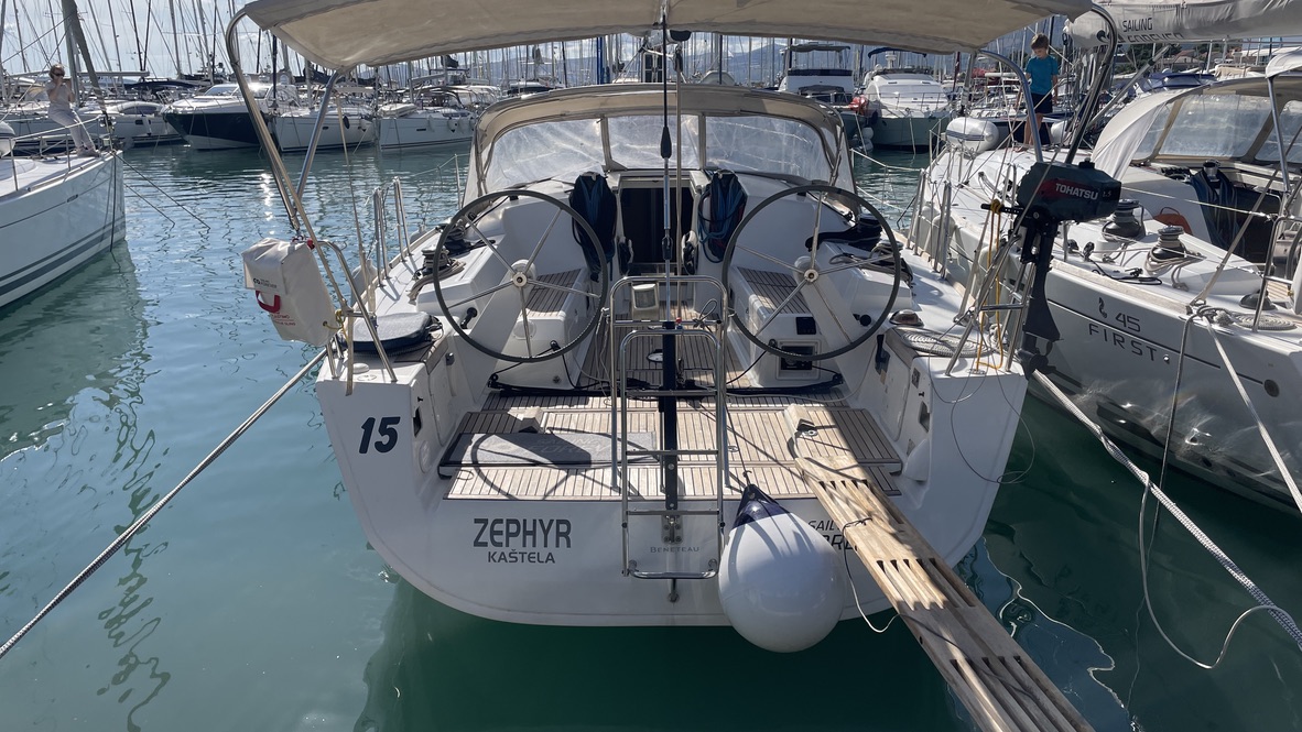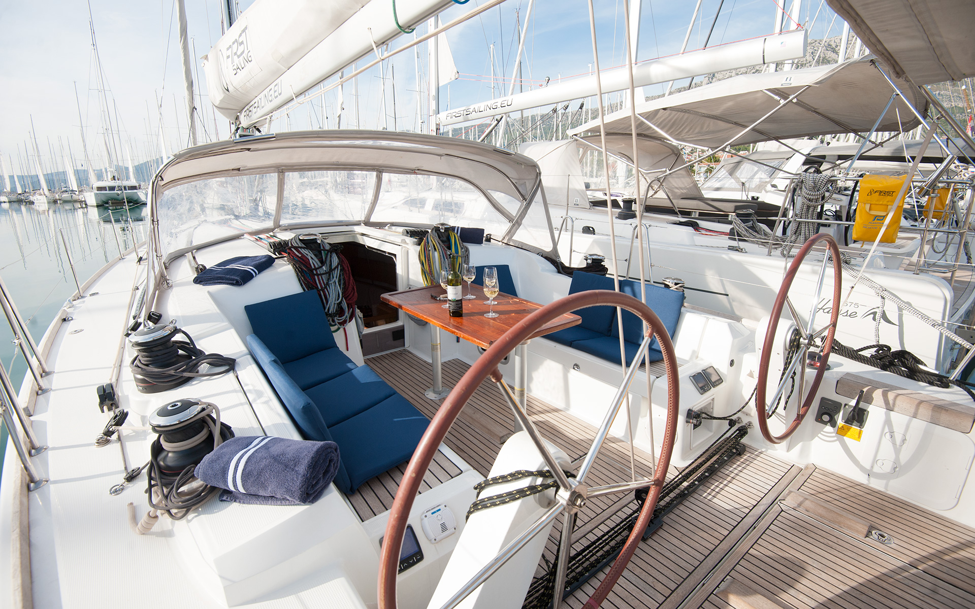| Outside | Biminitop, Cockpitdusche, Cockpitlautsprecher, Cockpittisch (klappbar), Genuawinschen, Sonnensegel, Spi-Winschen, Sprayhood, Teak im Cockpit, Winschen |