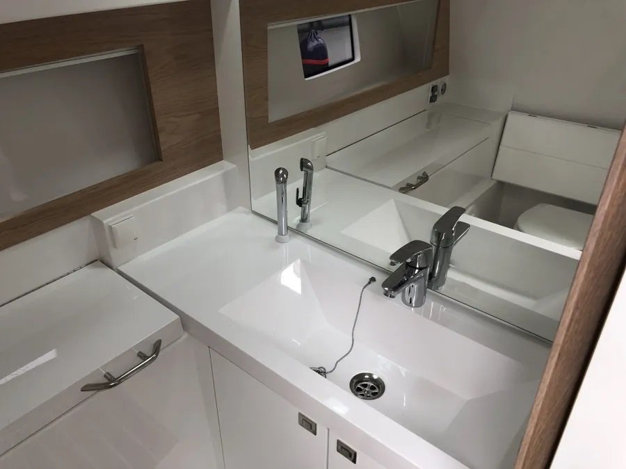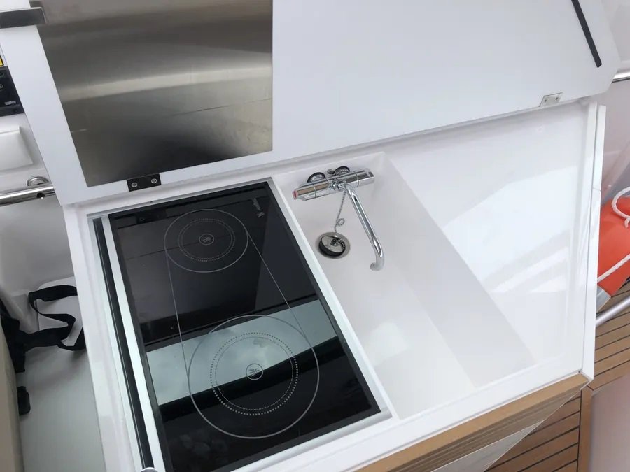 | Outside | Badeplattform, Cockpitdusche, Cockpitkühlschrank, Cockpittisch, elektr. Ankerwinsch, Hardtop, Teak im Cockpit |