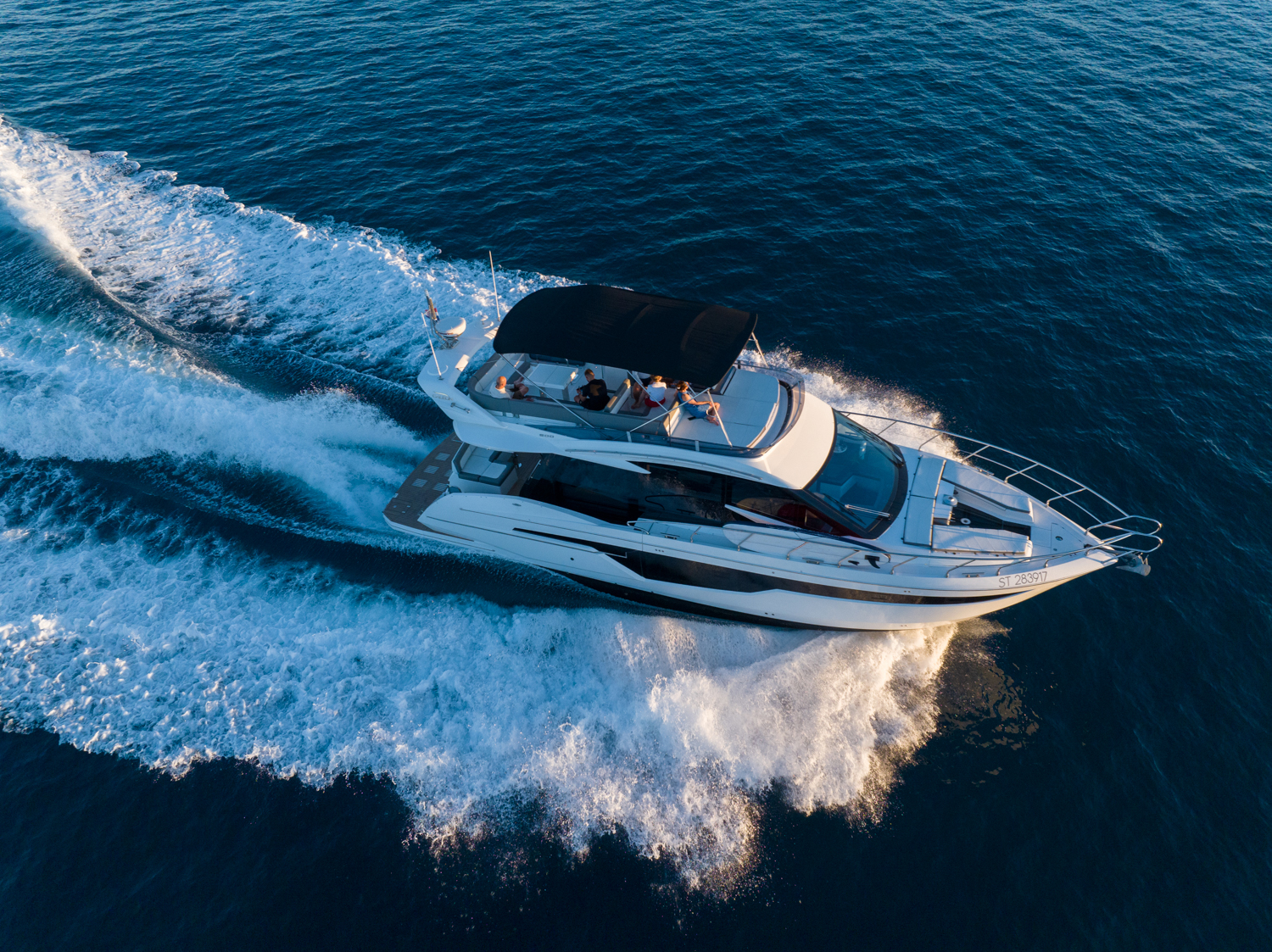 | Outside | 220 V-Landanschluss, Ankerkettenzähler, Badeleiter, Badeplattform (hydr.), Cockpittisch, Elektrogrill, Hardtop, Kuchenbude, Kühlschrank auf Flybridge, Teak im Cockpit, Unterwasserbeleuchtung |