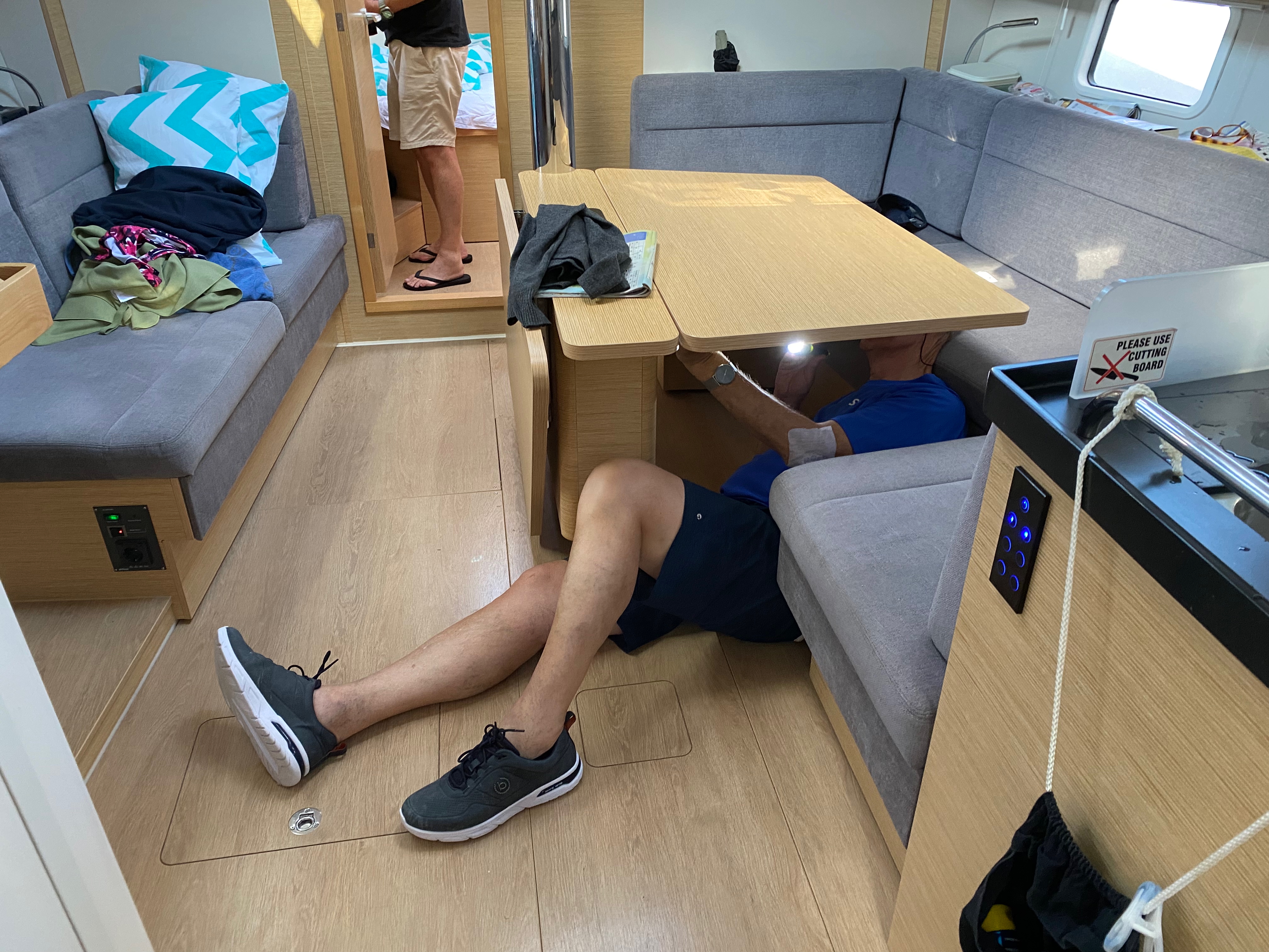 Einge Festmachertaue waren an den Enden ausgefledert und die Seile an den Fendern beschädigt oder zu kurz. Die Segel selbst waren top. Das Großsegel ließ sich aber nur unter großen Kraftaufwand setzen. Die Tasche für das Segel war nicht zu benutzen, da der Reissverschluss nicht funktionierte. Das Einholen/-Rollen des Vorsegels war auch nur mit großer Kraftanstrengung möglich.