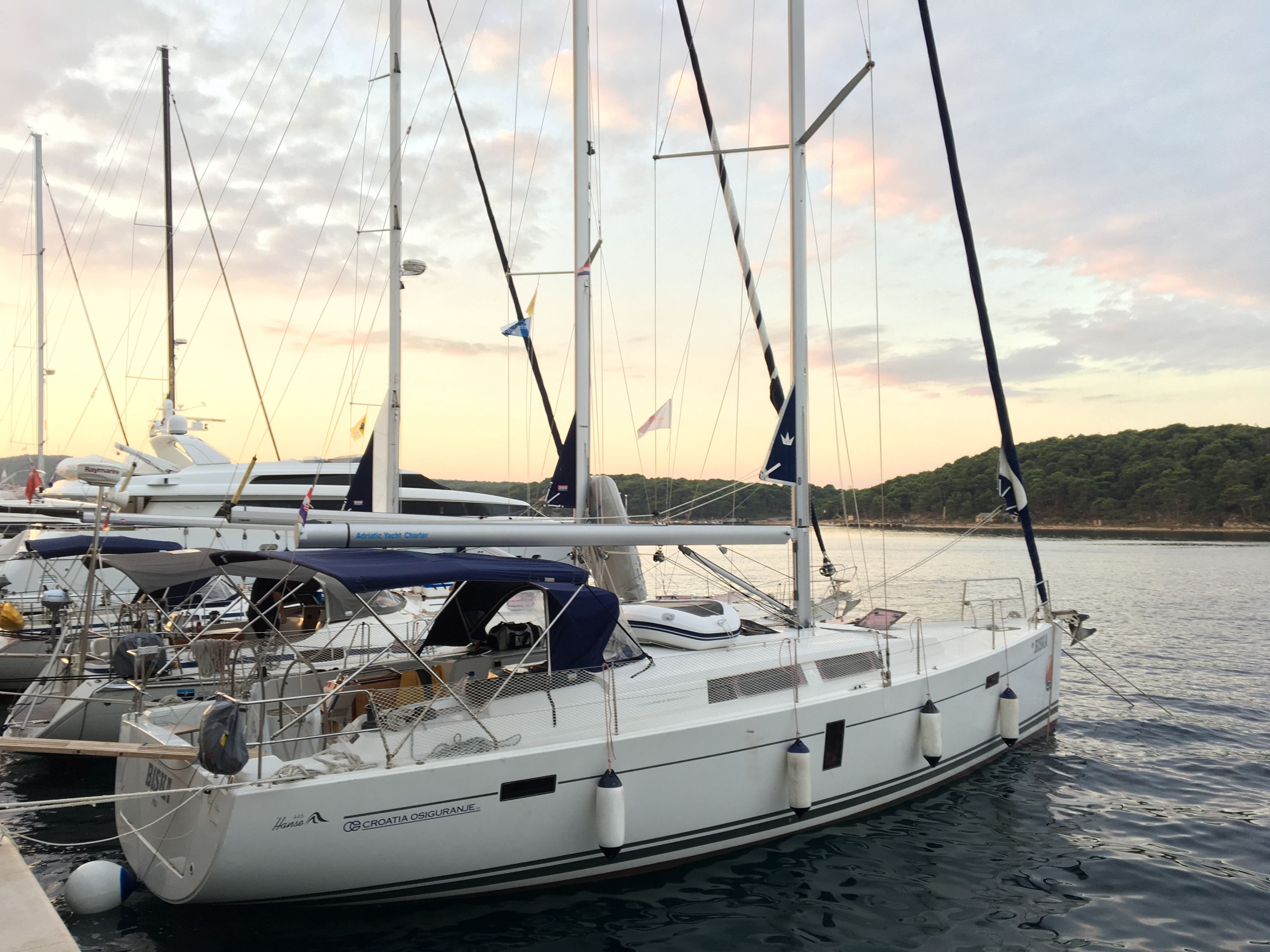 | Navigation | Barometer, Fernglas, GPS mit Kartenplotter im Cockpit, Hafenhandbücher, Handpeilkompass, Navigationsbesteck, Seekarten, Tridata (Log, Echolot, Windm.) |
