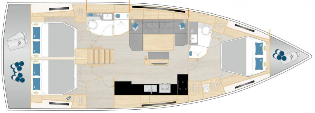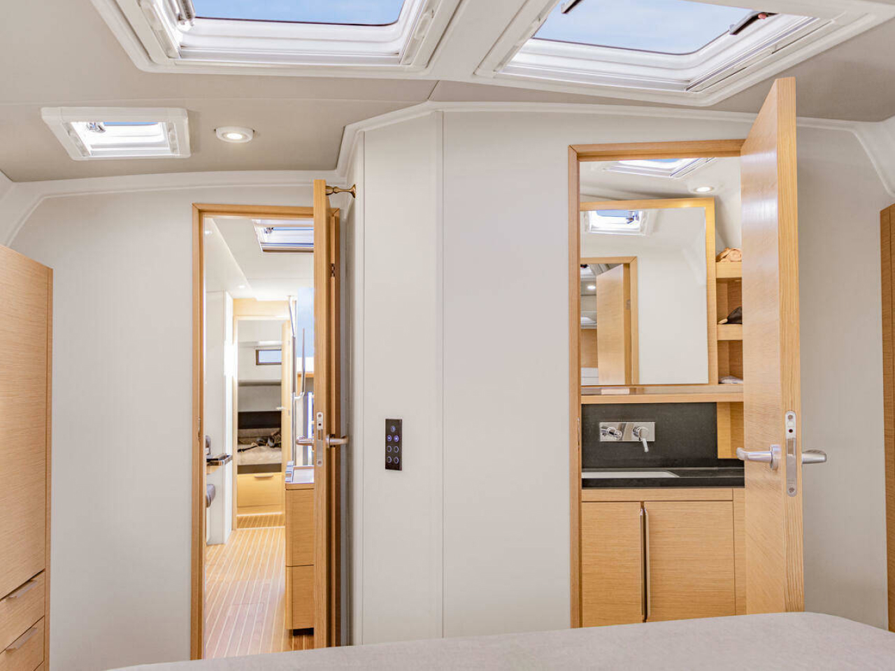 | Safety | Autopilot, Bordwerkzeug, Bugstrahlruder, Feststoffschwimmwesten, Feueraxt, Feuerlöscher, Notpinne, Notsignale, Rettungskragen, Teak-Seitendeck, UKW-Funk |