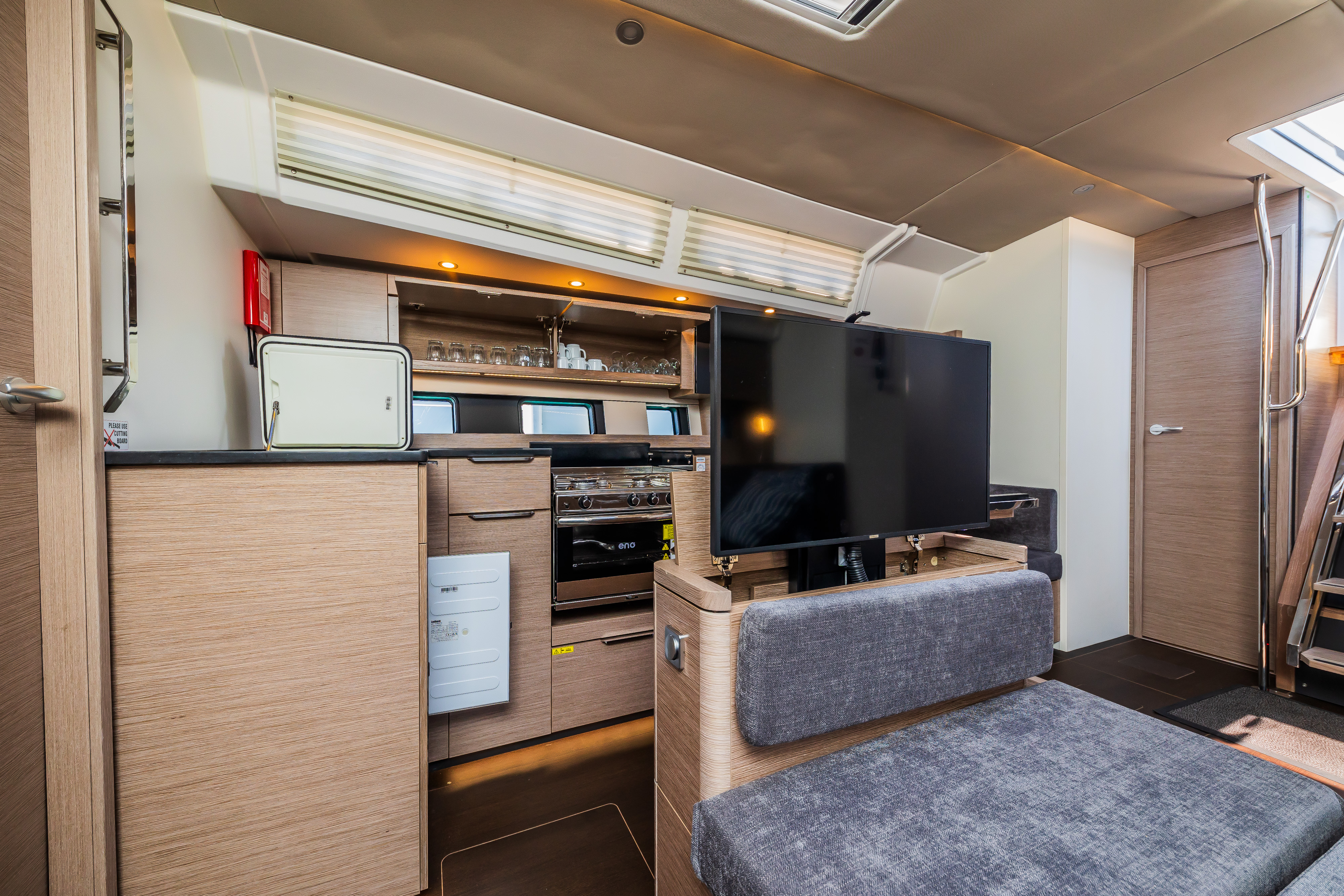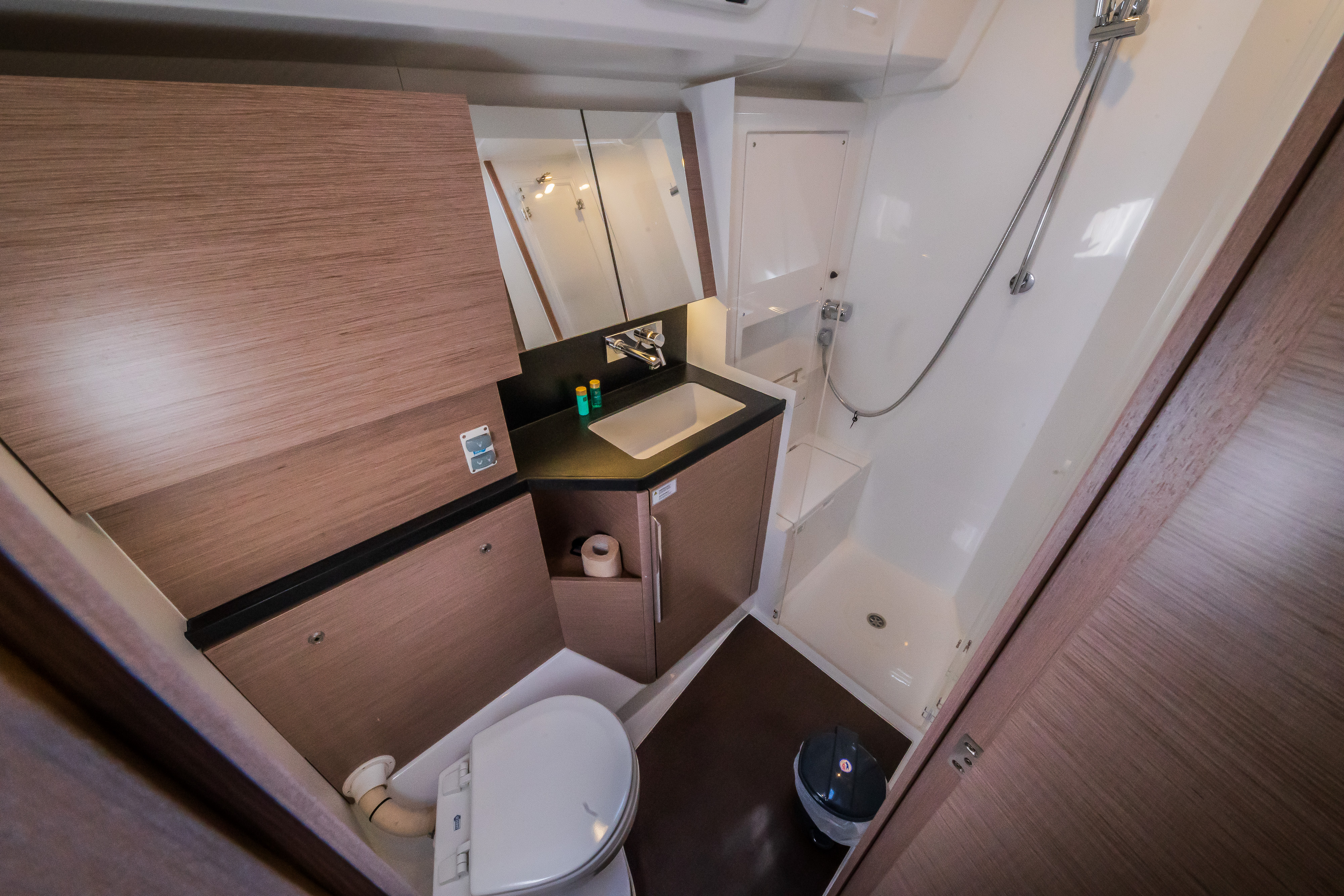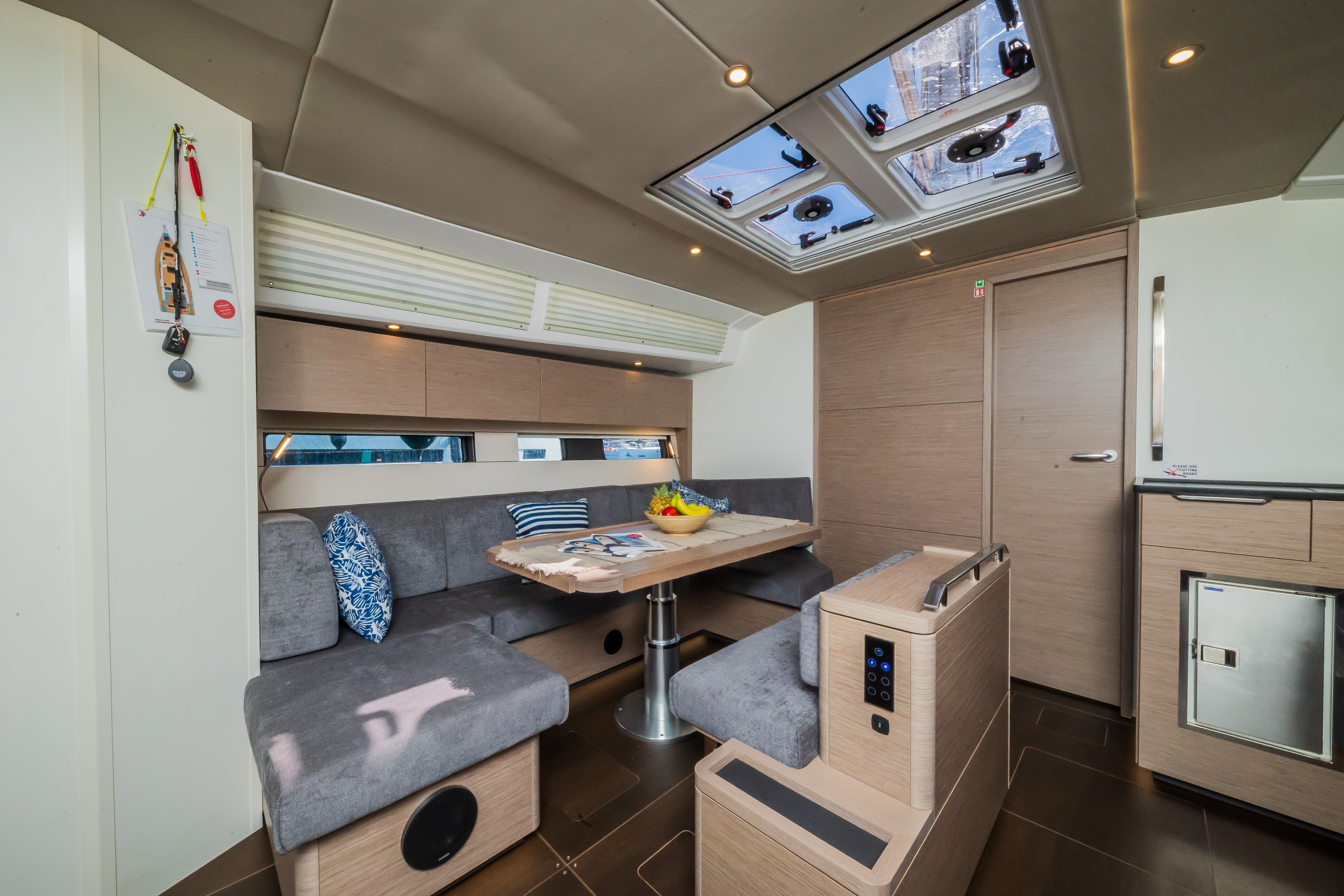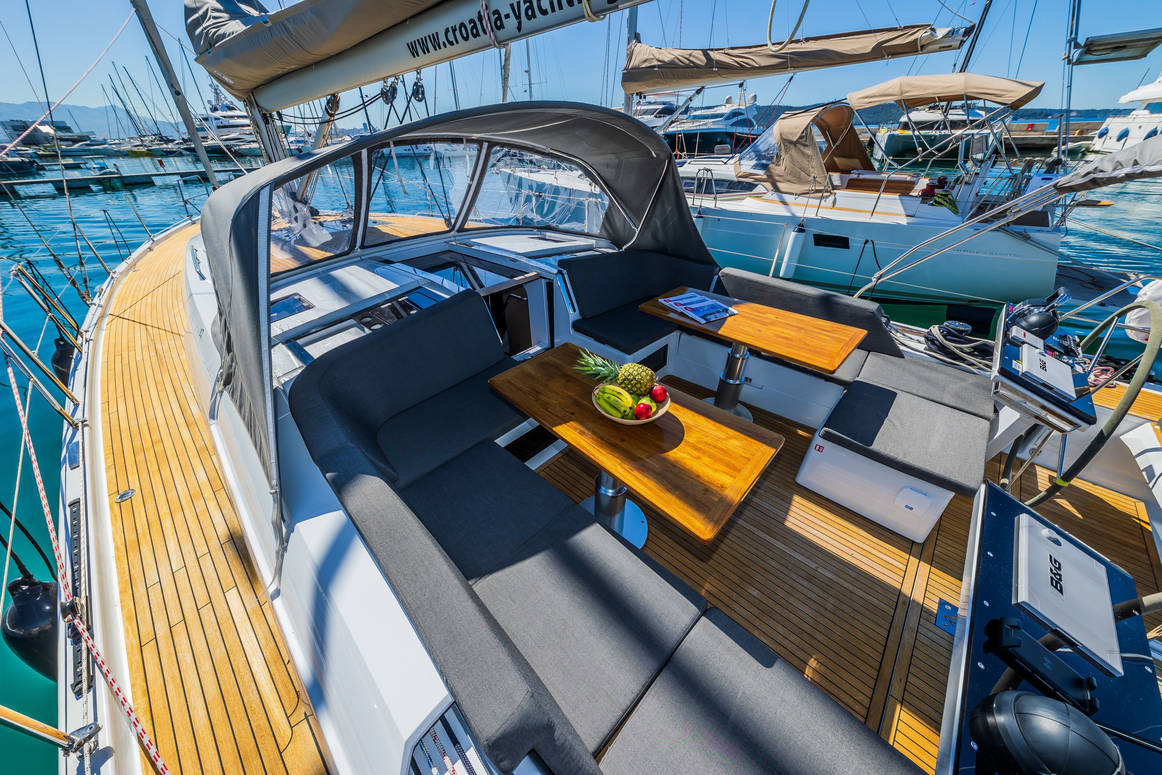 | Outside | Badeplattform, Biminitop, Cockpitdusche, Cockpitlautsprecher, Cockpitpolster, Cockpittisch, elektr. Ankerwinsch, Sprayhood, Teak im Cockpit, Teakdeck |