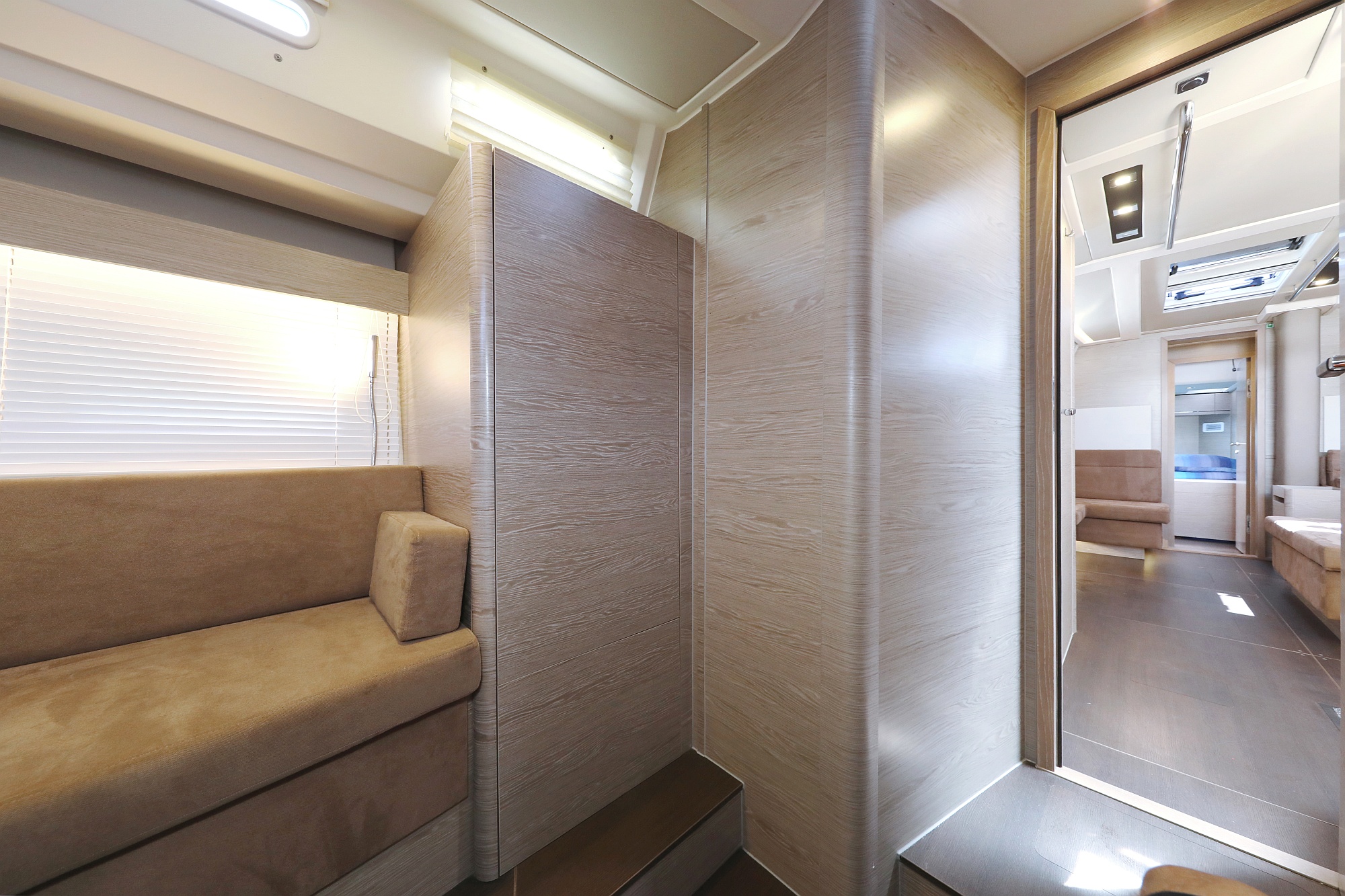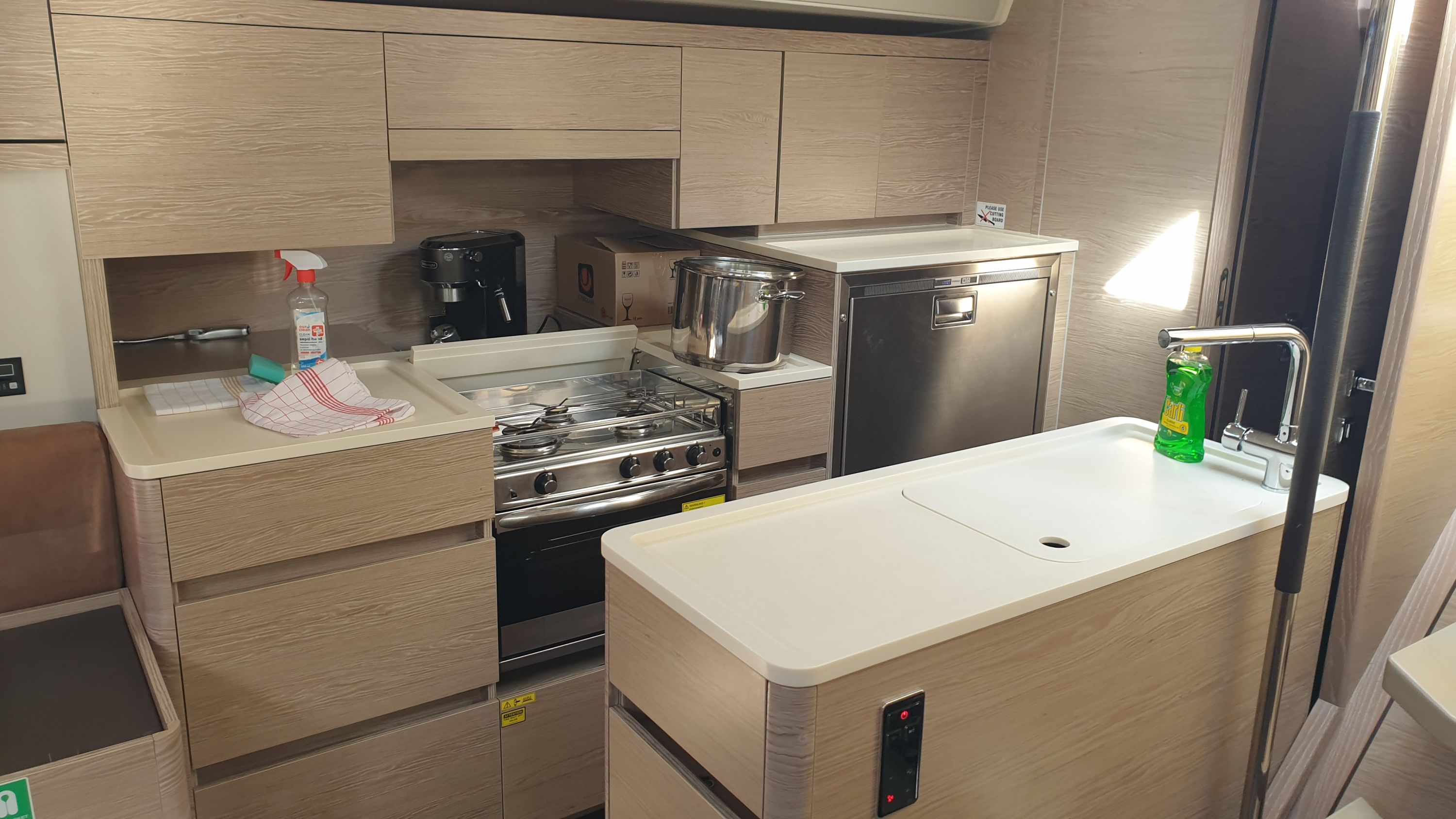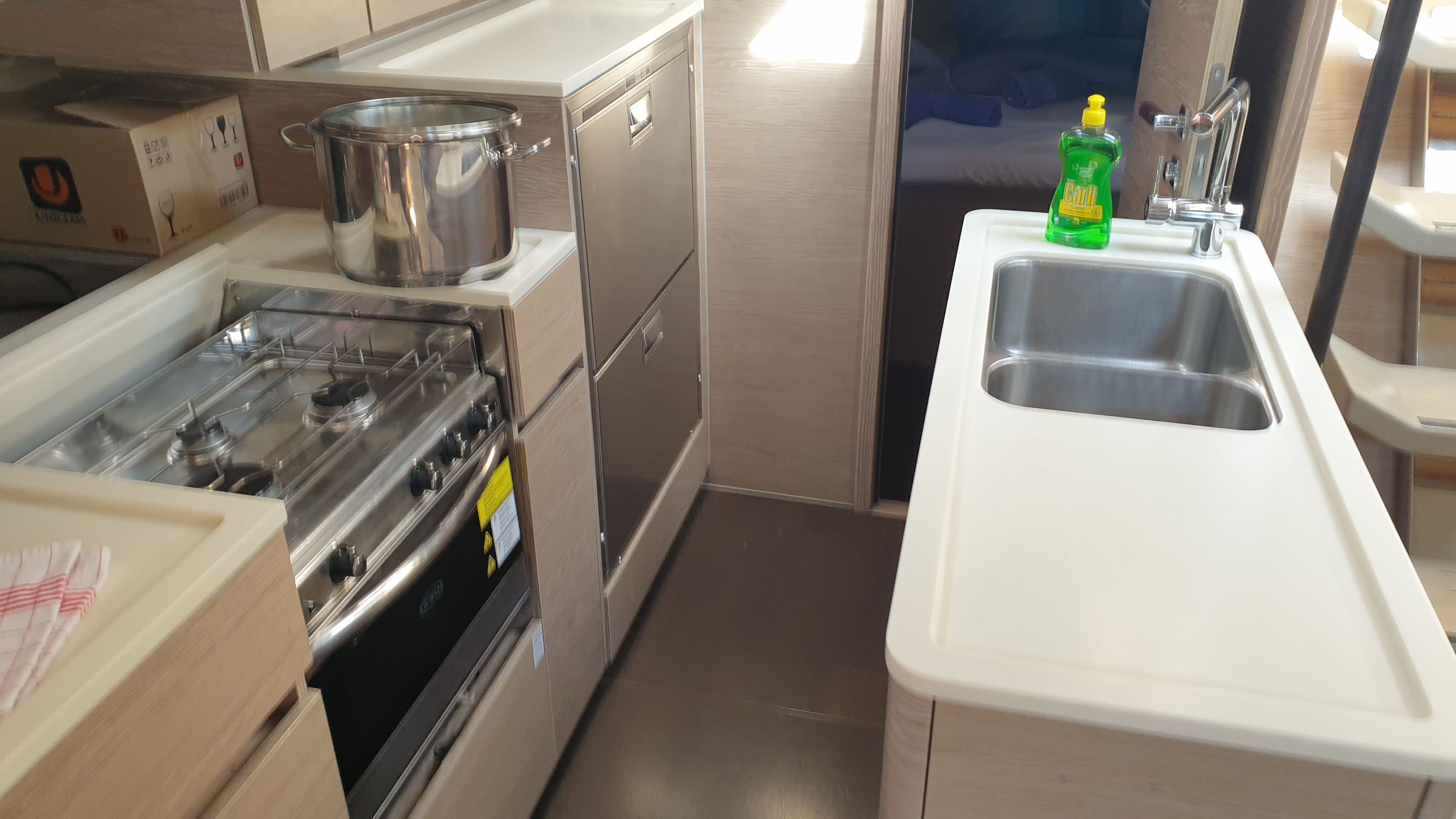 | Inside | Backofen, Gasherd, Gefrierschrank, Generator, Heizung, Inverter 12V/220V, Kaffeemaschine, Klimaanlage (ohne Landstrombedarf), Kühlschrank, Ladegerät, Pantryausstattung, Radio mit CD, TV, Warmwasser |