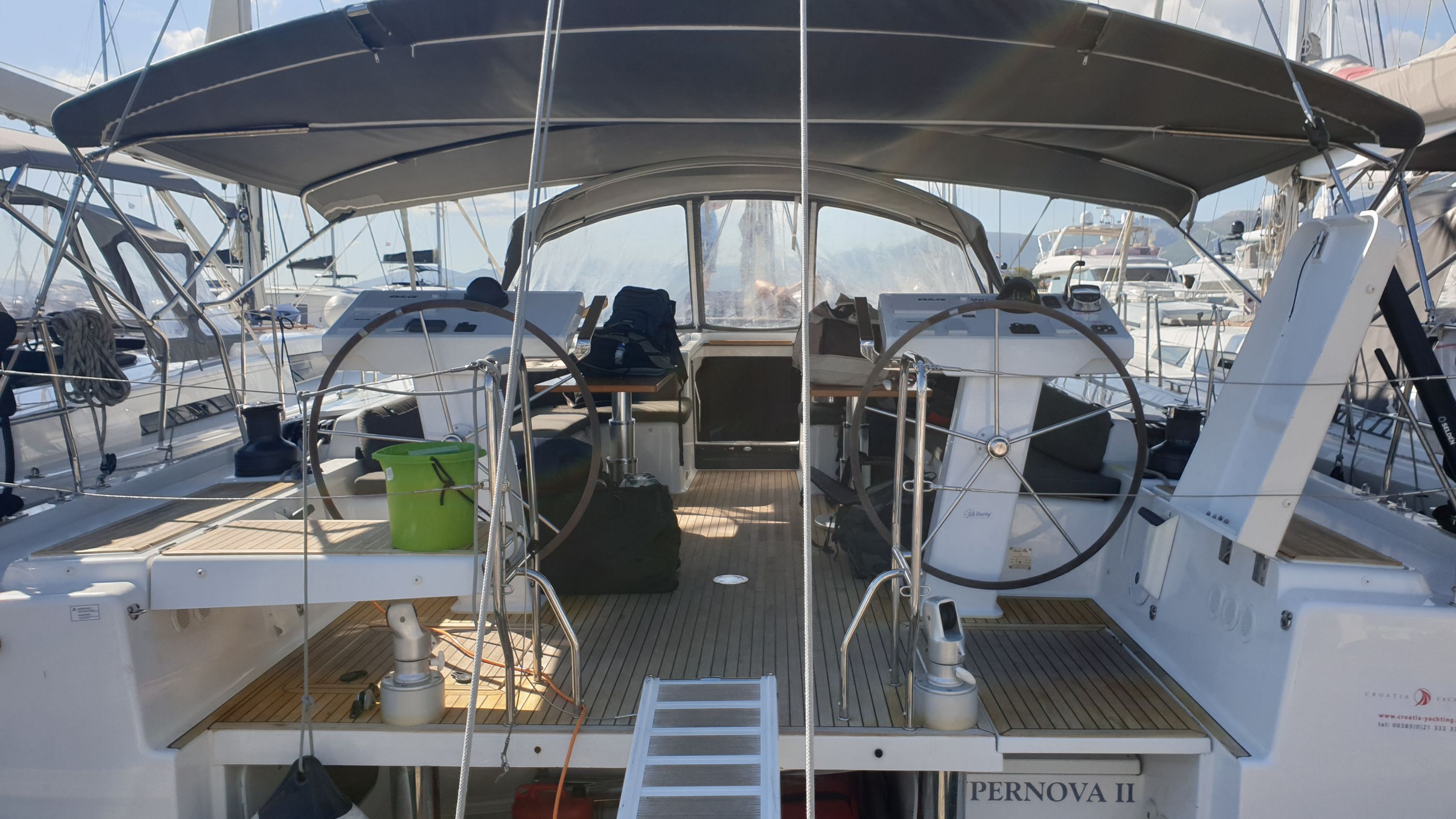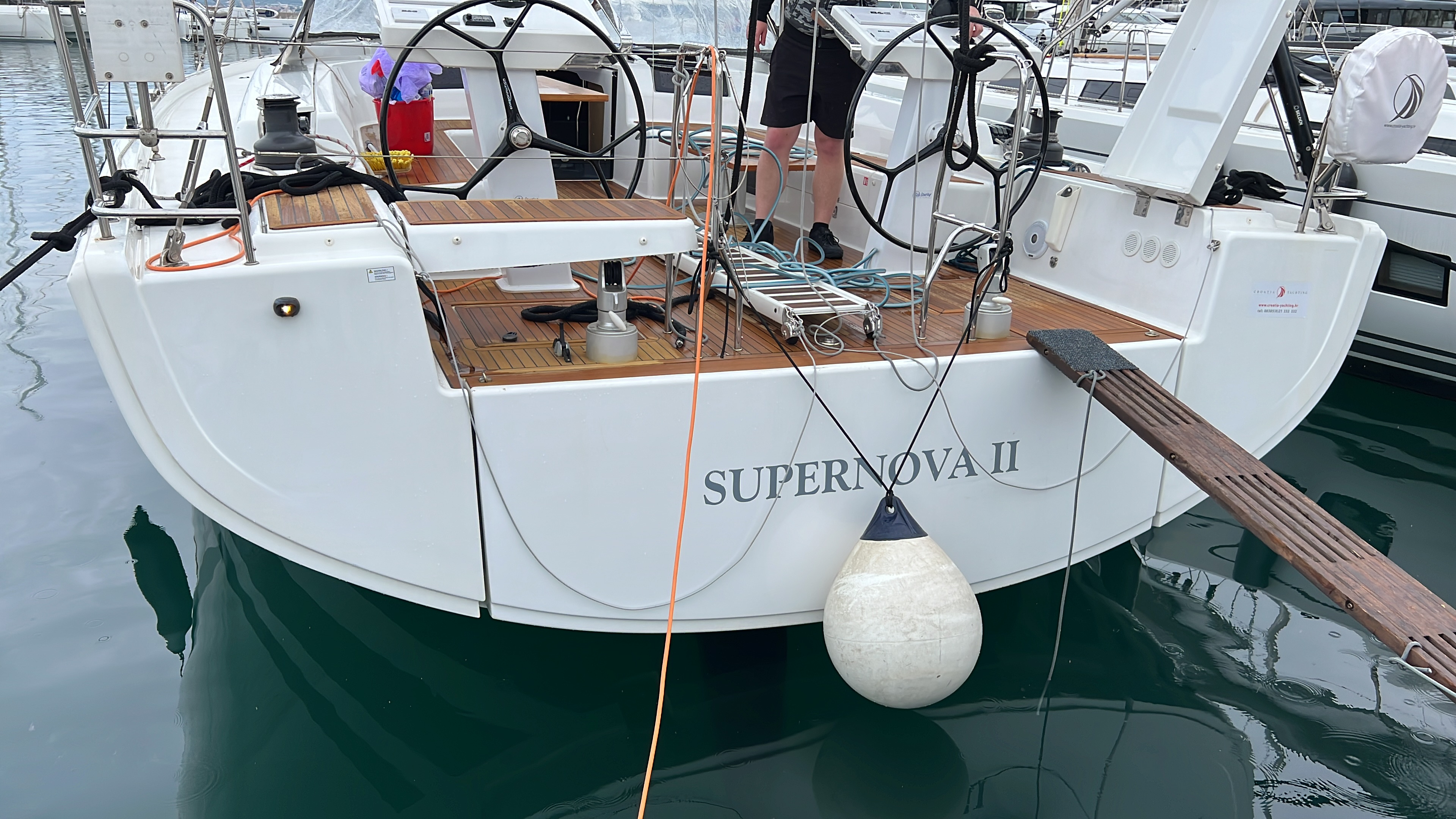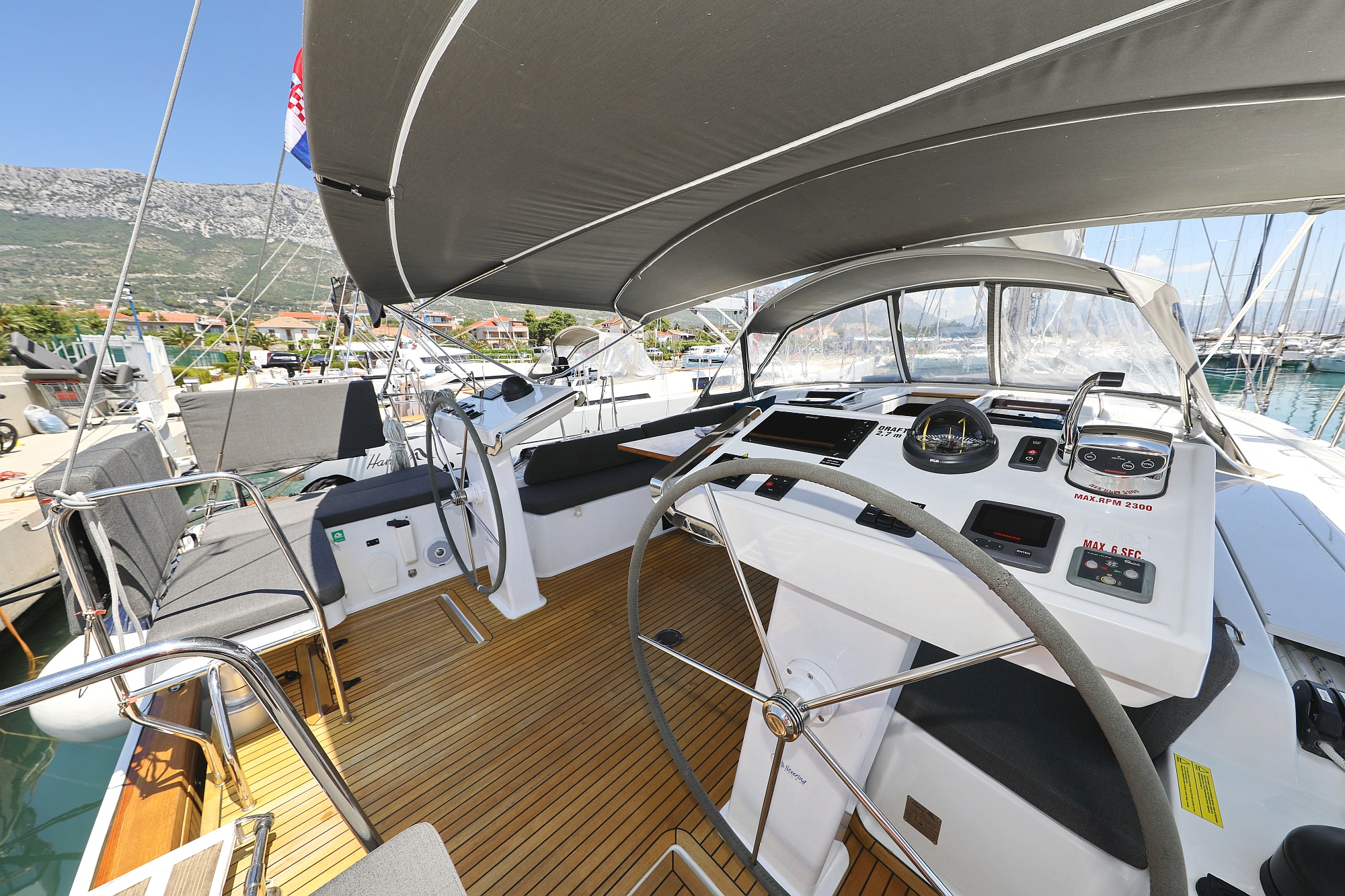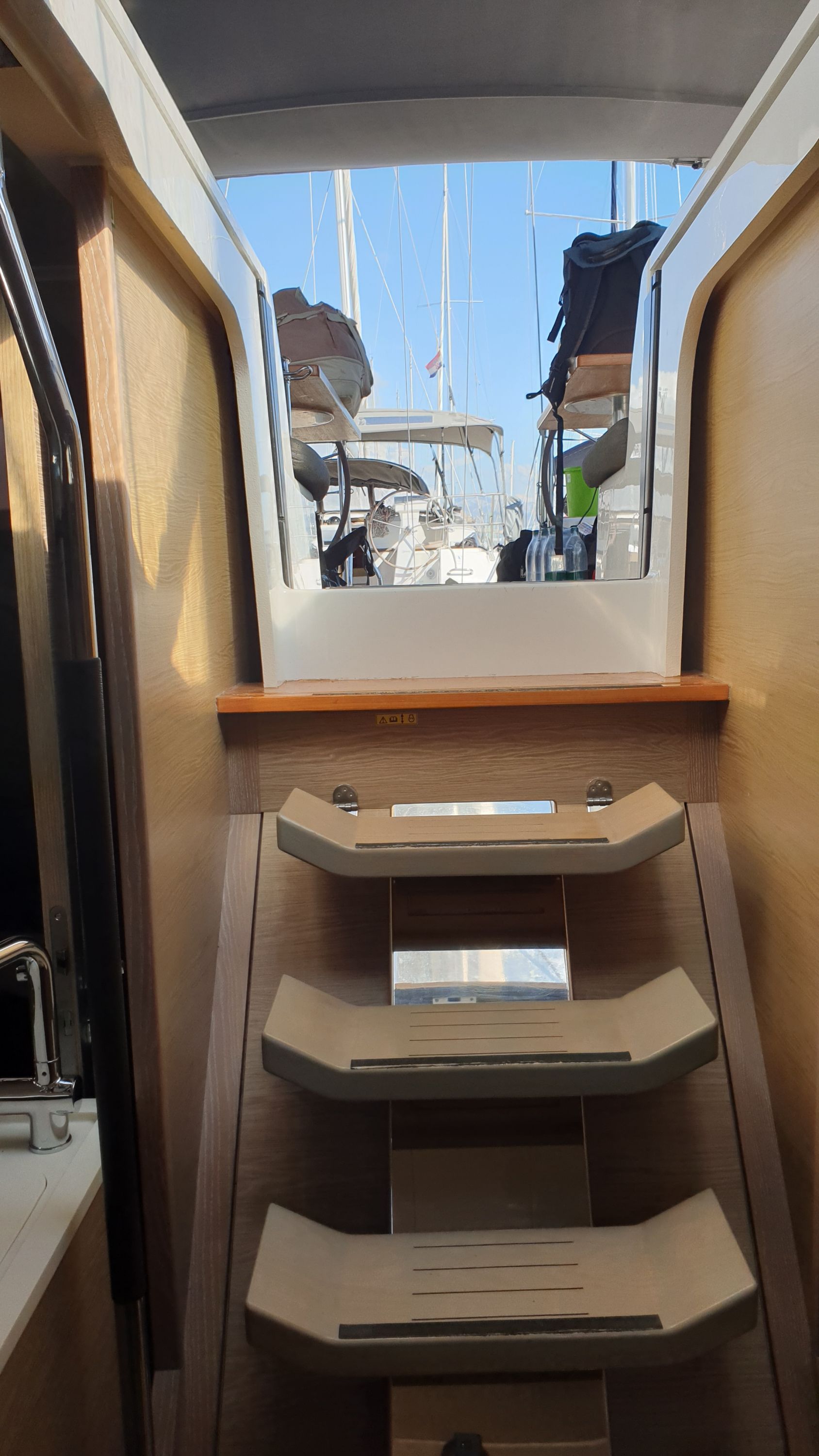| Outside | Badeplattform (hydr.), Biminitop, Cockpitdusche, Cockpitlautsprecher, Cockpitpolster, Cockpittisch, Deckpolster, elektr. Großwinsch, Fallwinschen, Sprayhood, Teak im Cockpit |