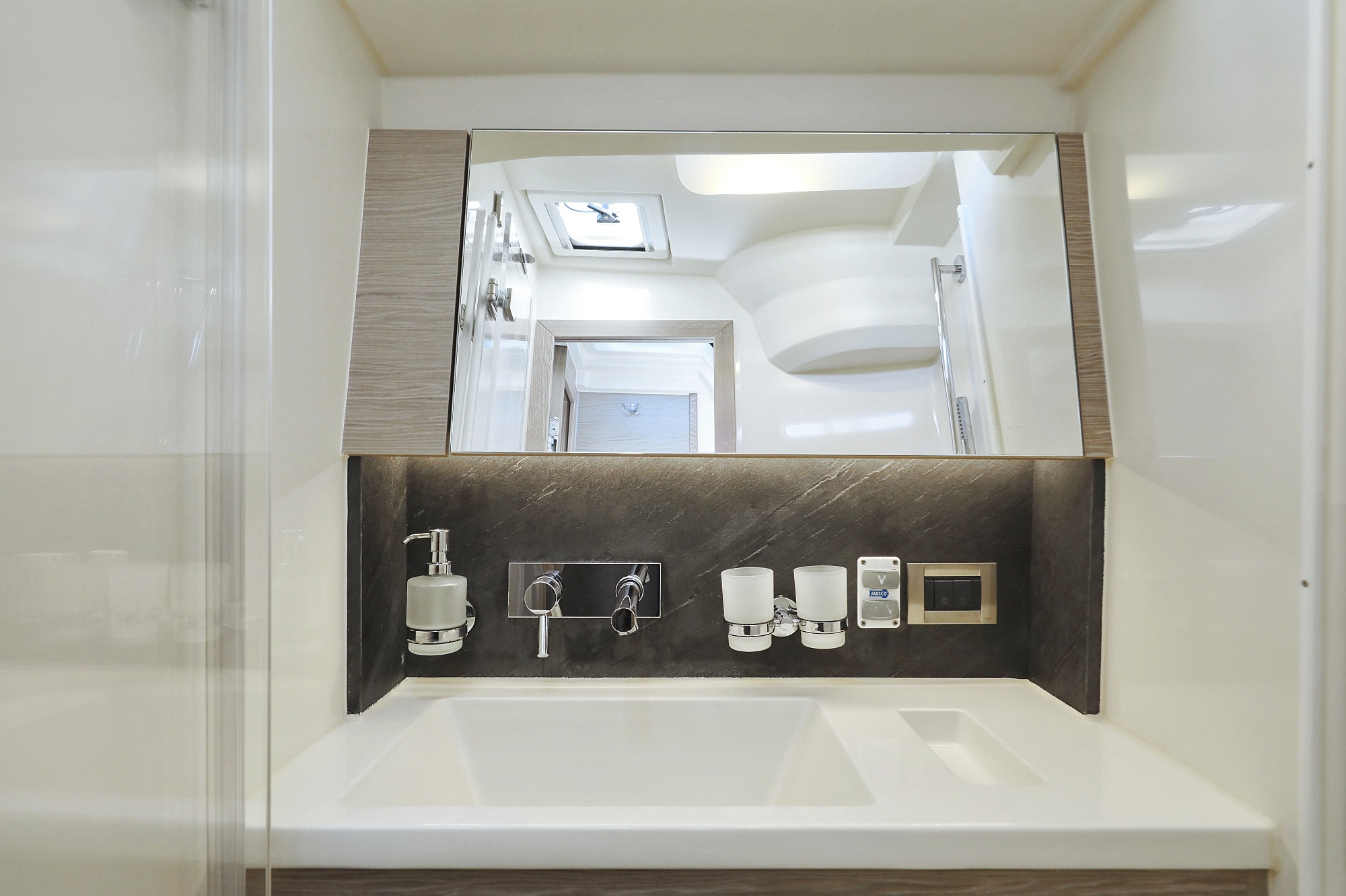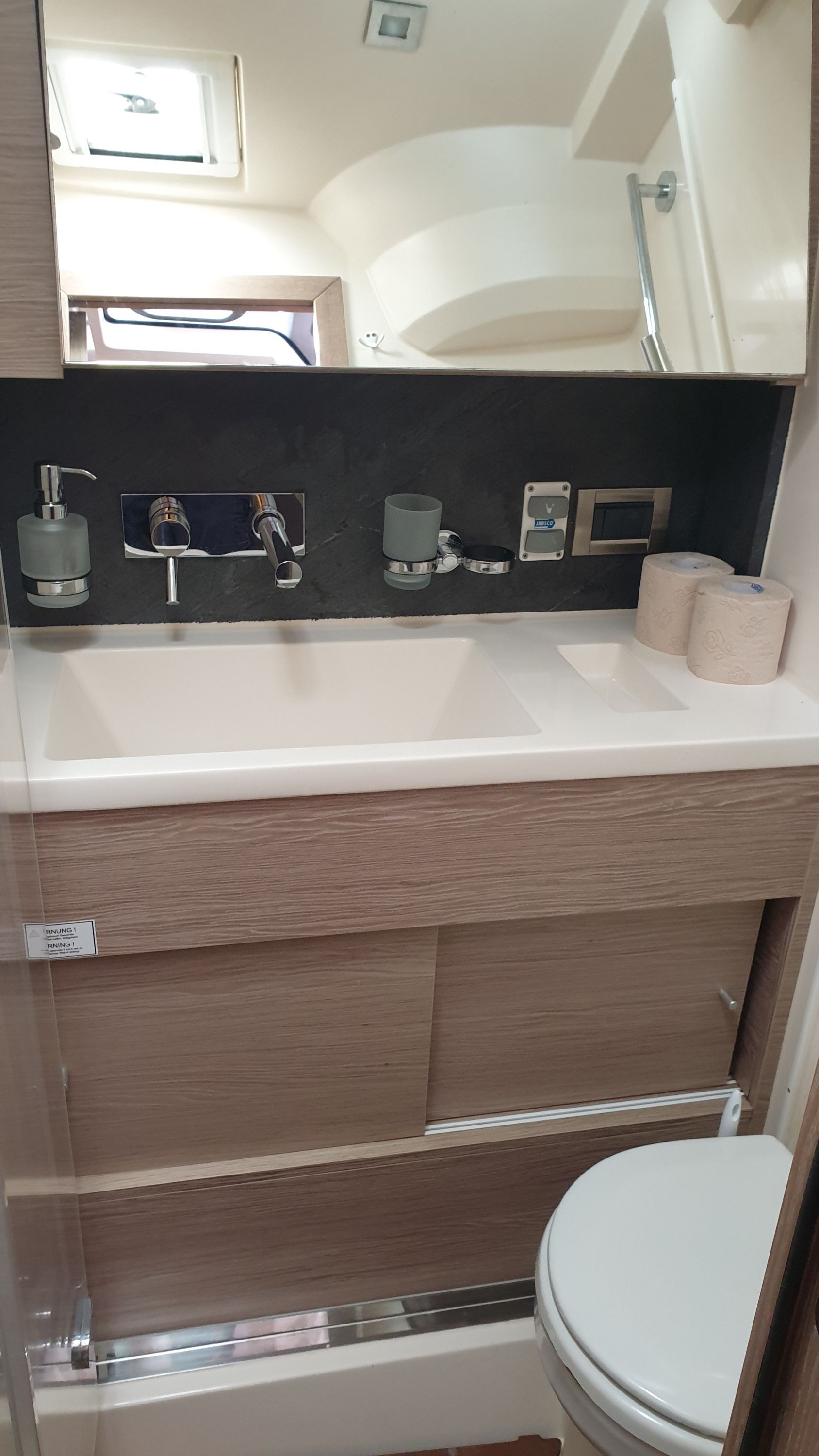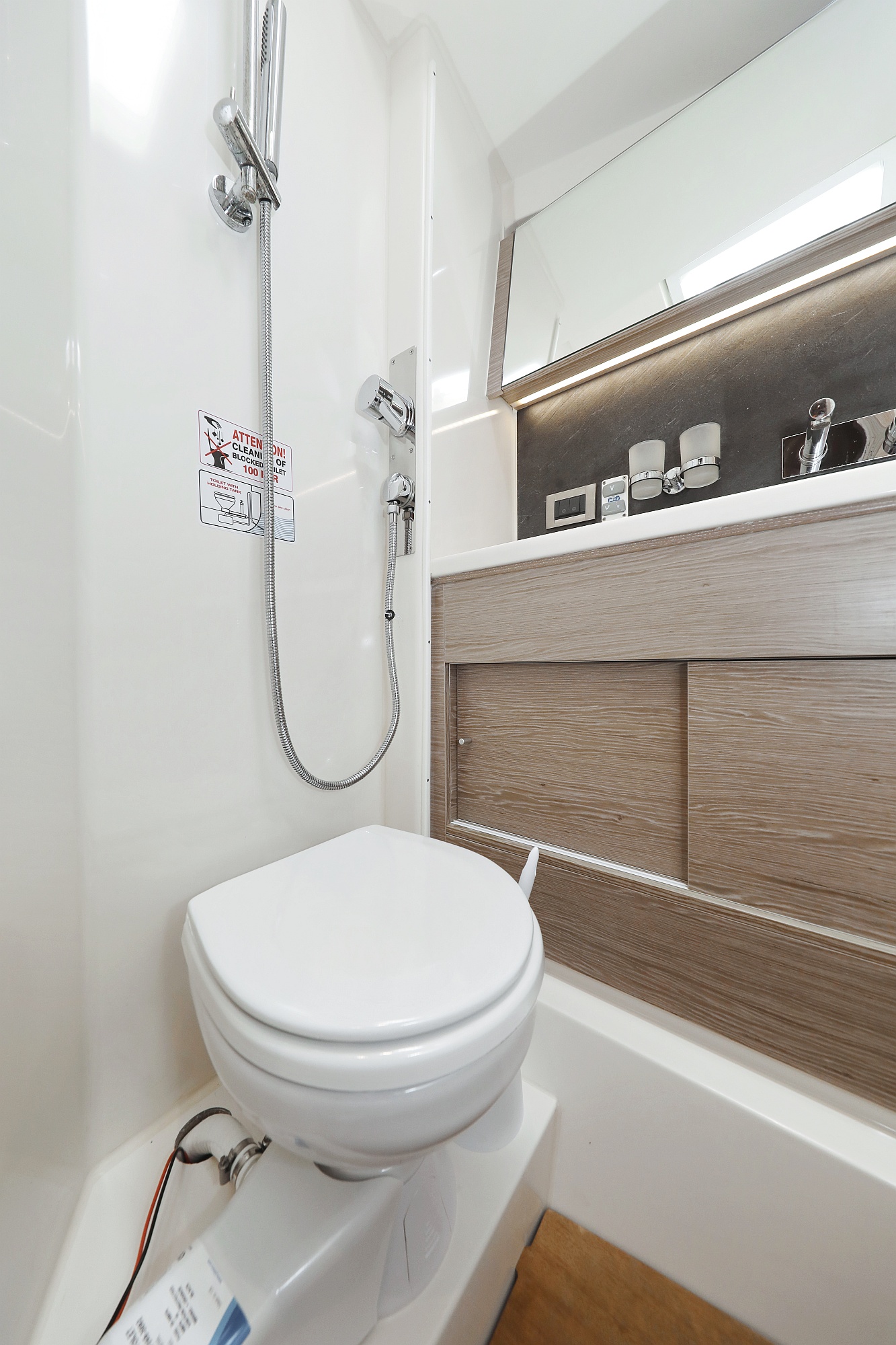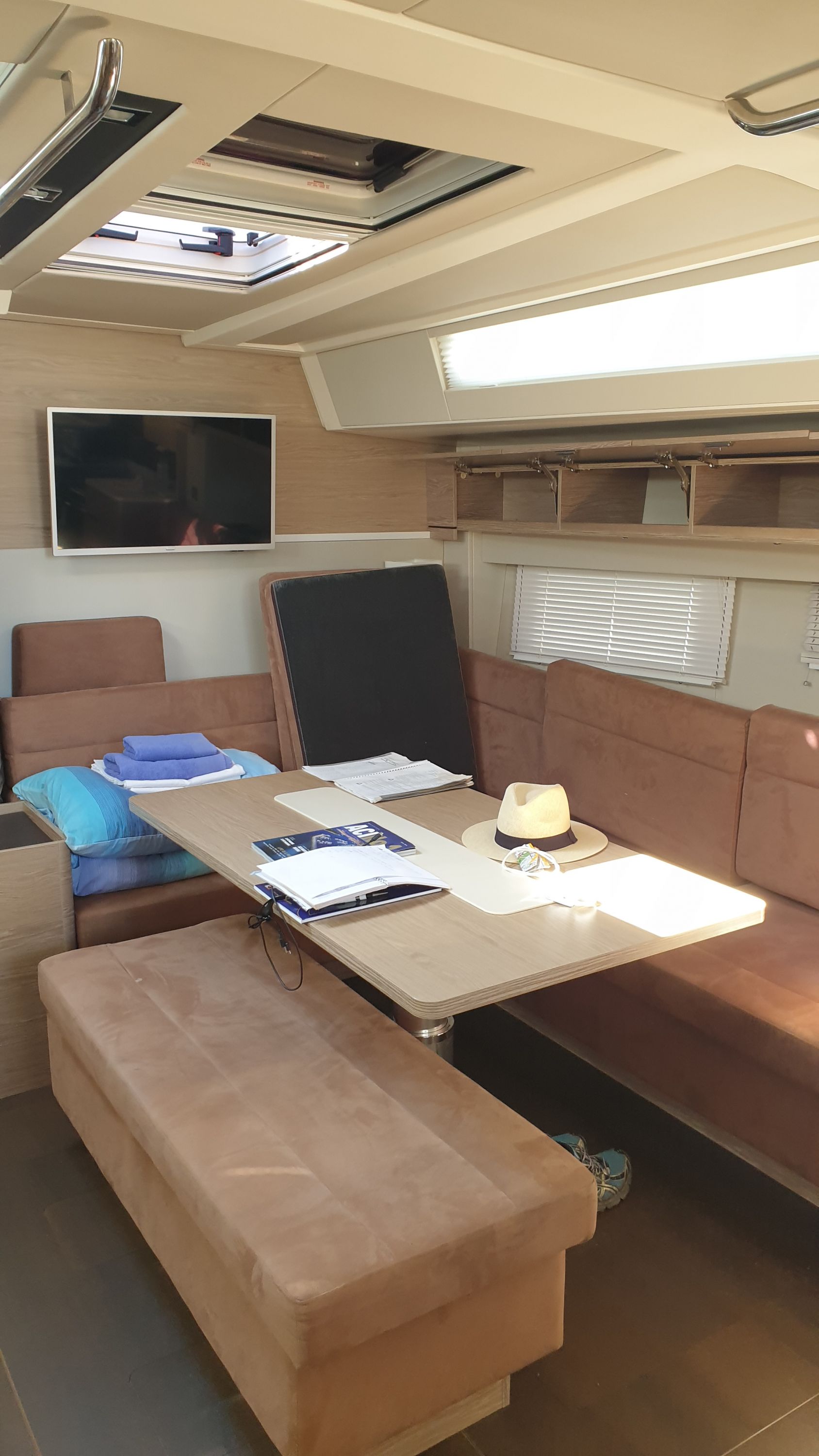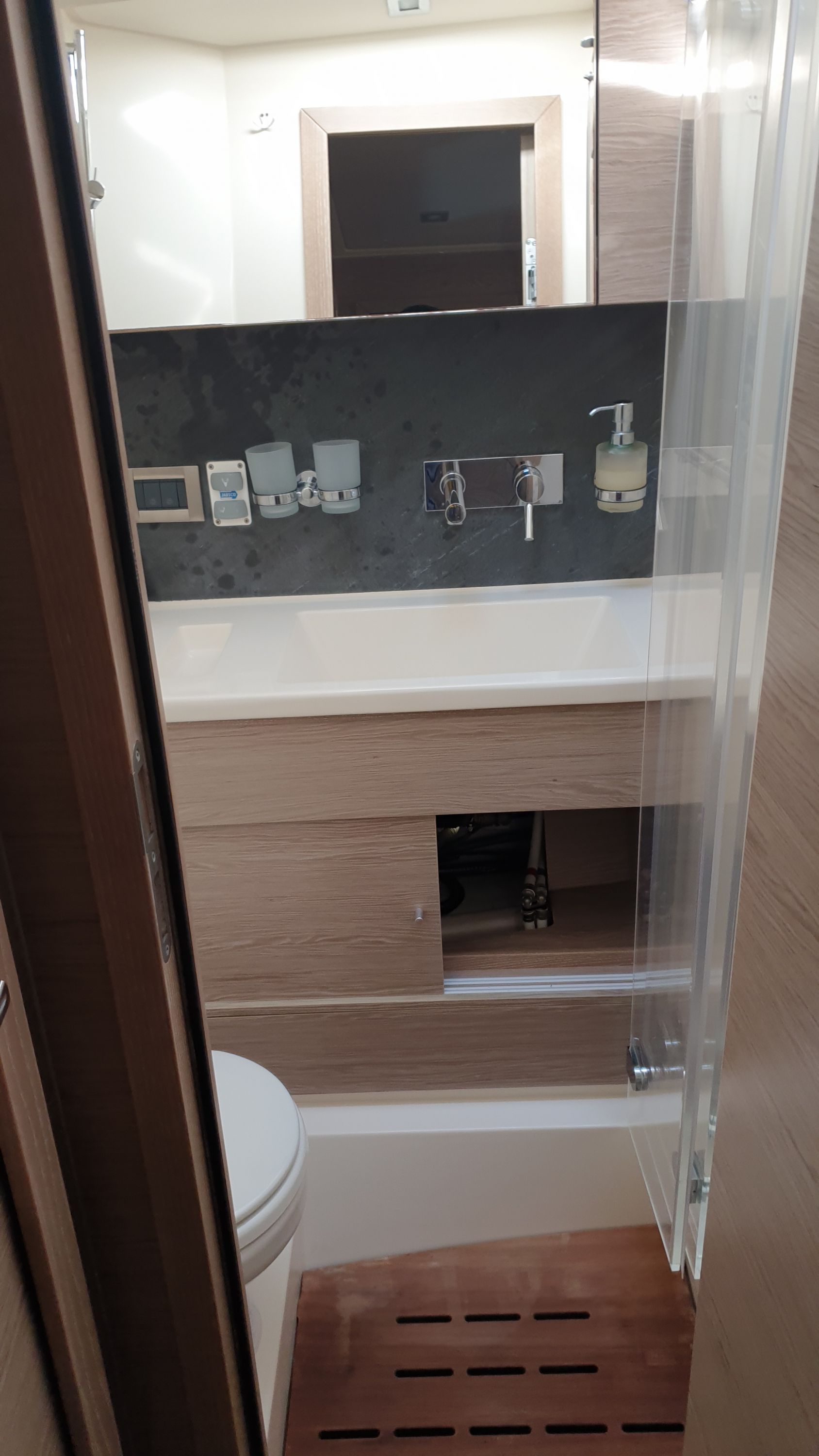 | Outside | Badeplattform (hydr.), Biminitop, Cockpitdusche, Cockpitlautsprecher, Cockpitpolster, Cockpittisch, Deckpolster, elektr. Großwinsch, Fallwinschen, Sprayhood, Teak im Cockpit |