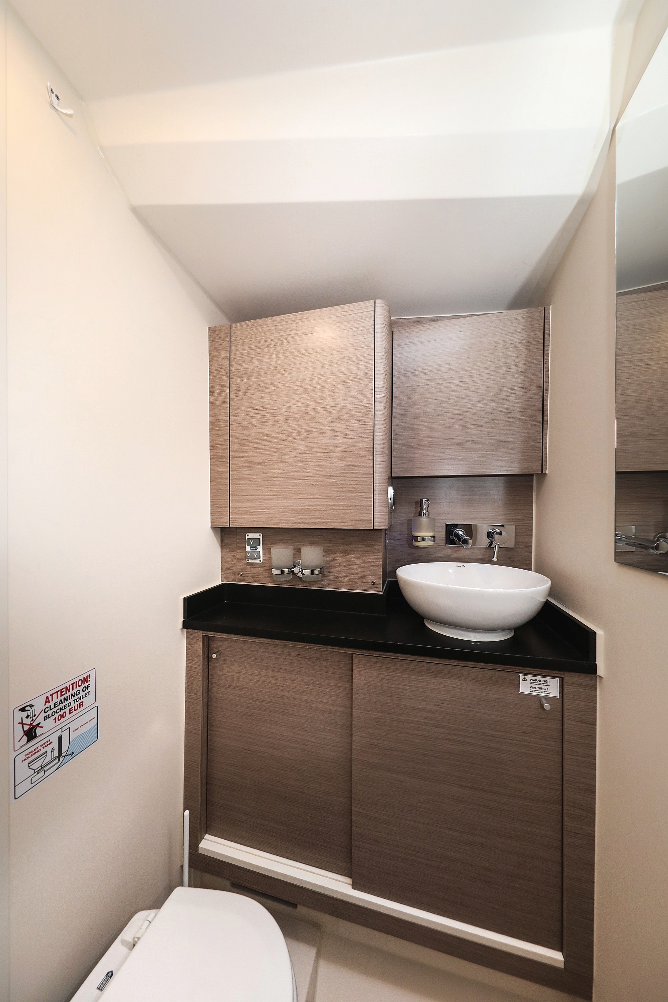 | Inside | FUSION Sound System, Gasherd mit Backofen, Gefrierschrank, Generator, Geschirrspüler, Heizung, Inverter 12V/220V, Kaffeemaschine, Klimaanlage (ohne Landstrombedarf), Kühlschrank, Ladegerät, Pantryausstattung, Radio mit CD, TV, Warmwasser, WC (elektr.), Weinkühlschrank |