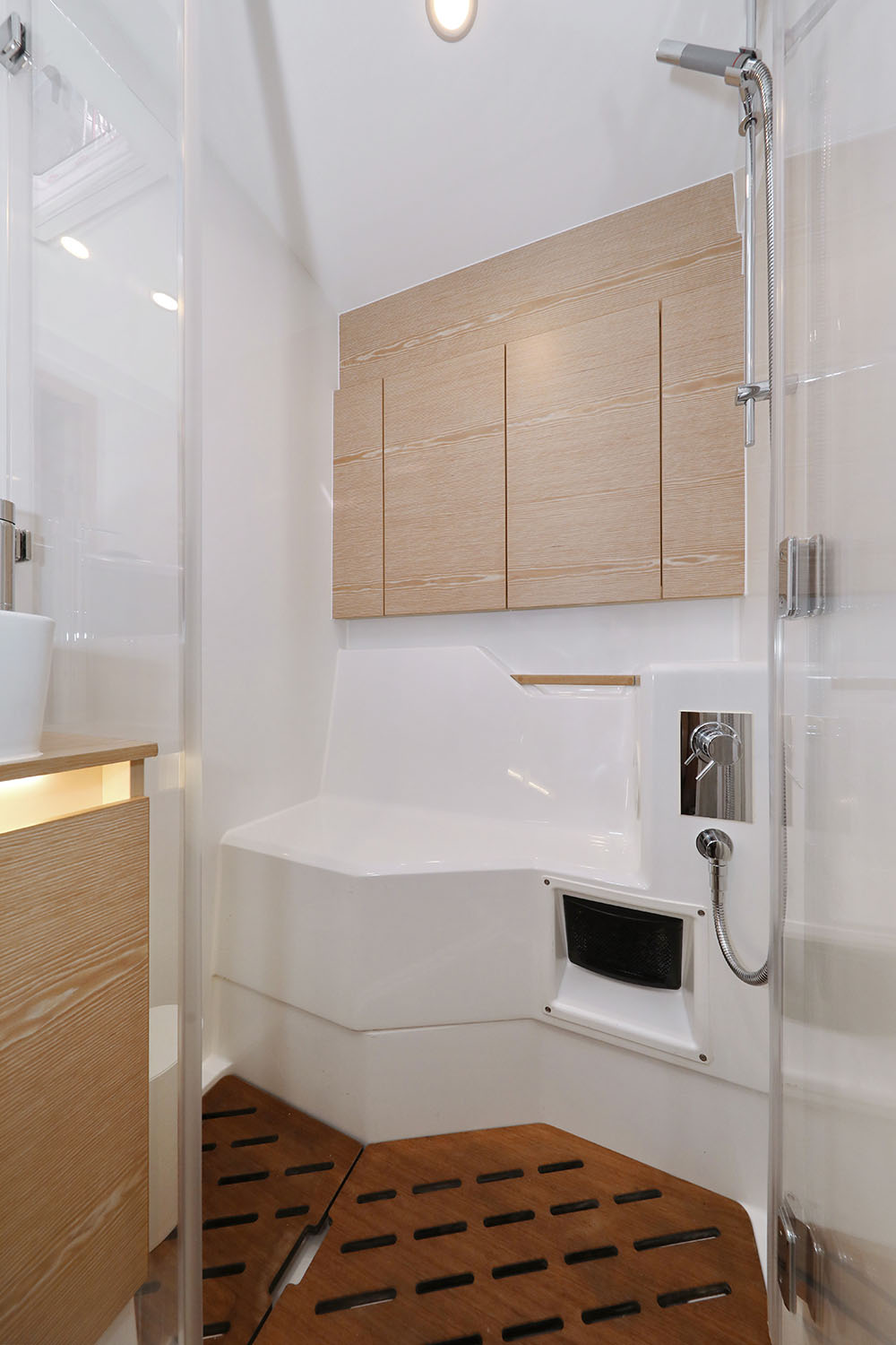 | Outside | Badeplattform, Cockpitdusche, Cockpitkühlschrank, Cockpitlautsprecher, Grill, Hardtop, hydraul. Gangway, Sprayhood, Teak im Cockpit, Teakdeck |