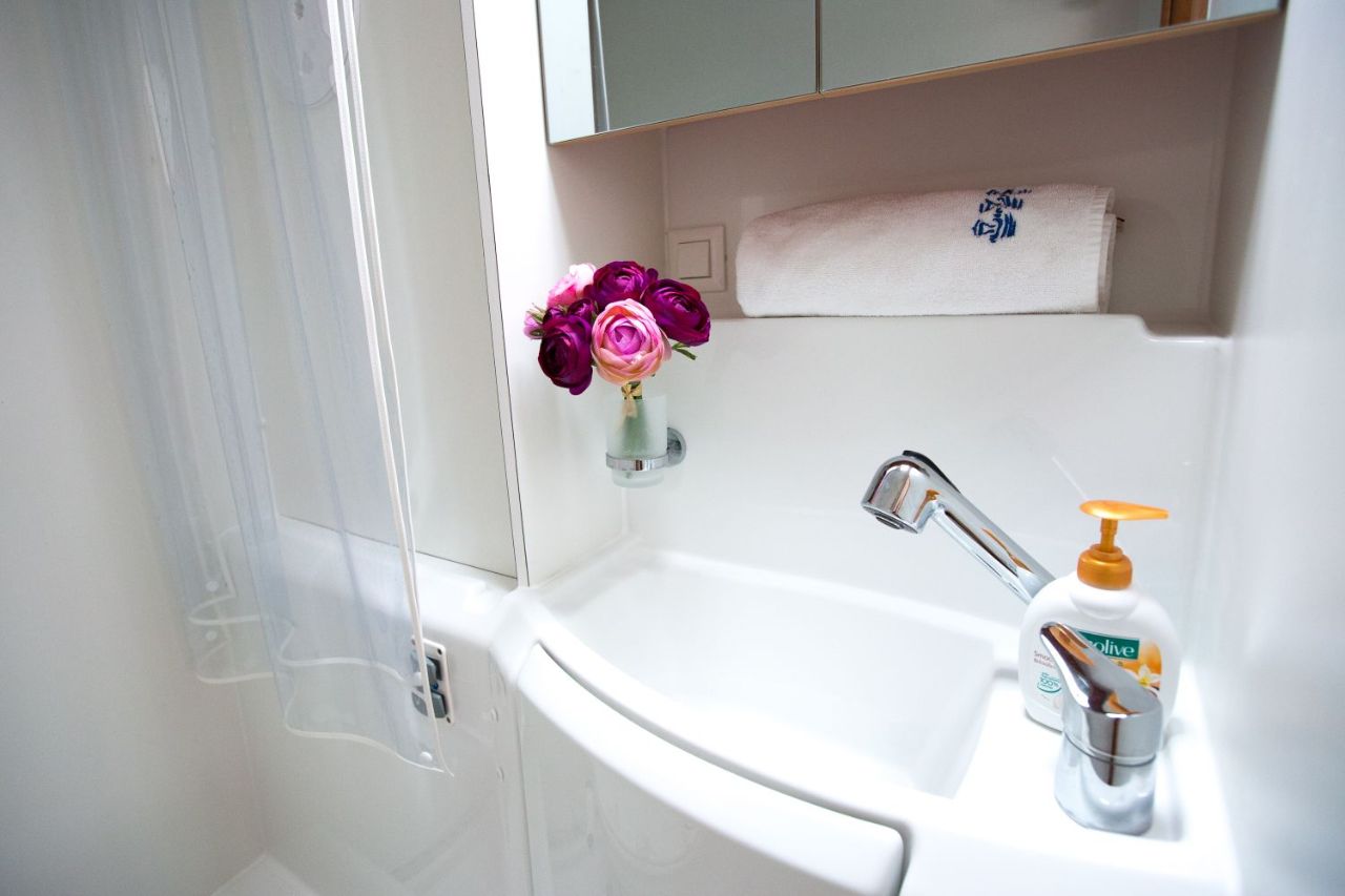 | Inside | Backofen, Borduhr, Fäkalientank, Frischwasserpumpe, Heizung, Inverter 12V/220V, Kühlschrank, Ladegerät, Lautsprecher im Salon, Mikrowelle, Pantryausstattung, Radio mit CD, USB, Bluetooth, Ventilator, Ventilatoren in Kabinen, Warmwasser, WC (elektr.) |