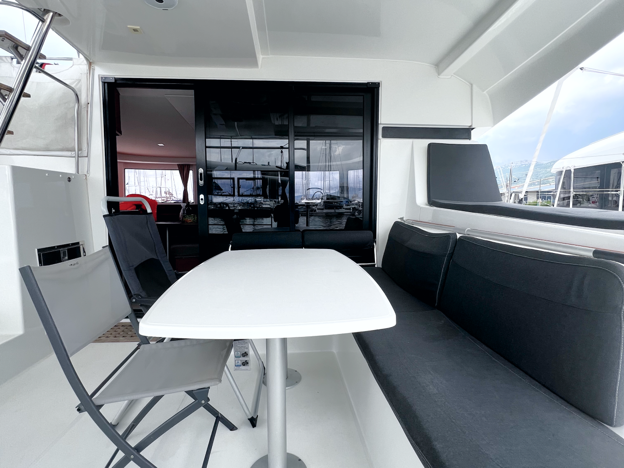 | Outside | 220 V-Landanschluss, Anker mit Kette, Badeleiter, Bootshaken, Cockpitdusche, Cockpitlautsprecher, Cockpitpolster, Cockpittisch, elektr. Ankerwinsch, elektr. Winsch, Fender, Festmacherleinen, Gangway, Hardtop, Liegestühle, Sonnendeck, Wasserschlauch, Winschen |