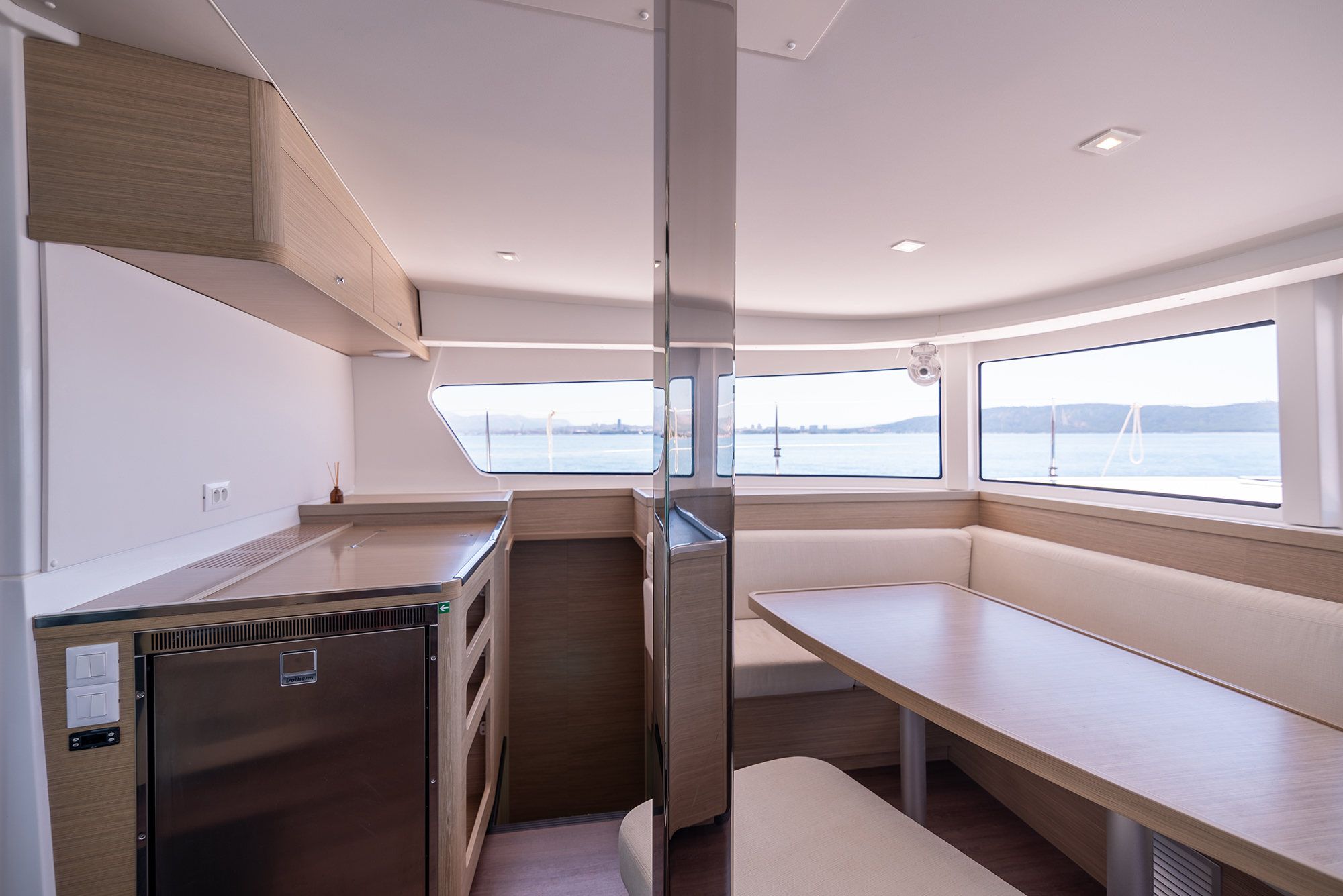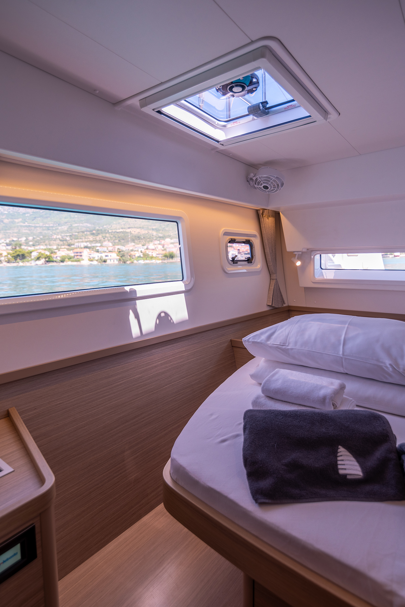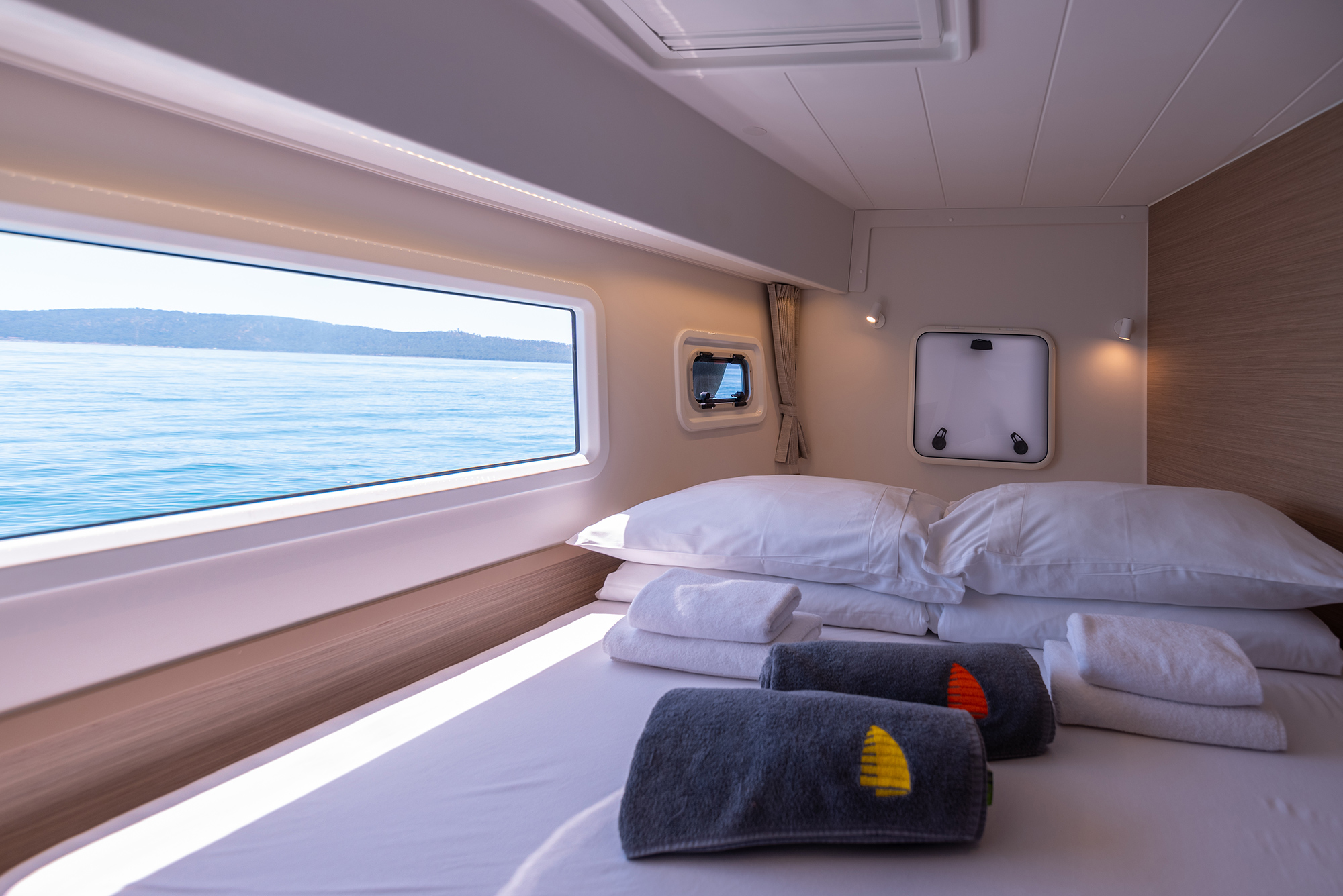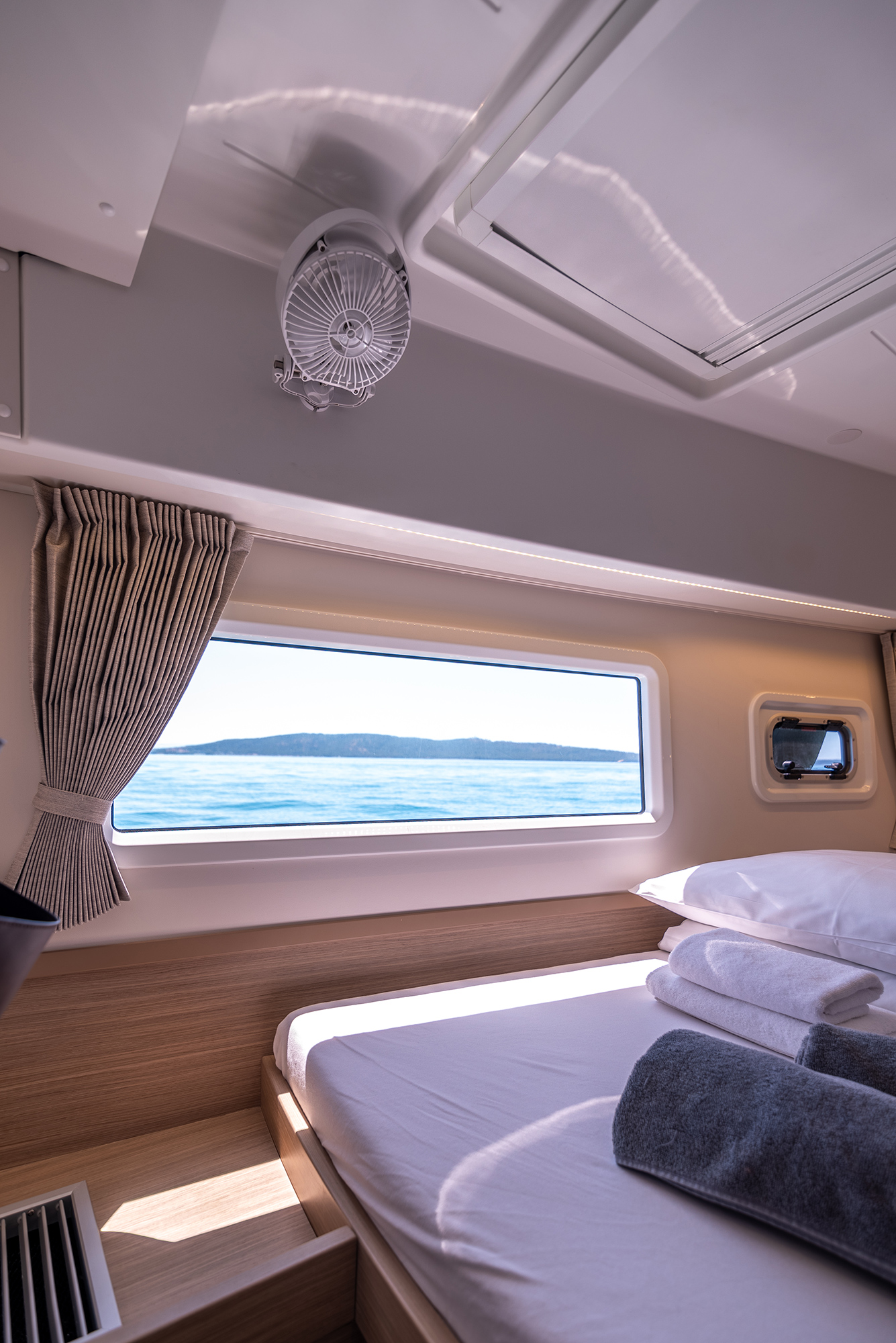 | Inside | 2. Kühlschrank, 220V Steckdosen, Bluetooth Player, Eiswürfelmaschine, Fön, FUSION Sound System, Generator, Inverter 12V/220V, Kaffeemaschine, Klimaanlage (ohne Landstrombedarf), Ladegerät, Pantryausstattung, Radio, TV, Ventilator, Ventilatoren in Salon und Kabinen, Wasserkocher, Watermaker |