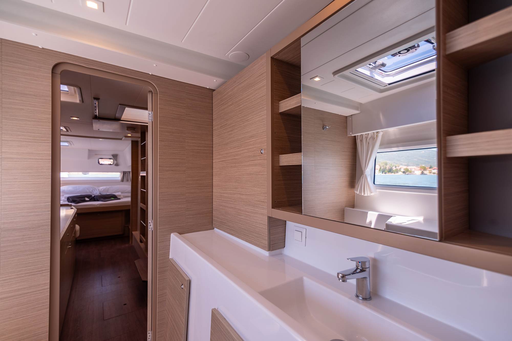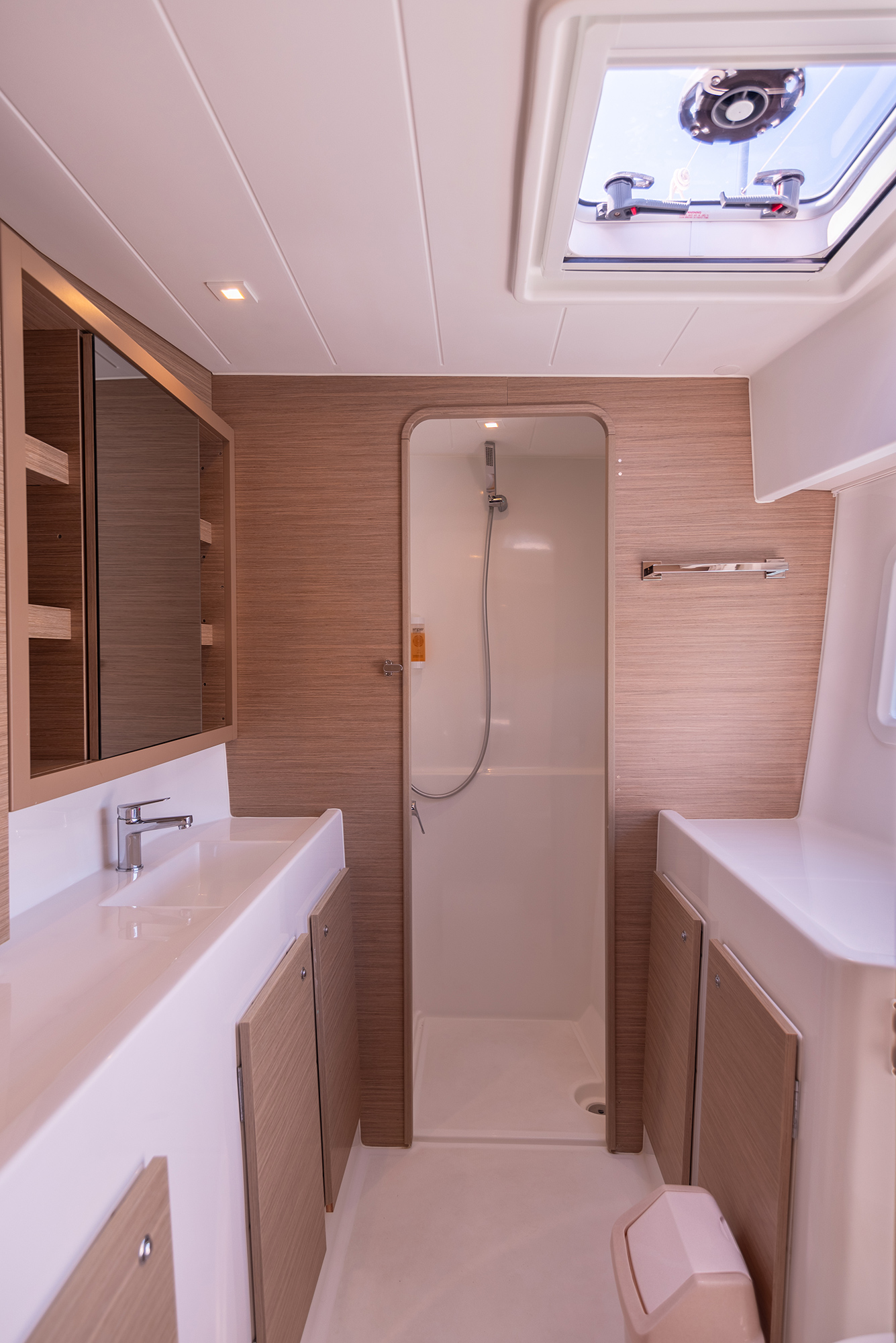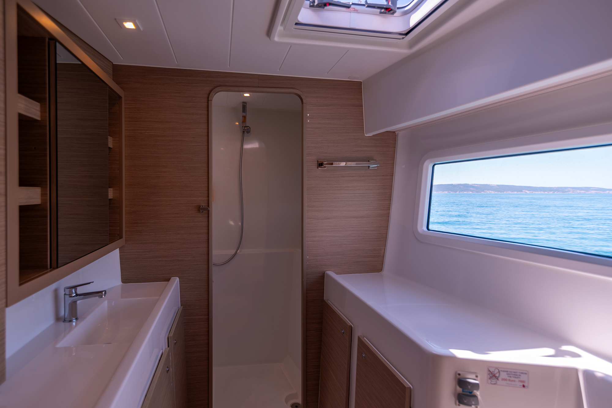 | Inside | 2. Kühlschrank, 220V Steckdosen, Bluetooth Player, Eiswürfelmaschine, Fön, FUSION Sound System, Generator, Inverter 12V/220V, Kaffeemaschine, Klimaanlage (ohne Landstrombedarf), Ladegerät, Pantryausstattung, Radio, TV, Ventilator, Ventilatoren in Salon und Kabinen, Wasserkocher, Watermaker |