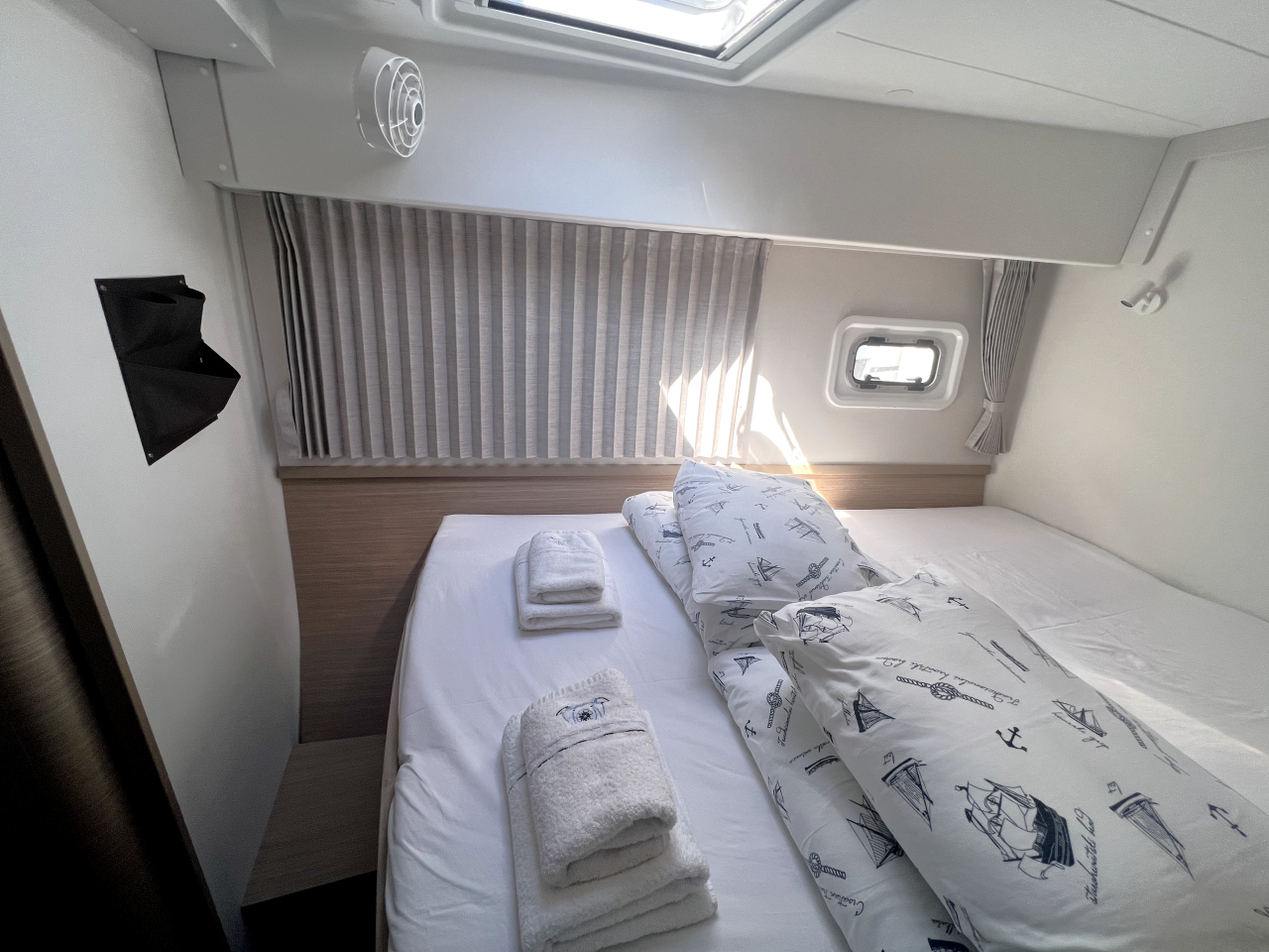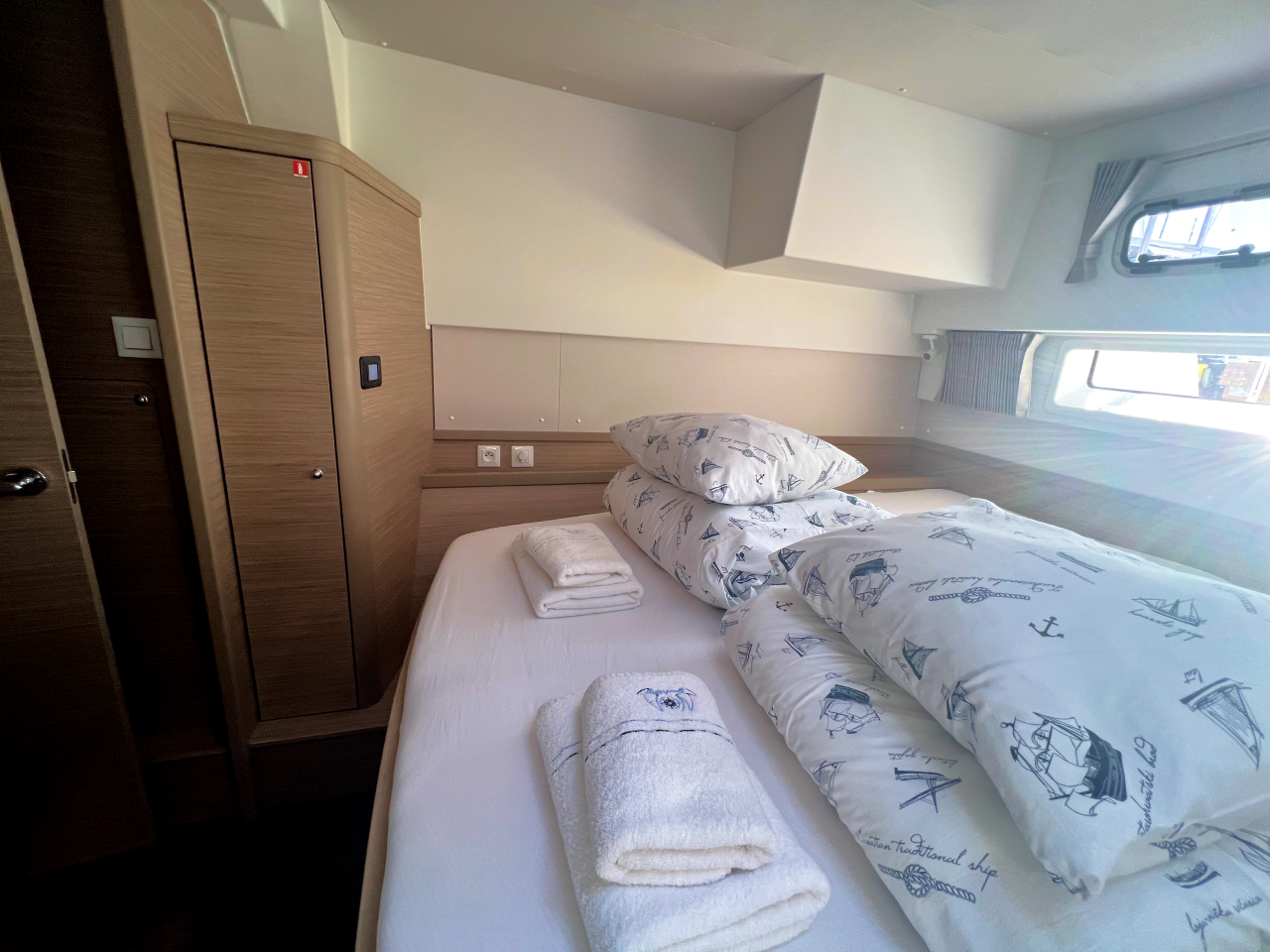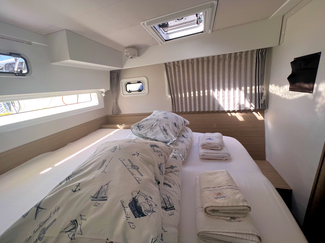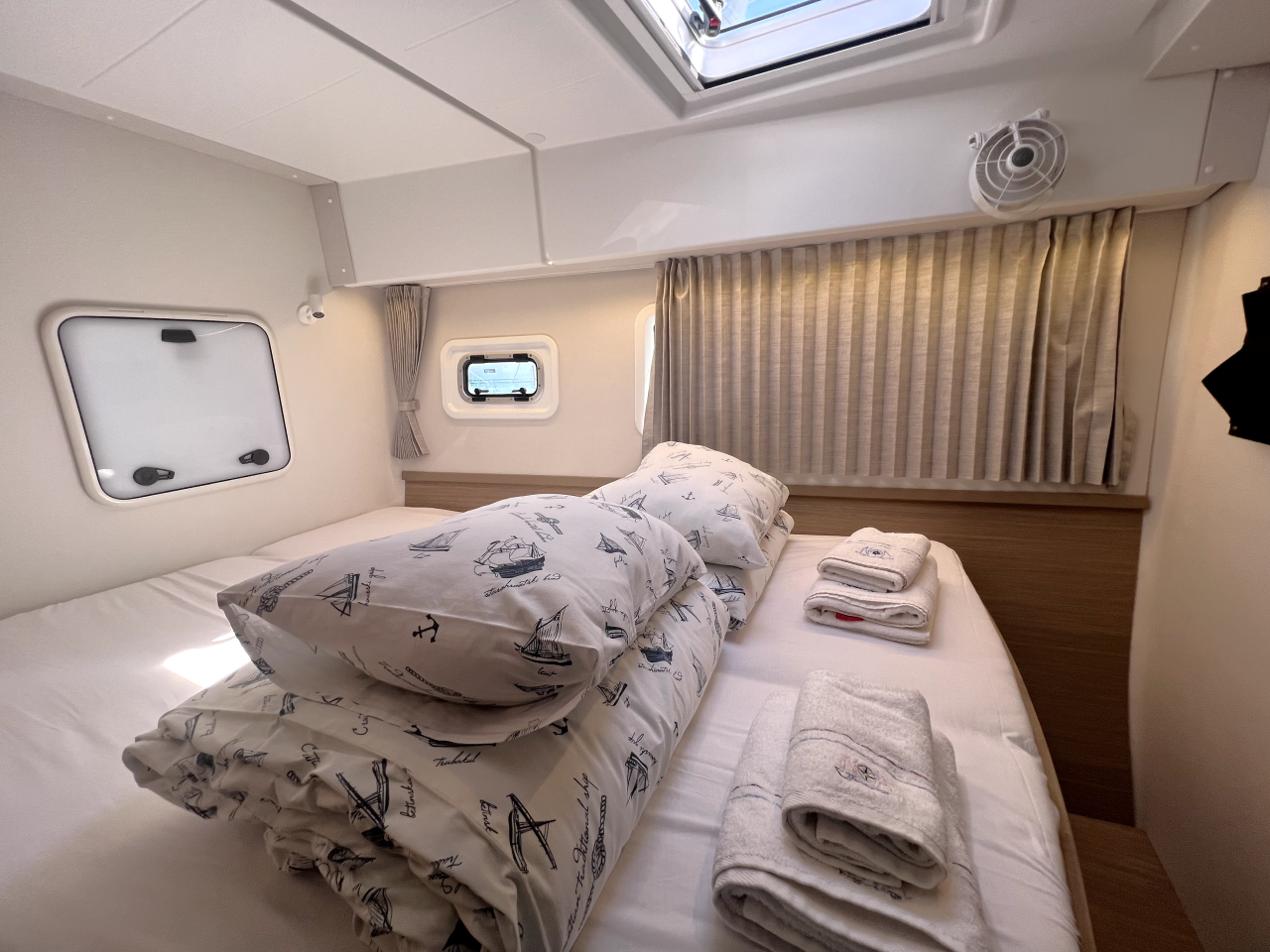 | Inside | Frischwasserpumpe, Gefrierschrank, Generator, Inverter 12V/220V, Kaffeemaschine, Klimaanlage (ohne Landstrombedarf), Ladegerät, Lautsprecher im Salon, Pantryausstattung, Radio mit Bluetooth, USB Steckdosen in den Kabinen, Ventilatoren in Salon und Kabinen, Watermaker, WC (elektr.) |