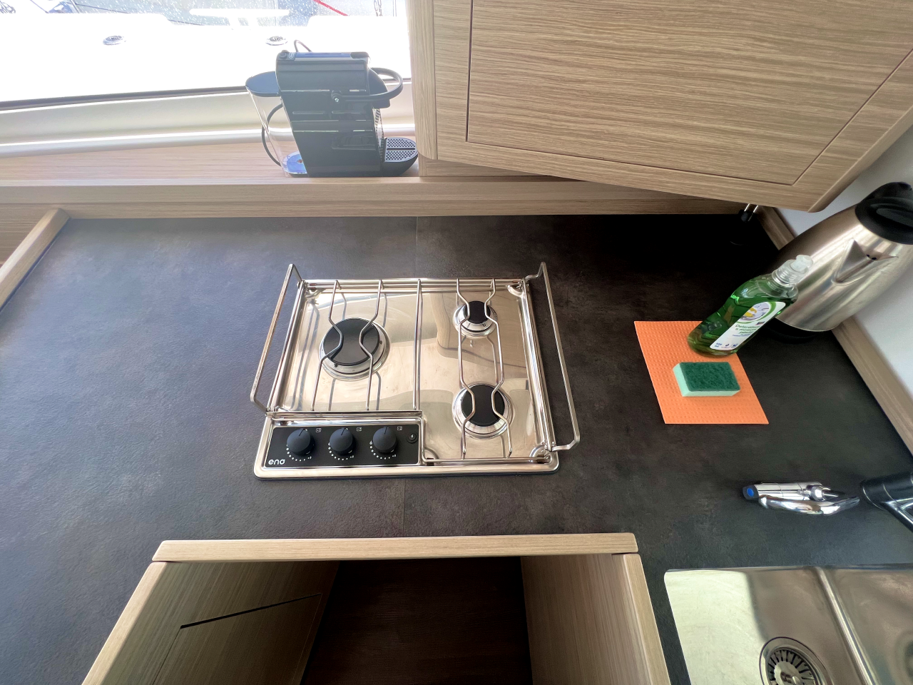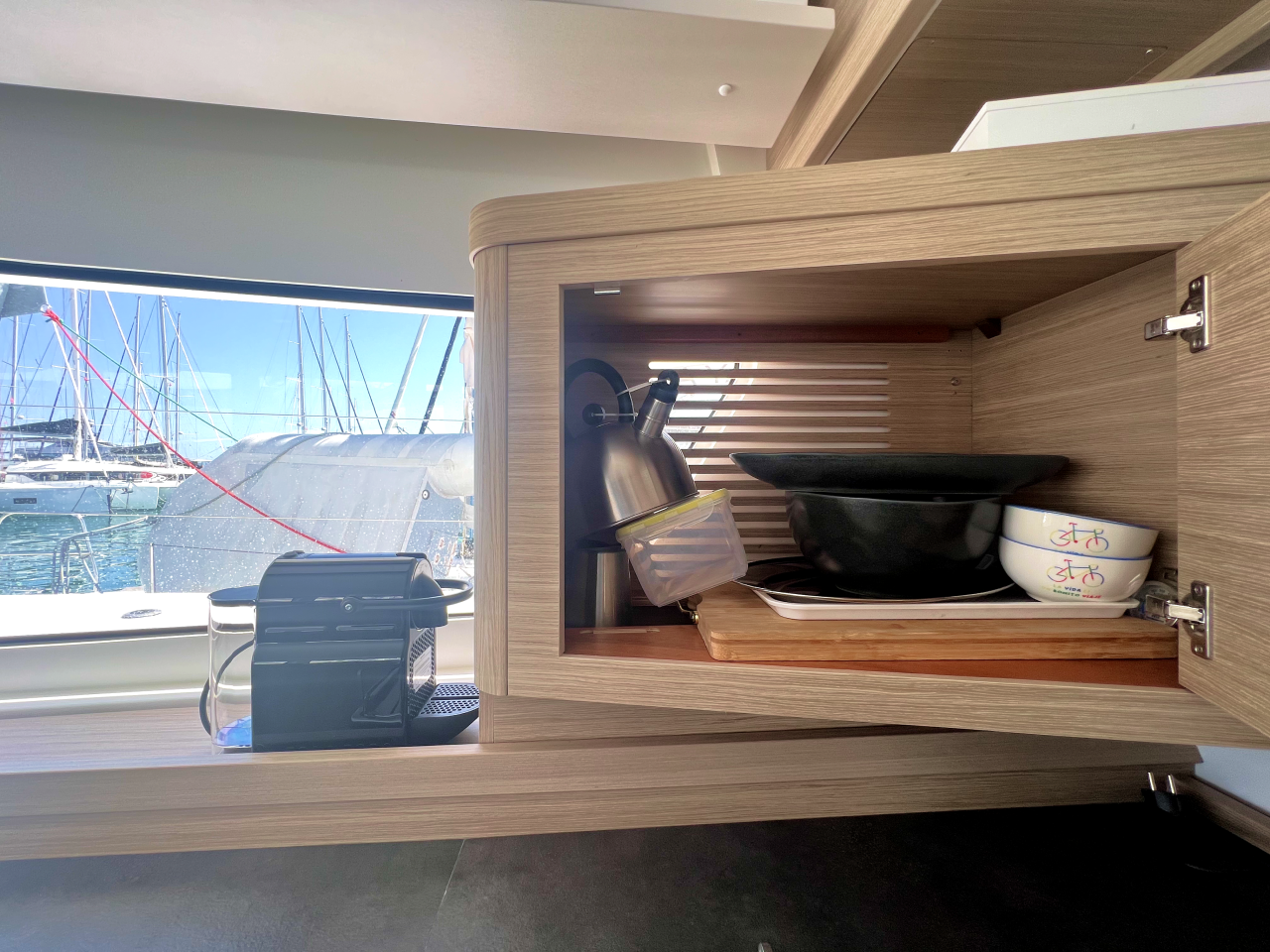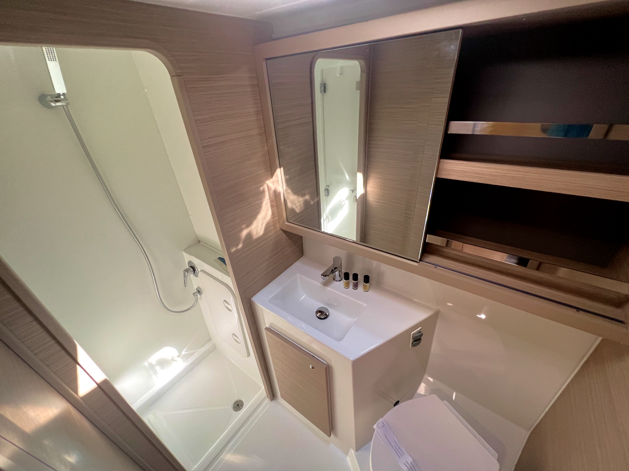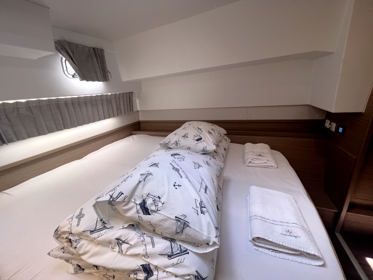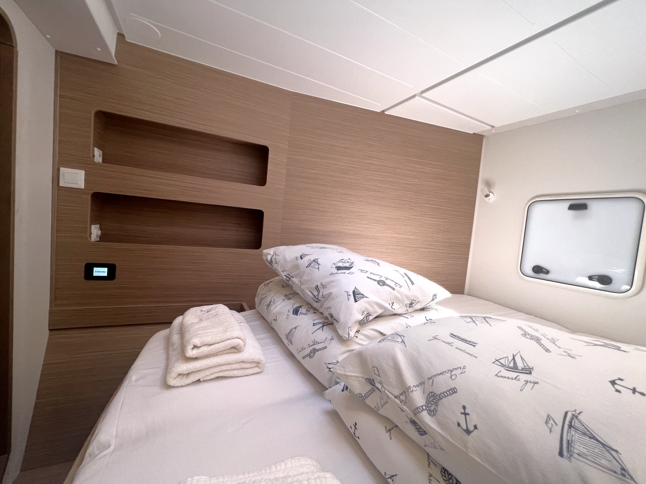| Inside | Frischwasserpumpe, Gefrierschrank, Generator, Inverter 12V/220V, Kaffeemaschine, Klimaanlage (ohne Landstrombedarf), Ladegerät, Lautsprecher im Salon, Pantryausstattung, Radio mit Bluetooth, USB Steckdosen in den Kabinen, Ventilatoren in Salon und Kabinen, Watermaker, WC (elektr.) |