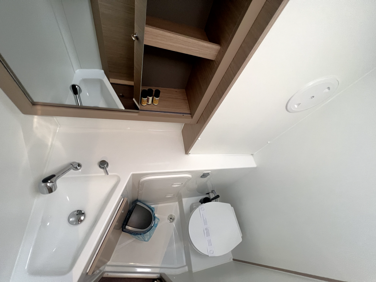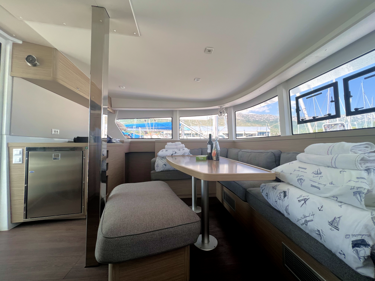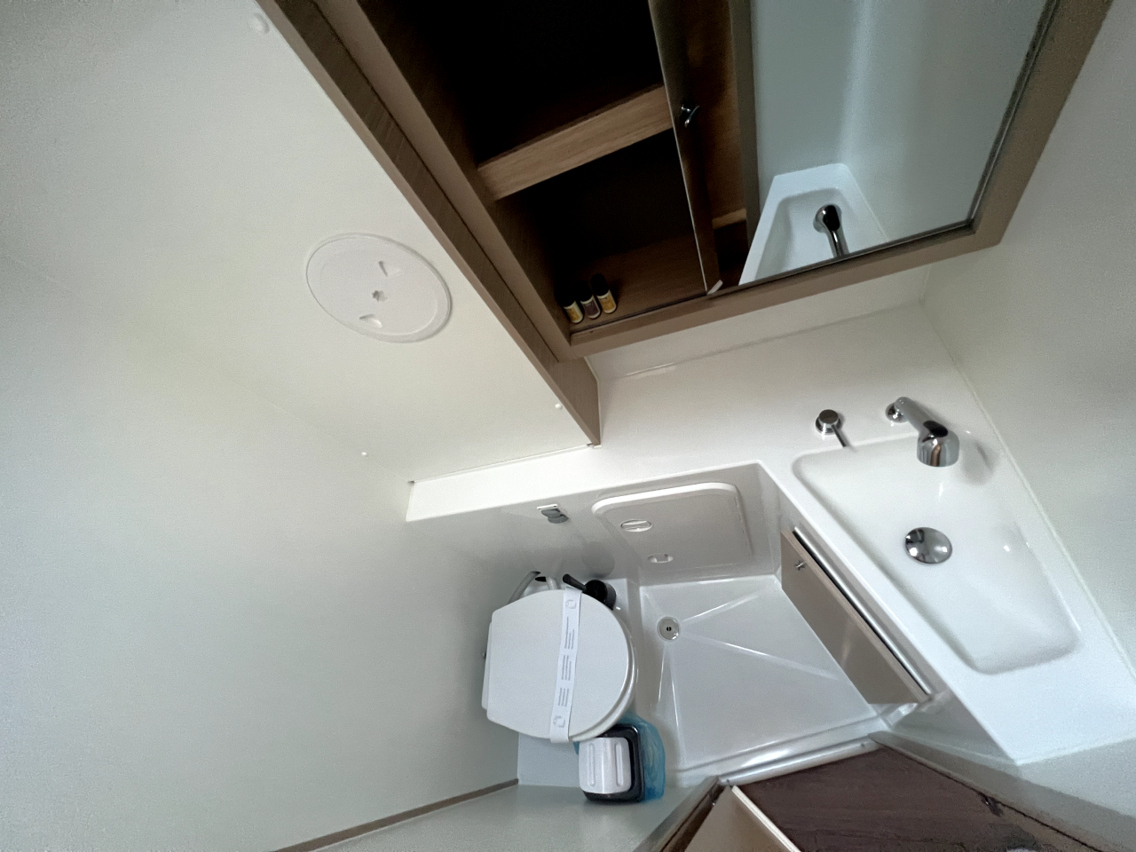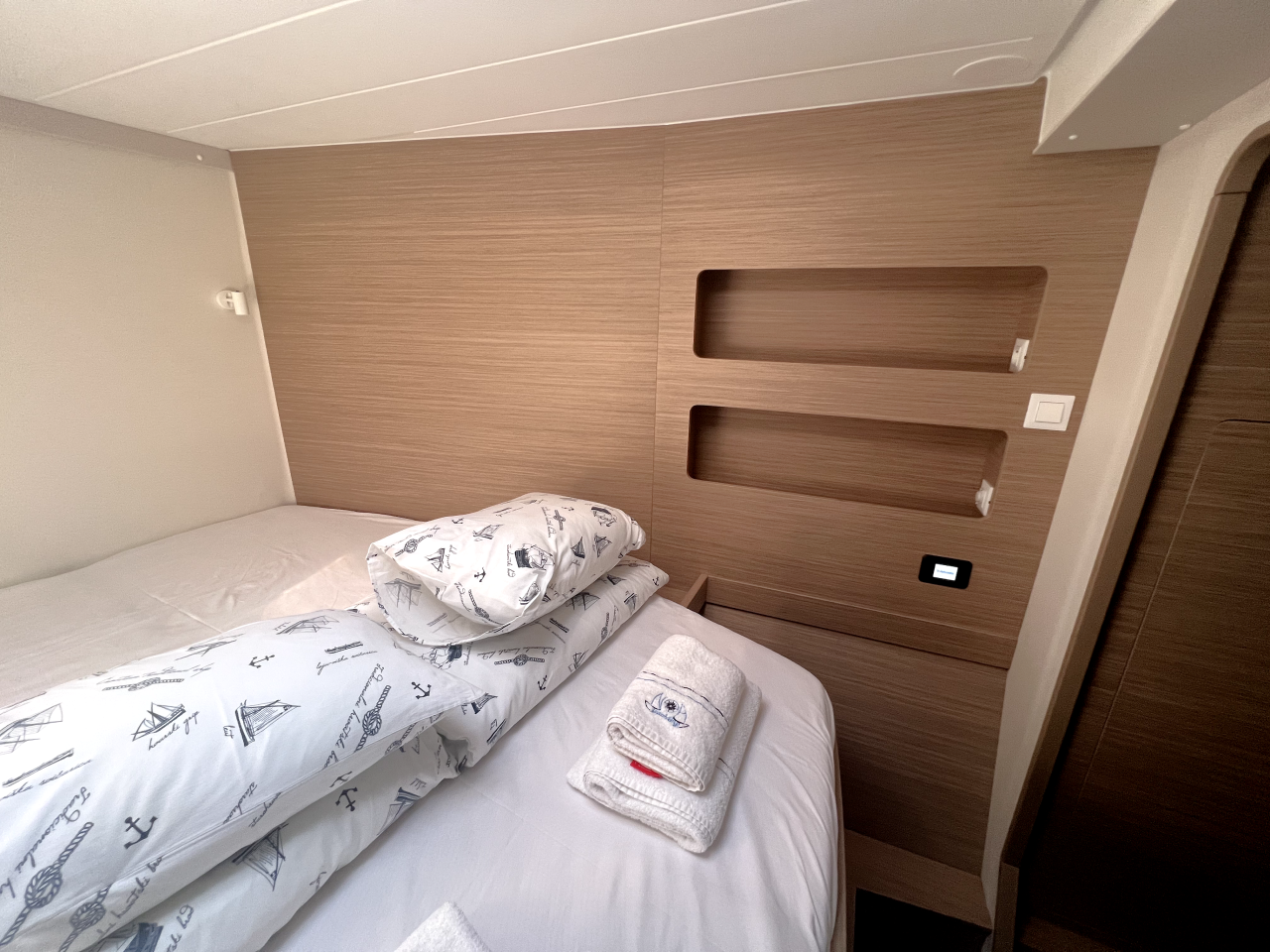 | Inside | Frischwasserpumpe, Gefrierschrank, Generator, Inverter 12V/220V, Kaffeemaschine, Klimaanlage (ohne Landstrombedarf), Ladegerät, Lautsprecher im Salon, Pantryausstattung, Radio mit Bluetooth, USB Steckdosen in den Kabinen, Ventilatoren in Salon und Kabinen, Watermaker, WC (elektr.) |