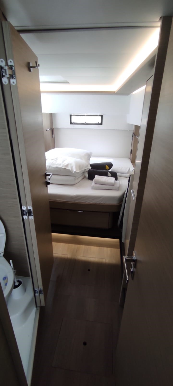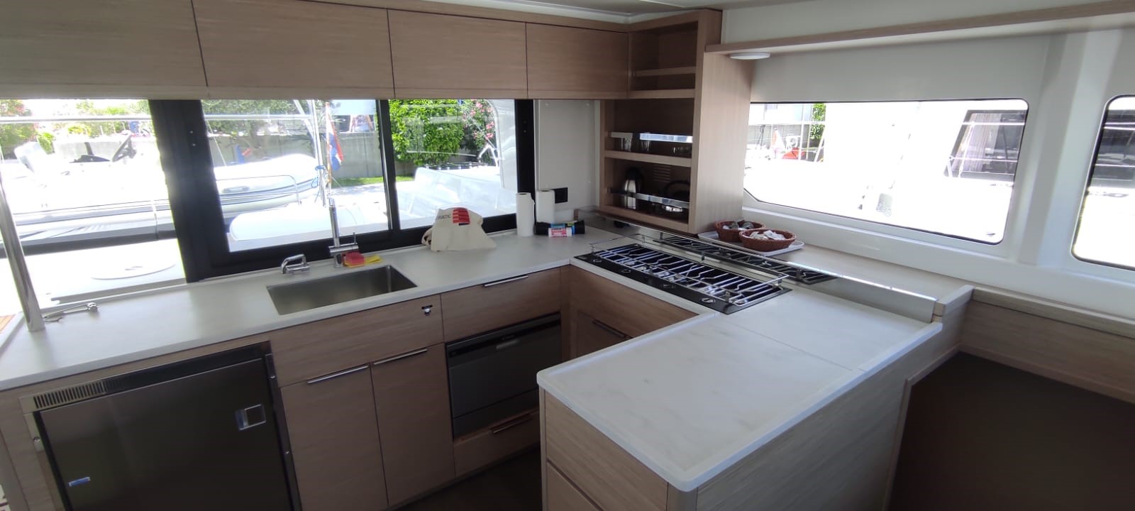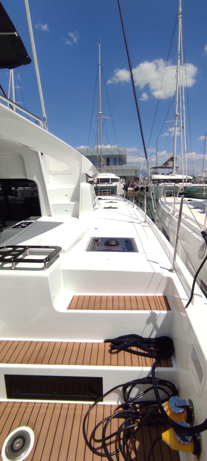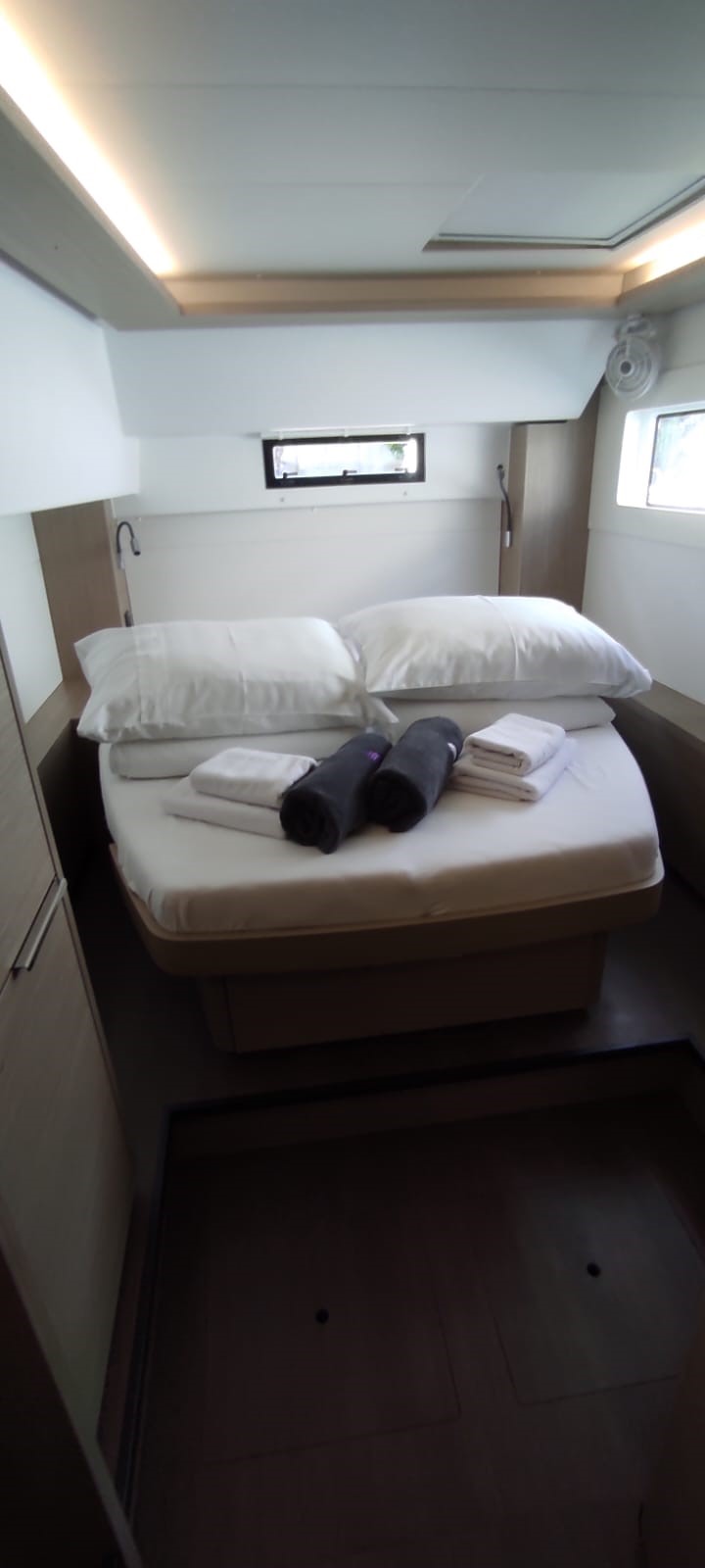| Inside | 220V Steckdosen, Bluetooth Player, Eiswürfelmaschine, Gasherd, Gefrierschrank, Generator, Geschirrspüler, Inverter 12V/220V, Kaffeemaschine, Klimaanlage (Landstrom), Kühlschrank, Ladegerät, Pantryausstattung, Radio, Salontisch absenkbar, Ventilatoren in Salon und Kabinen, Watermaker |