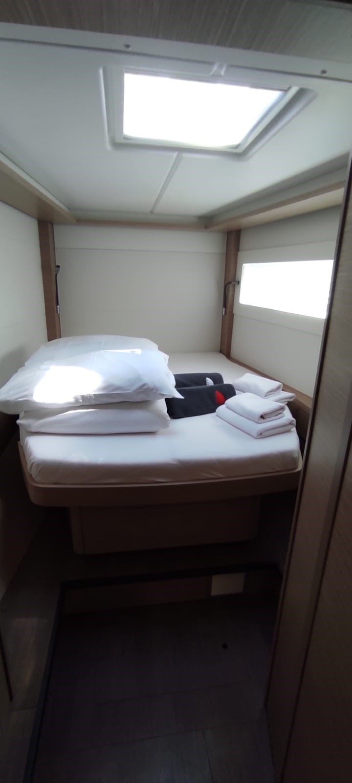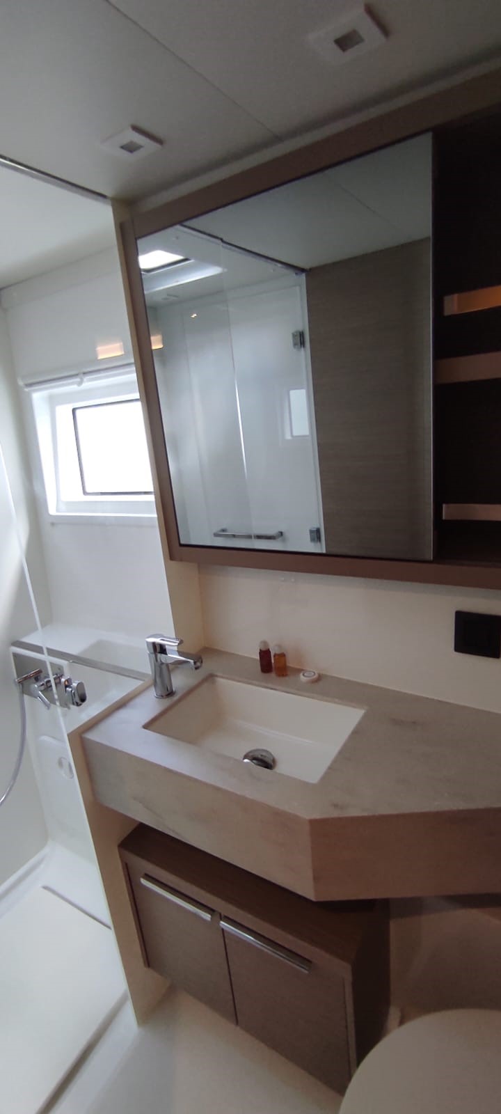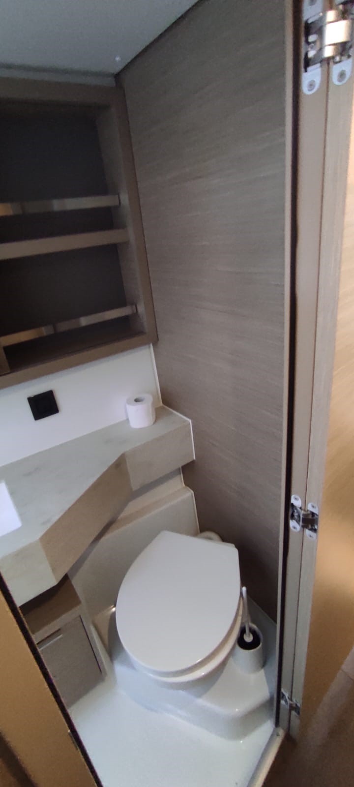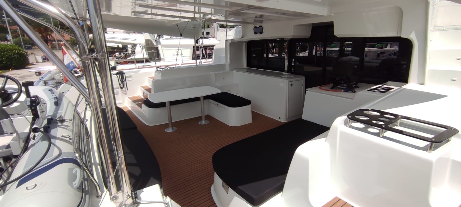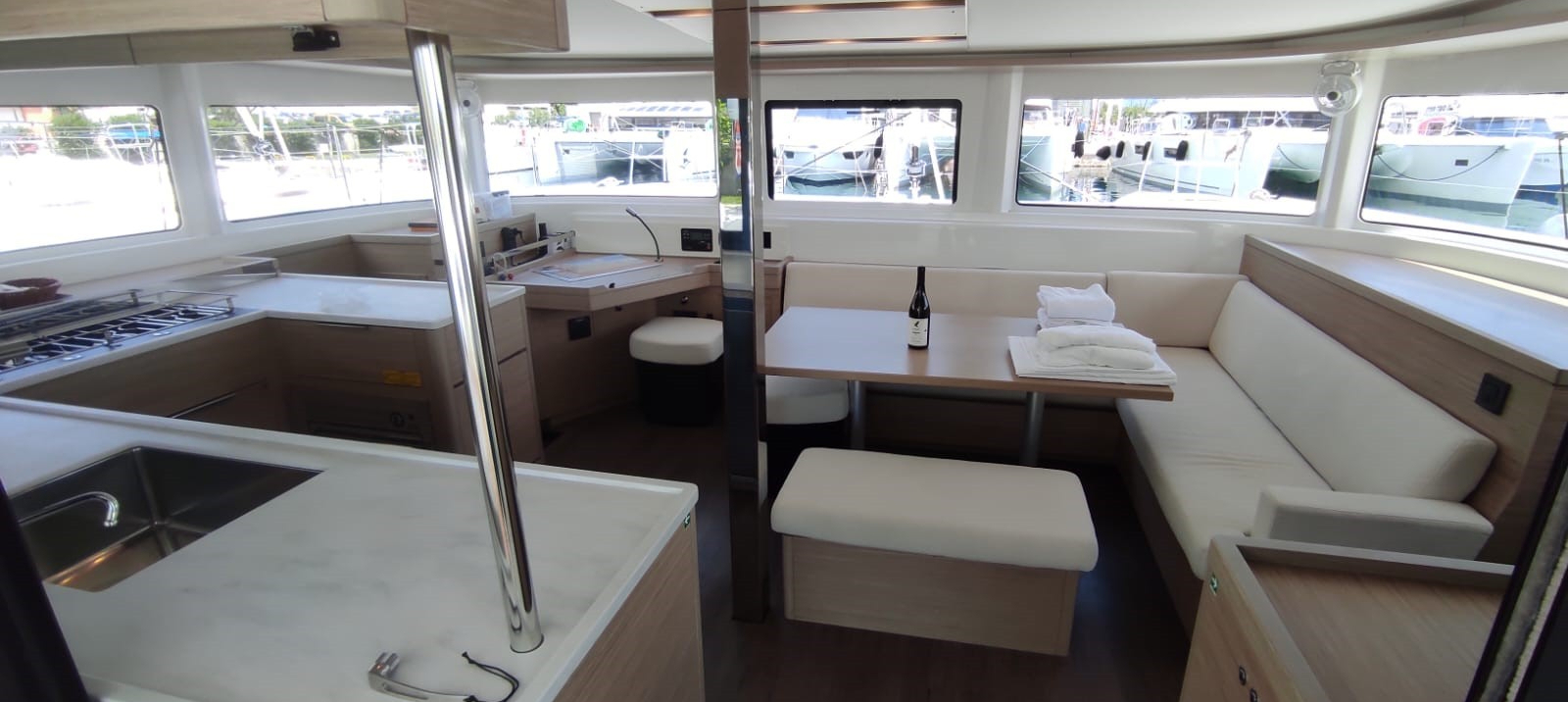 | Inside | 220V Steckdosen, Bluetooth Player, Eiswürfelmaschine, Gasherd, Gefrierschrank, Generator, Geschirrspüler, Inverter 12V/220V, Kaffeemaschine, Klimaanlage (Landstrom), Kühlschrank, Ladegerät, Pantryausstattung, Radio, Salontisch absenkbar, Ventilatoren in Salon und Kabinen, Watermaker |