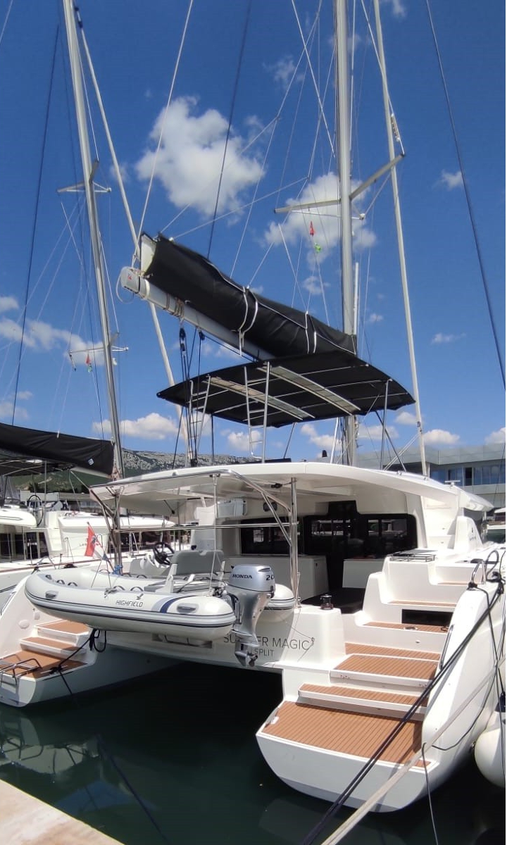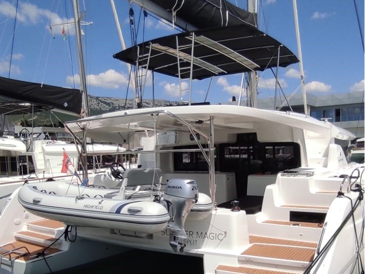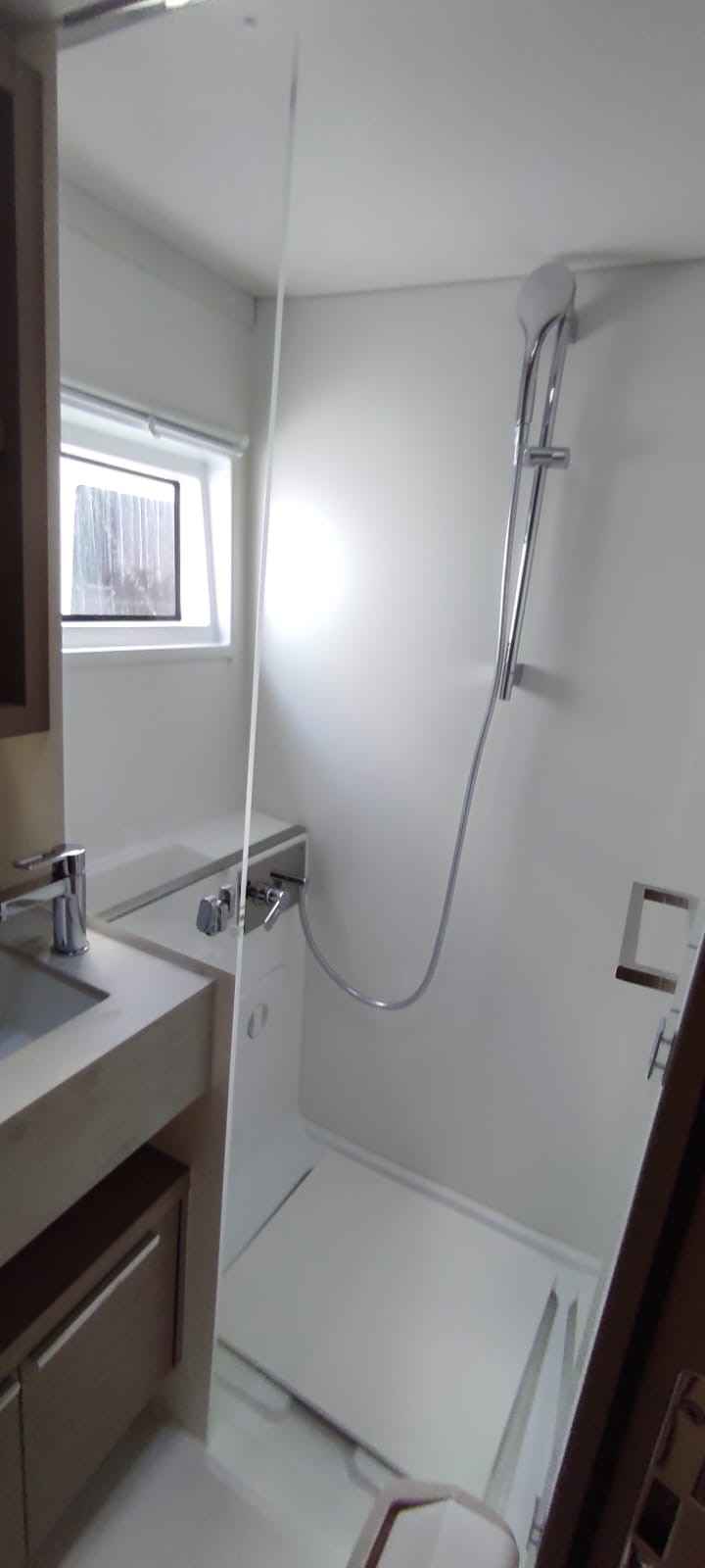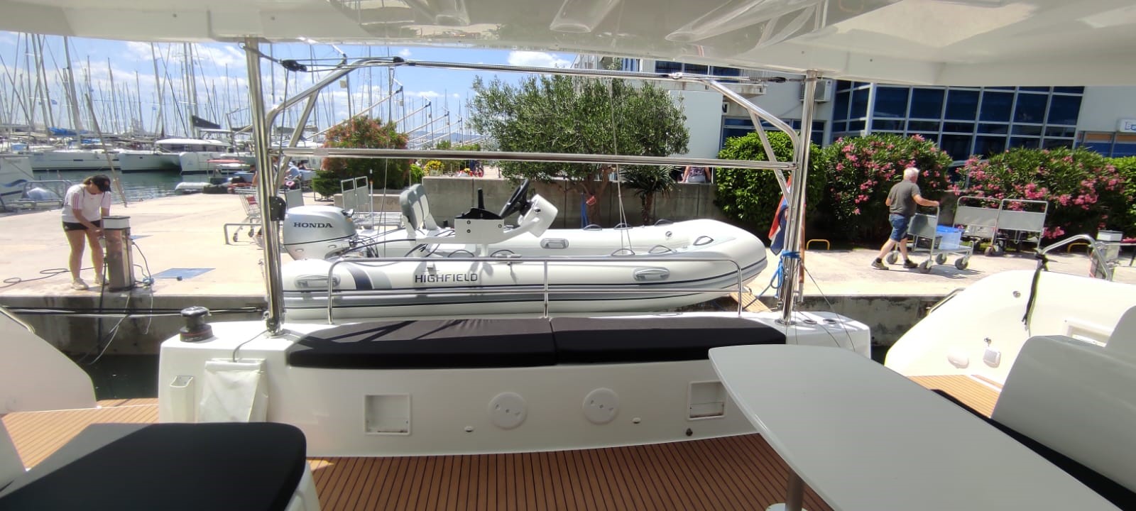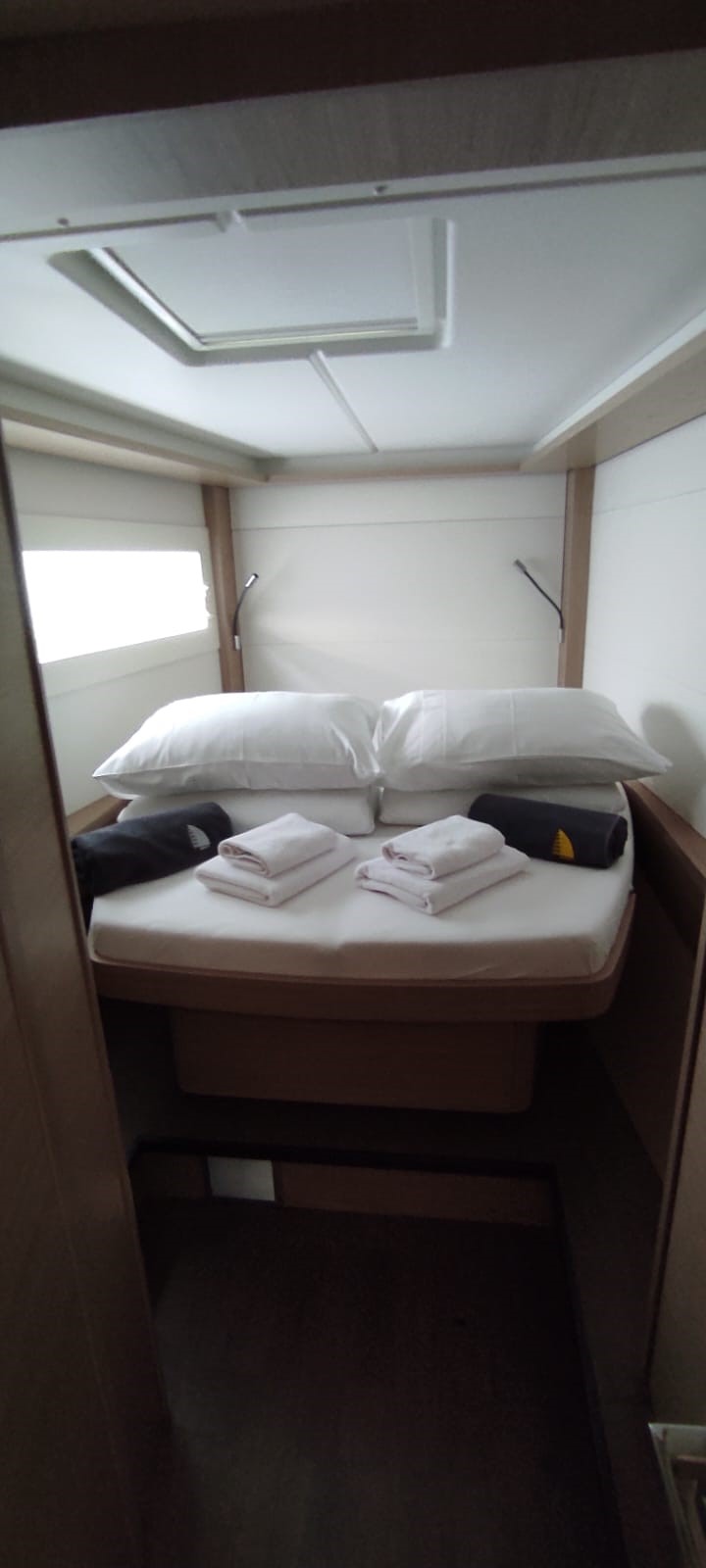 | Inside | 220V Steckdosen, Bluetooth Player, Eiswürfelmaschine, Gasherd, Gefrierschrank, Generator, Geschirrspüler, Inverter 12V/220V, Kaffeemaschine, Klimaanlage (Landstrom), Kühlschrank, Ladegerät, Pantryausstattung, Radio, Salontisch absenkbar, Ventilatoren in Salon und Kabinen, Watermaker |