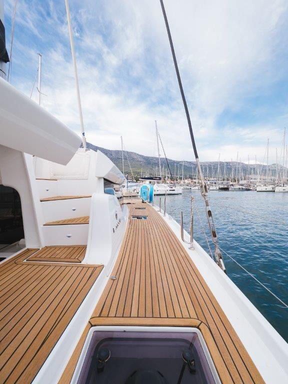 | Outside | Biminitop, Cockpitpolster, Deckpolster, Faltpropeller, Fernsteuerung für elektr. Ankerwinsch, Teak im Cockpit, Winschen |