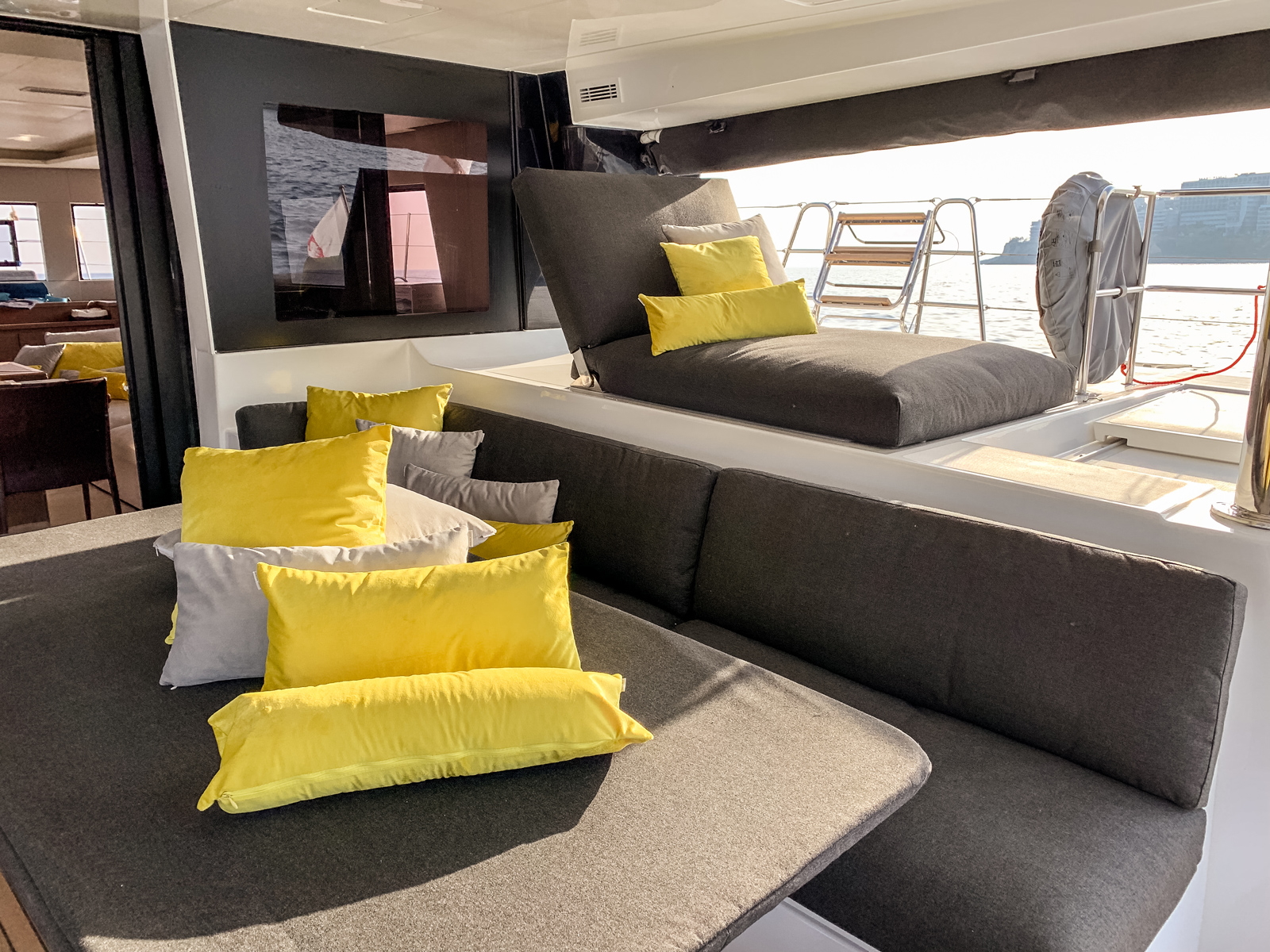 | Outside | Angelausrüstung, Badeplattform (hydr.), Biminitop, Cockpitlautsprecher, Cockpitpolster, Deckpolster, Fernsteuerung für elektr. Ankerwinsch, hydraul. Gangway, Schnorchelausrüstung, Teakdeck, Unterwasserbeleuchtung |