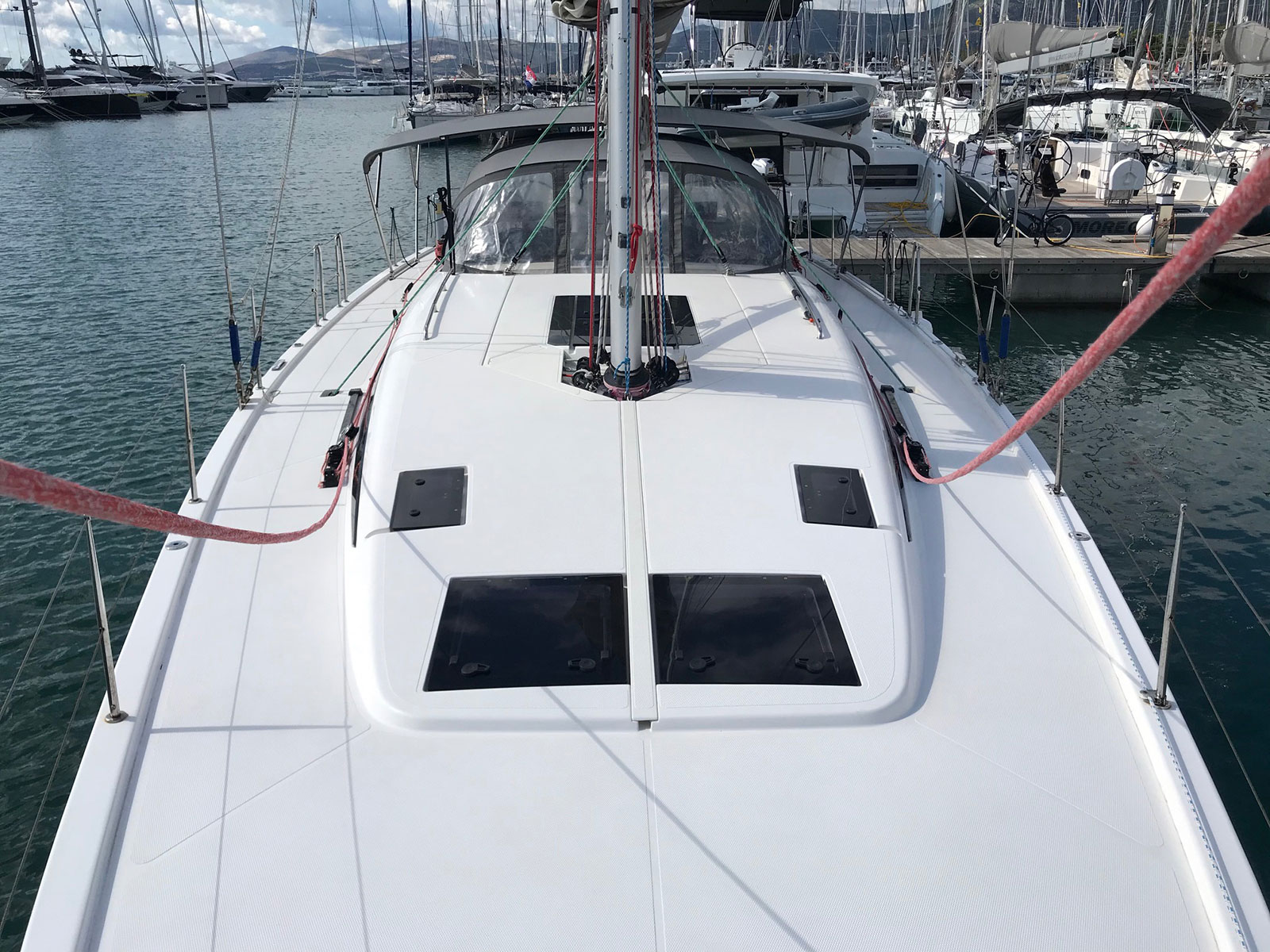 220 V-Landanschluss, Anker mit Kette, Badeplattform, Biminitop, Bootshaken, Cockpitdusche, Cockpitlautsprecher, Cockpitpolster, Cockpittisch (klappbar), Deckbürste, Dieselkanister , elektr. Ankerwinsch, Fender, Gangway, Kunststoff-Eimer (Pütz), Sprayhood, Teak im Cockpit, Treibanker, Wantenschneider, Wasserkanister , Wasserschlauch |